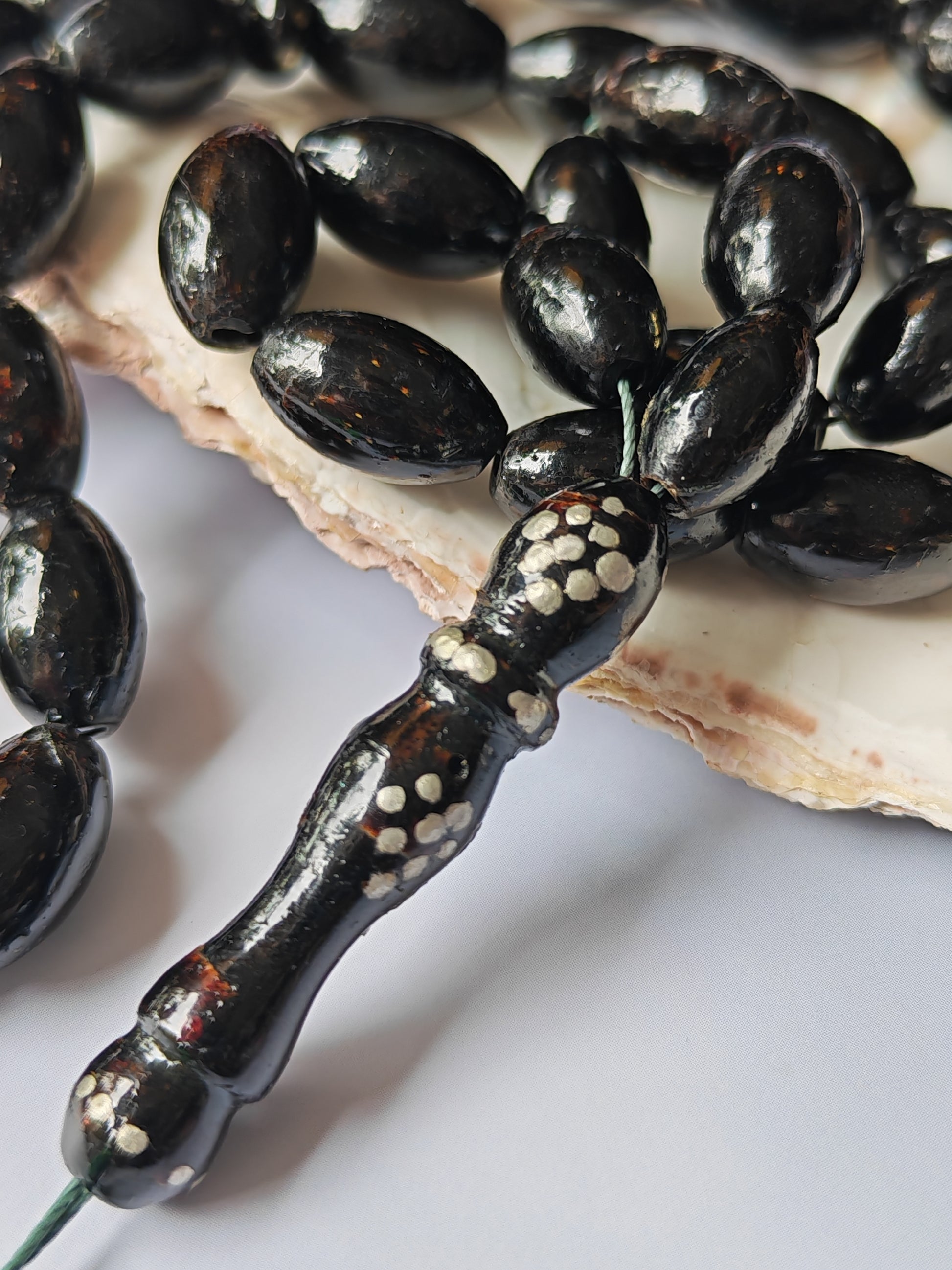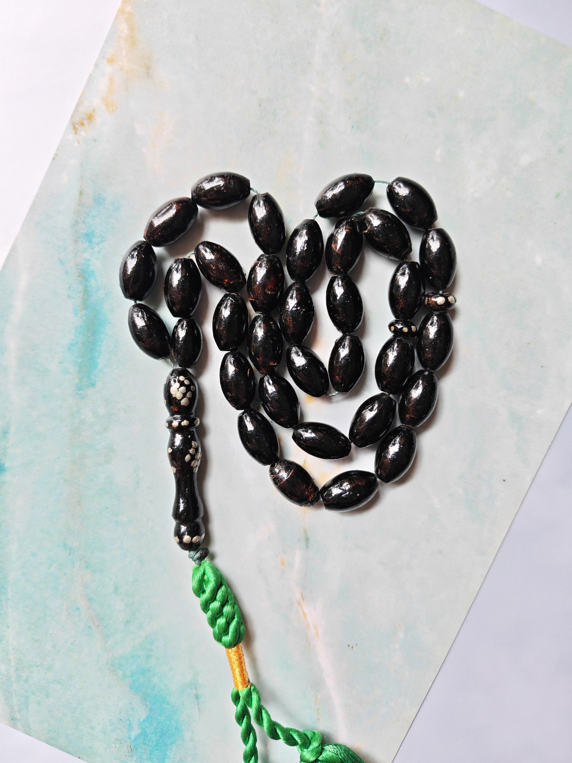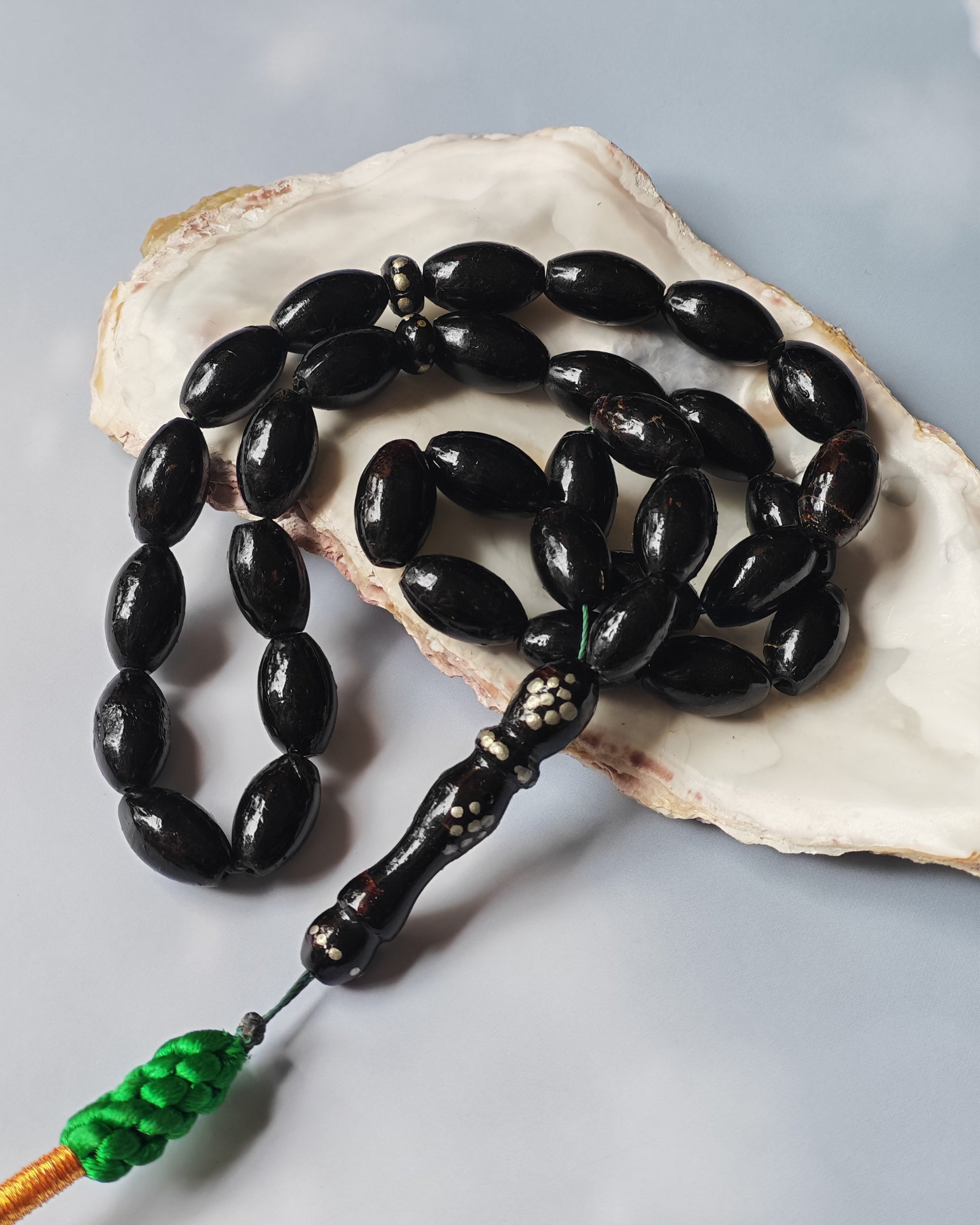 A refined 33-bead tasbih crafted from natural Black Coral sourced from the Red Sea, shaped into smooth olive-shaped beads for comfortable, everyday handling. The material’s natural imperfections are preserved, highlighting its organic origin and giving each bead its own subtle character.