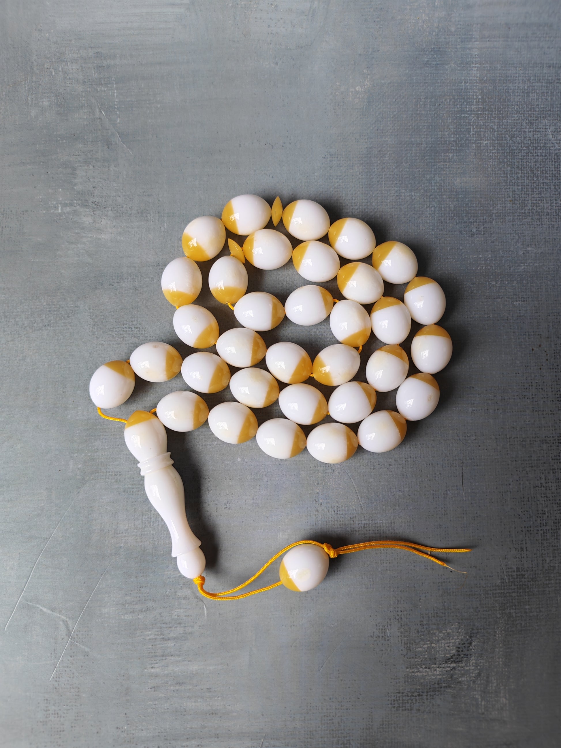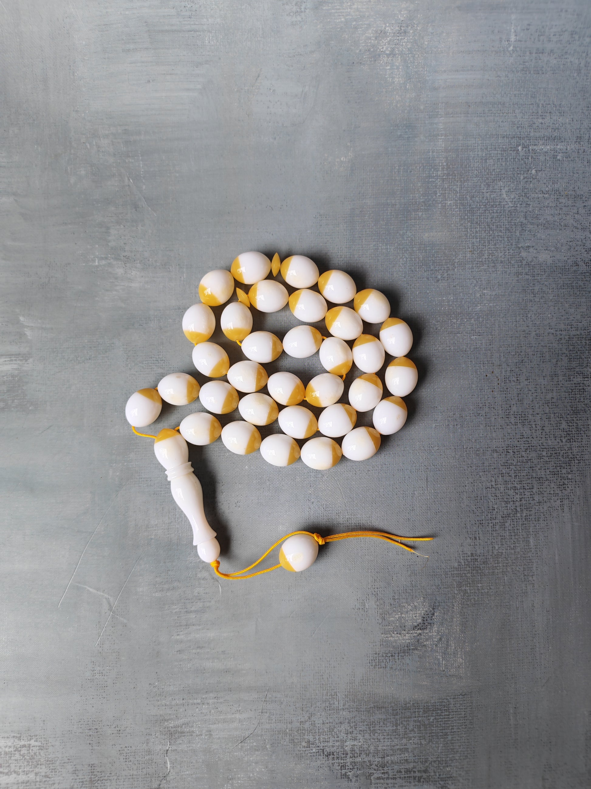 An intriguing 33-bead tasbih crafted from original mahjong domino pieces, blending vintage Bakelite and fine polyester for a unique tactile and visual balance. Each bead features a half-and-half pattern of luminous white and glittering yellow, echoing the charm of classic game craftsmanship transformed into elegant devotion. Smooth, durable, and beautifully weighted, Domino Harmony is perfect for daily use—a conversation piece that unites play, history, and artistry in one refined form.