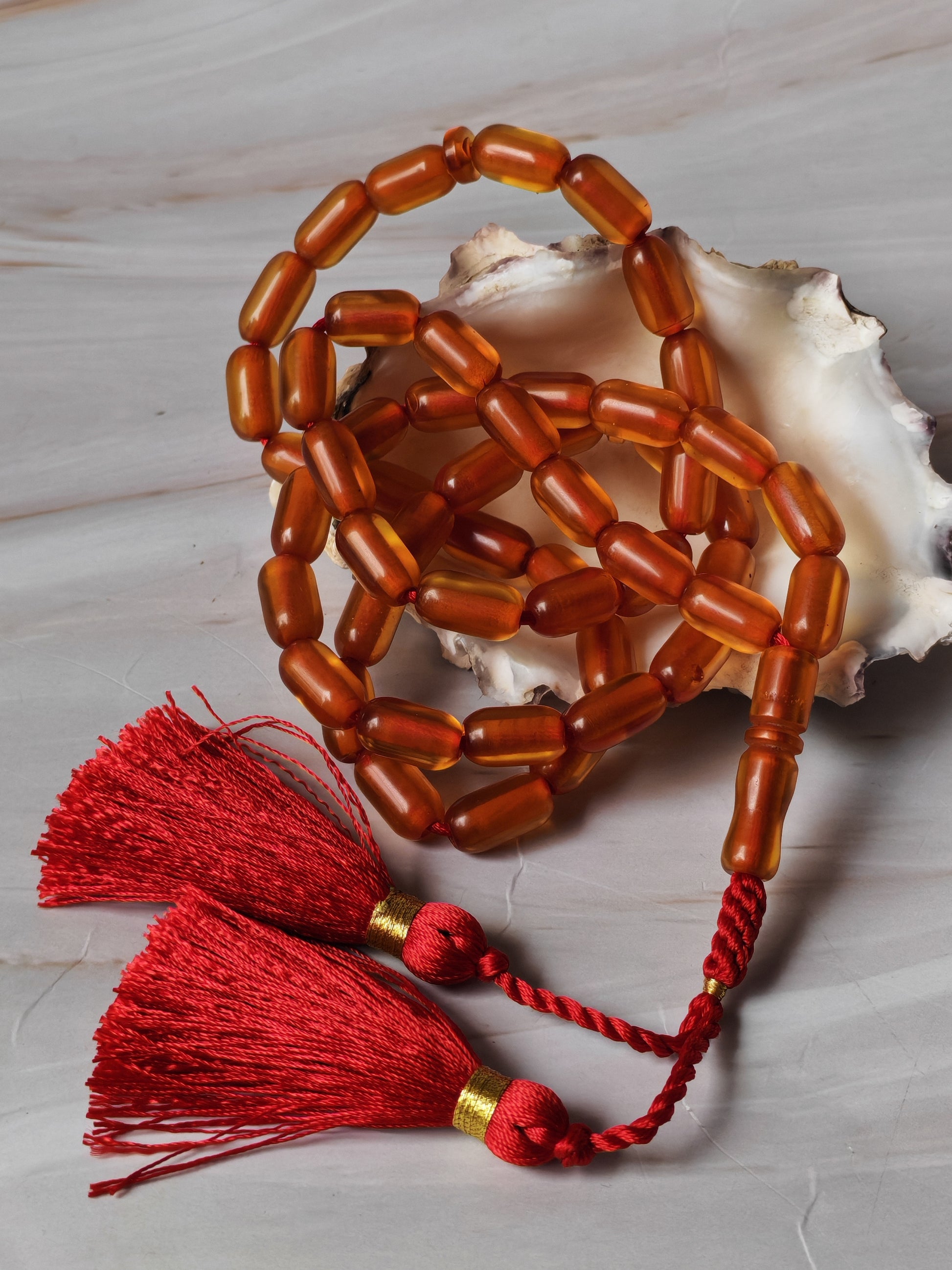A refined and beautifully crafted piece made from authentic German Bakelite, shaped and completed by the skilled hands of Najaf. This rosary features 51 elegant barrel-shaped beads, each displaying a warm cognac tone with remarkable transparency—allowing light to pass through and highlight the natural depth and character of the material.