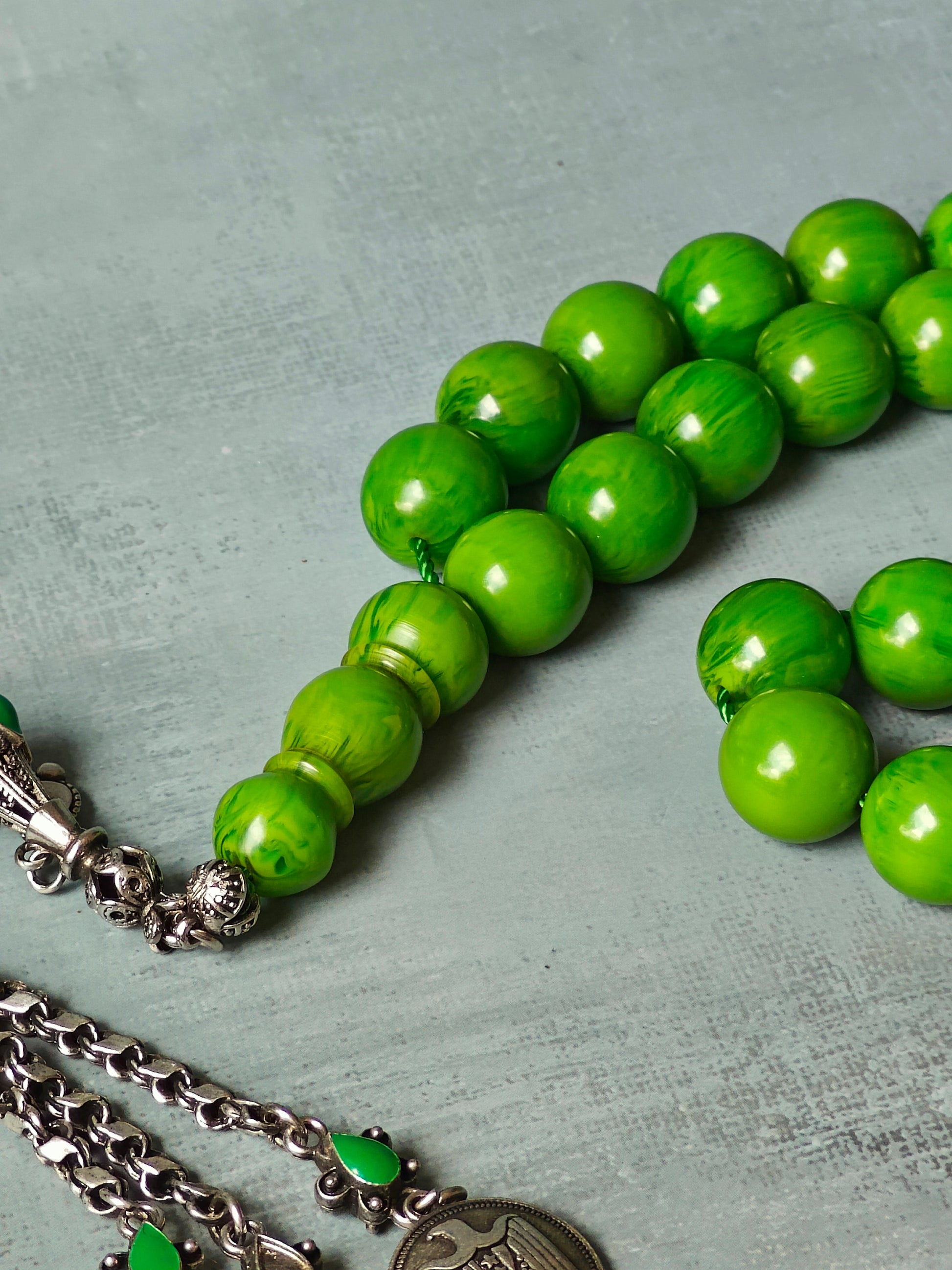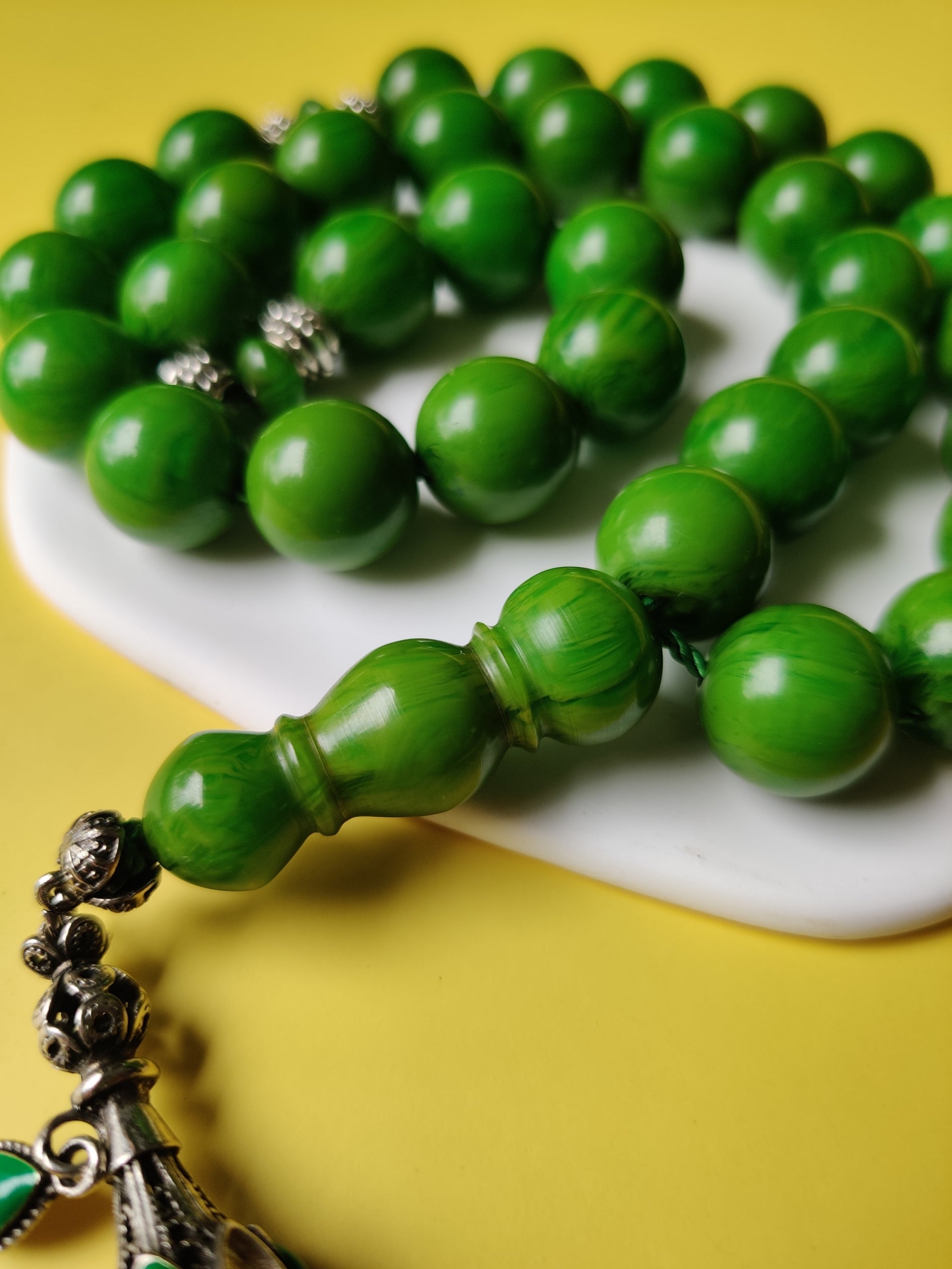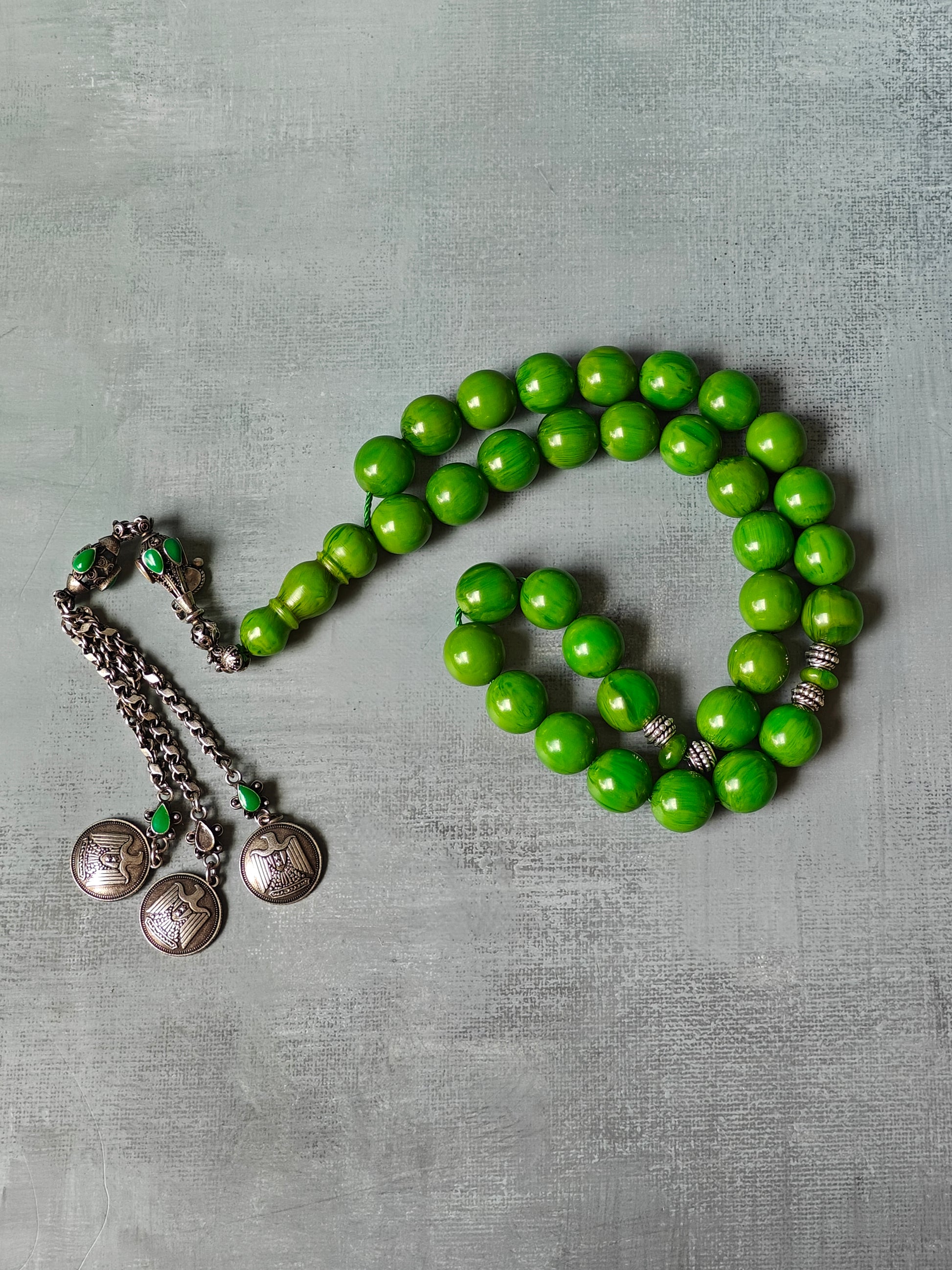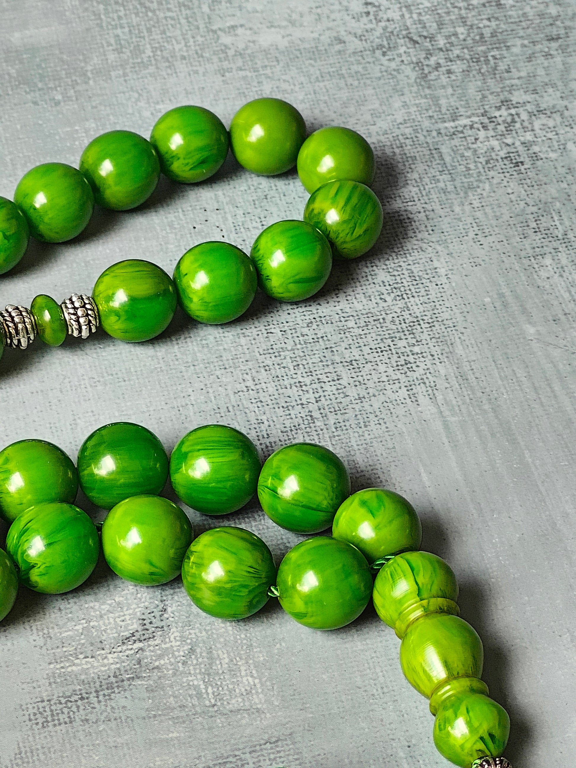 33 round beads, green with yellow veins, imami made of 3 beads. Originally a necklace.