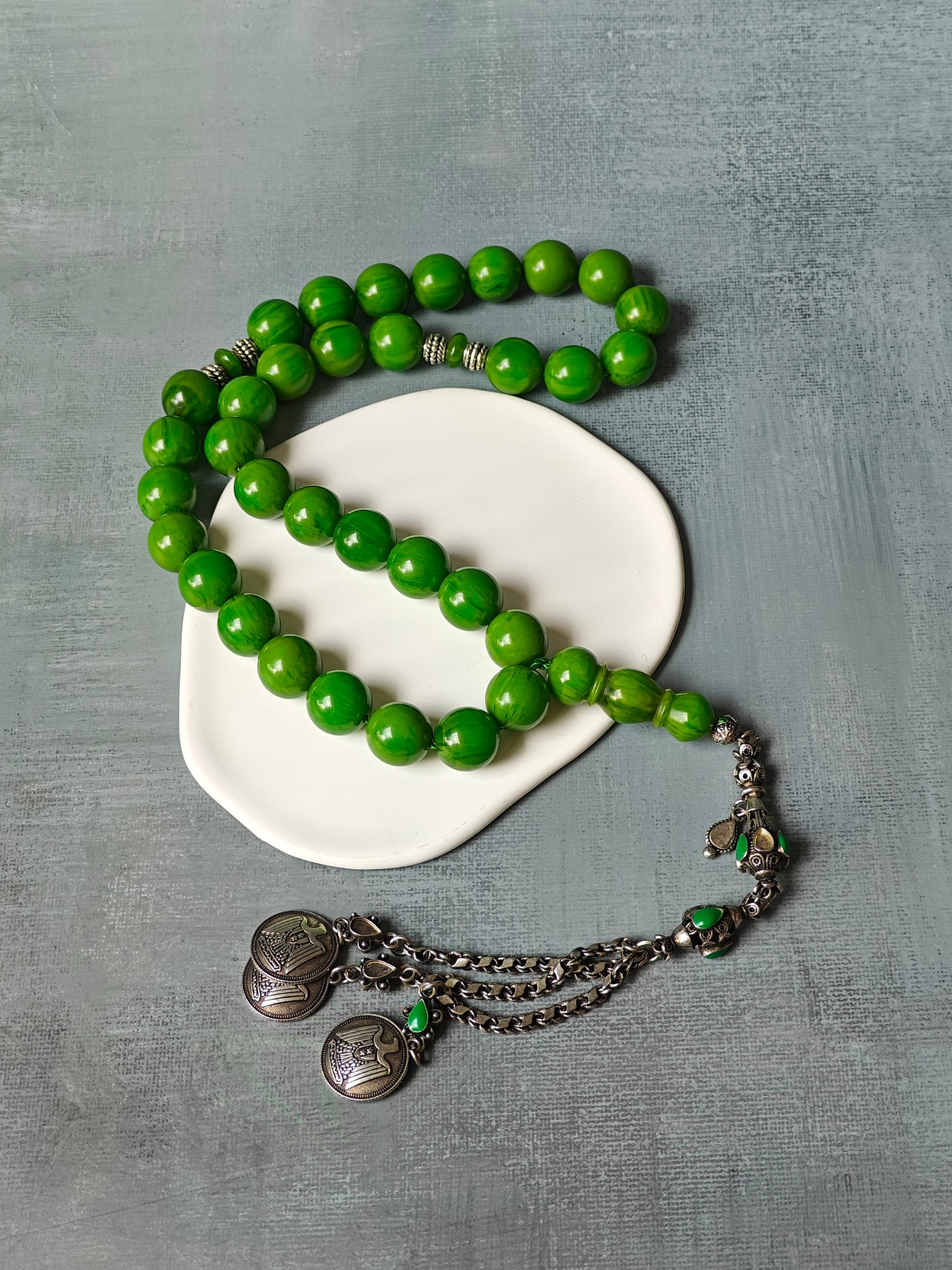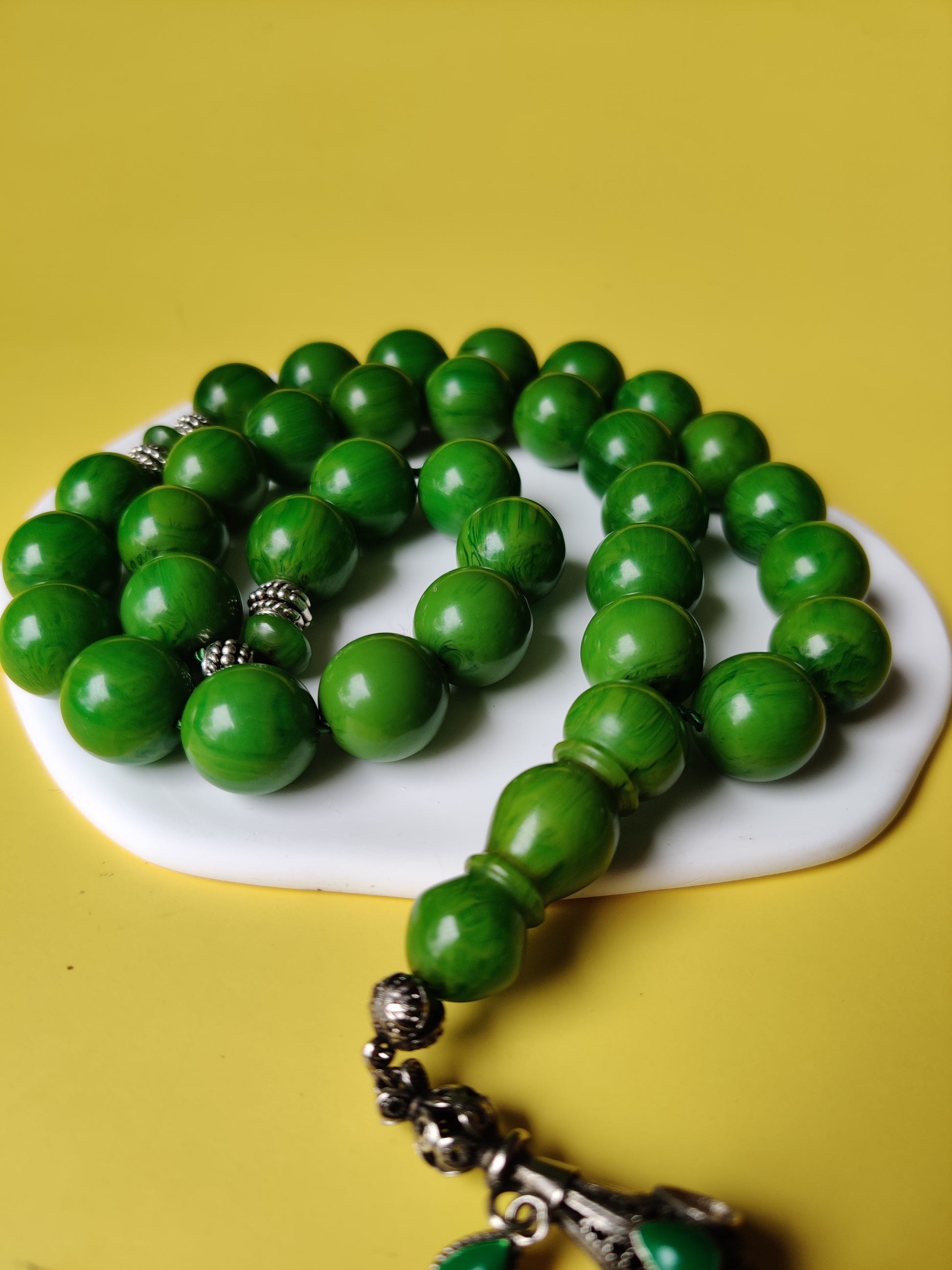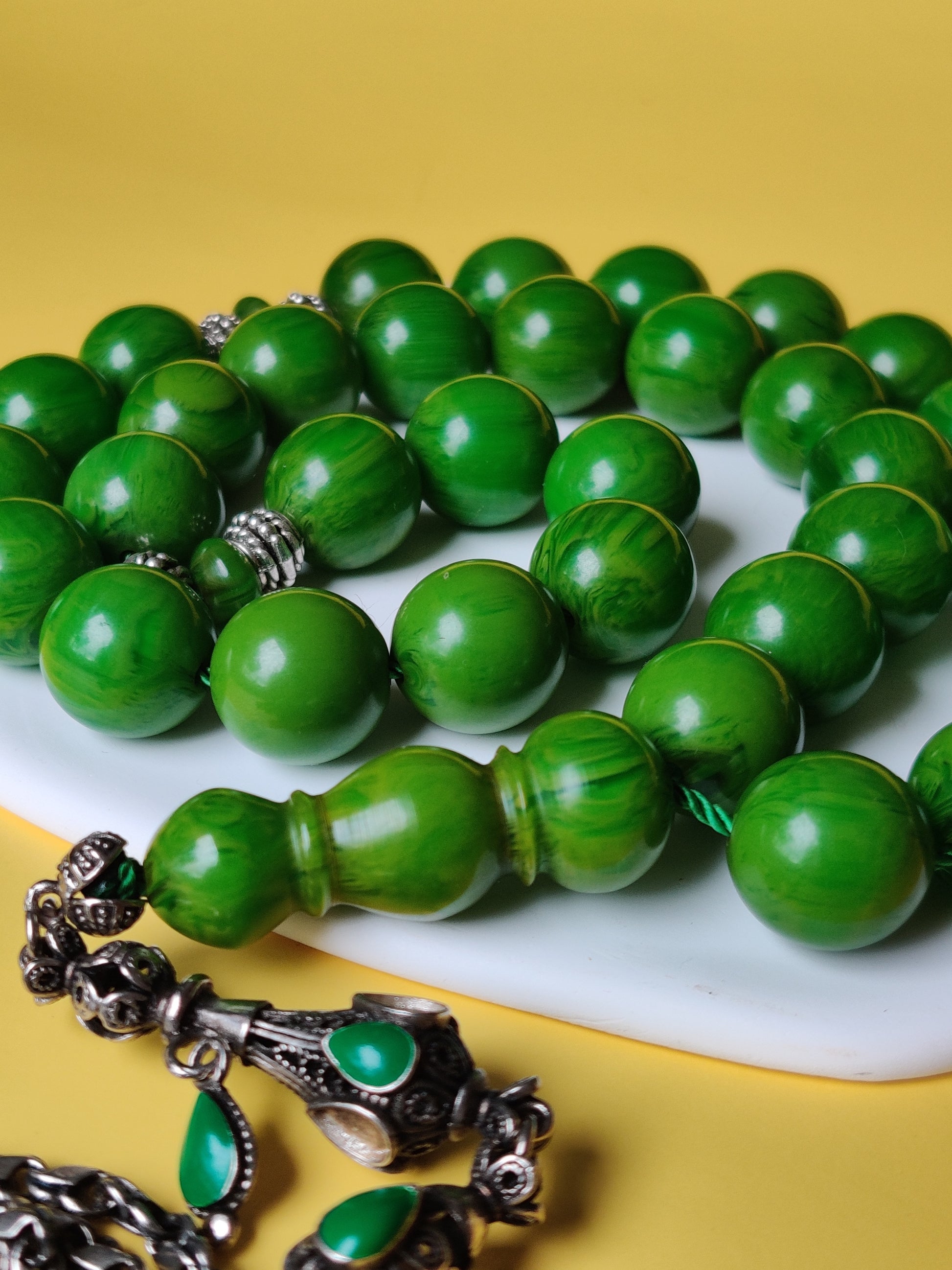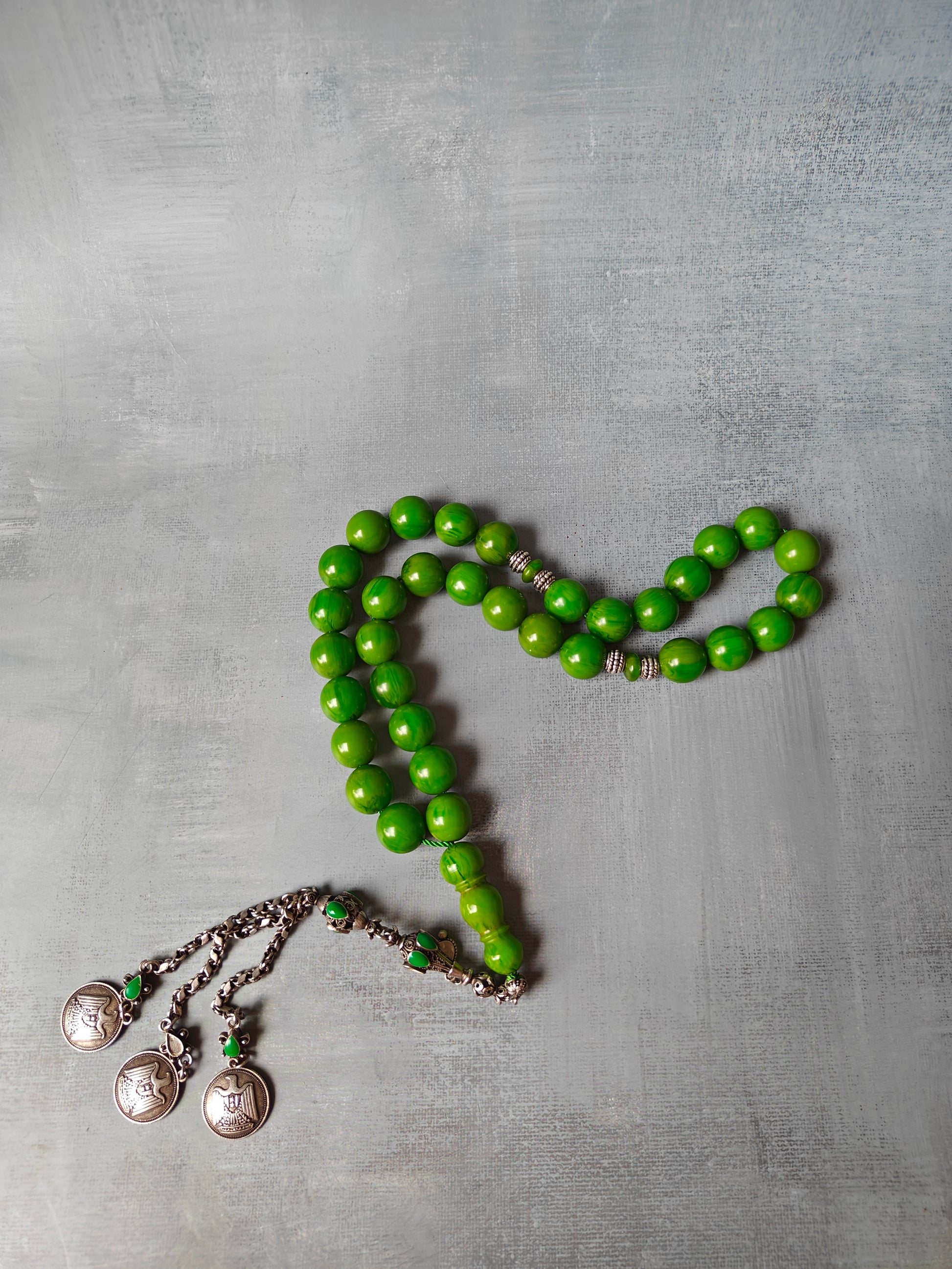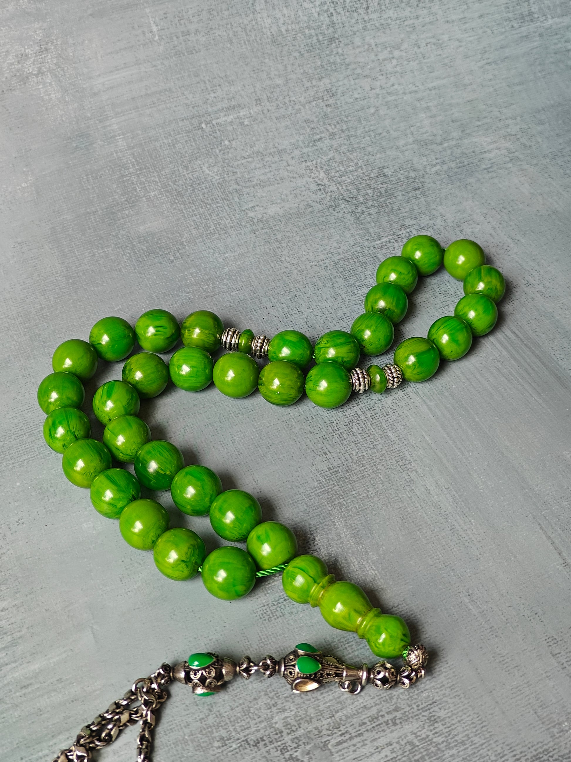 33 round beads, green with yellow veins, imami made of 3 beads. Originally a necklace.