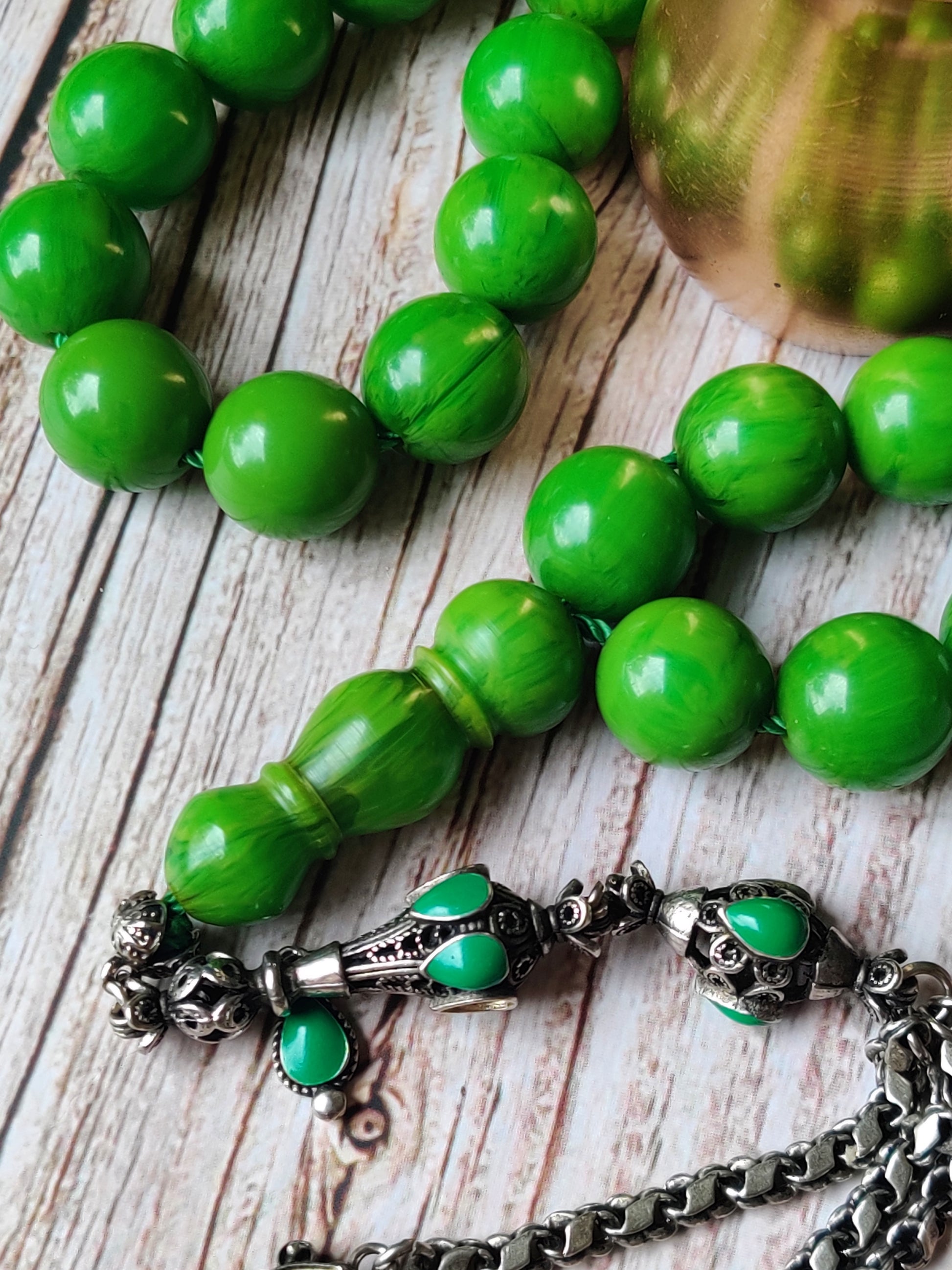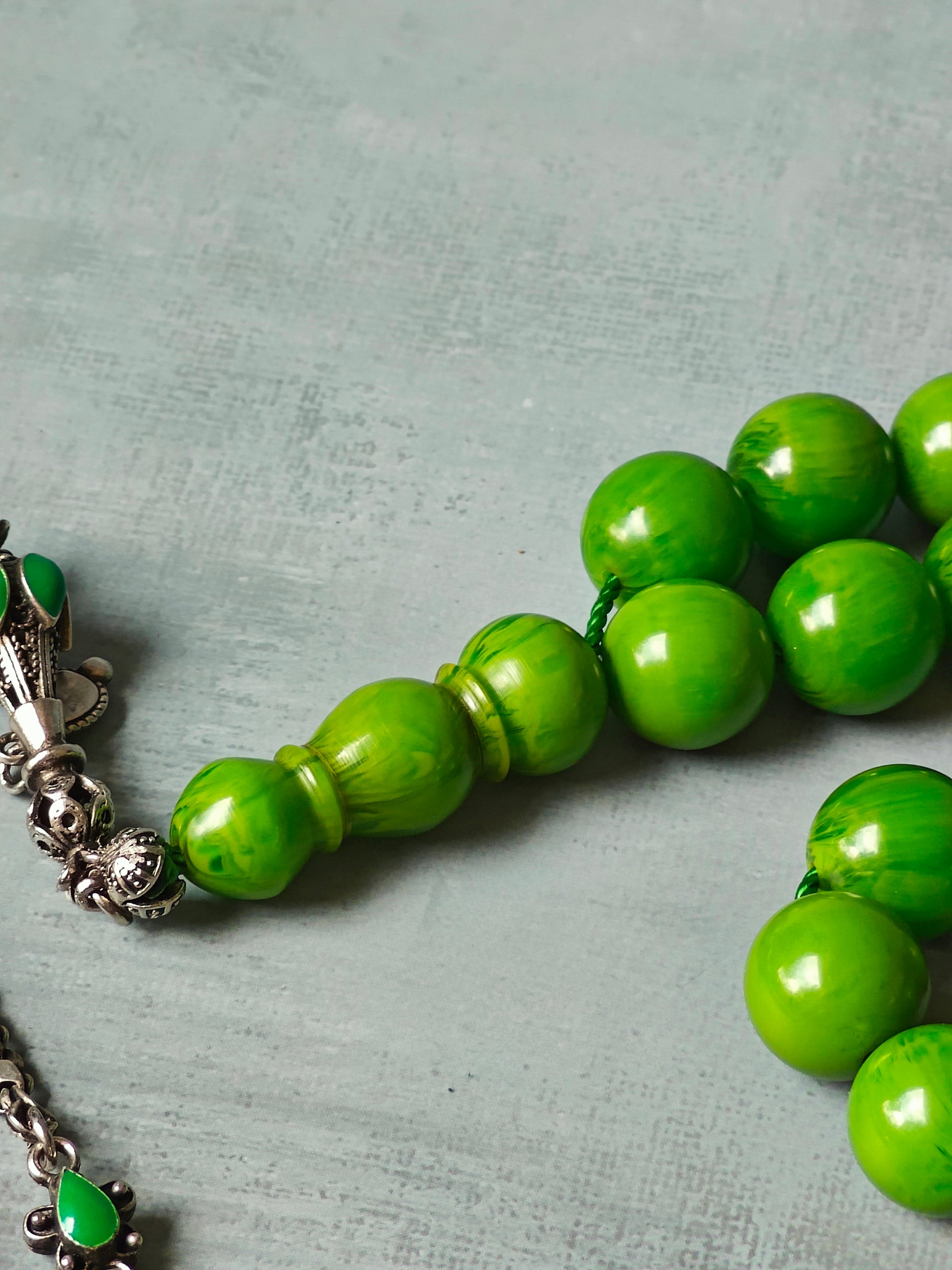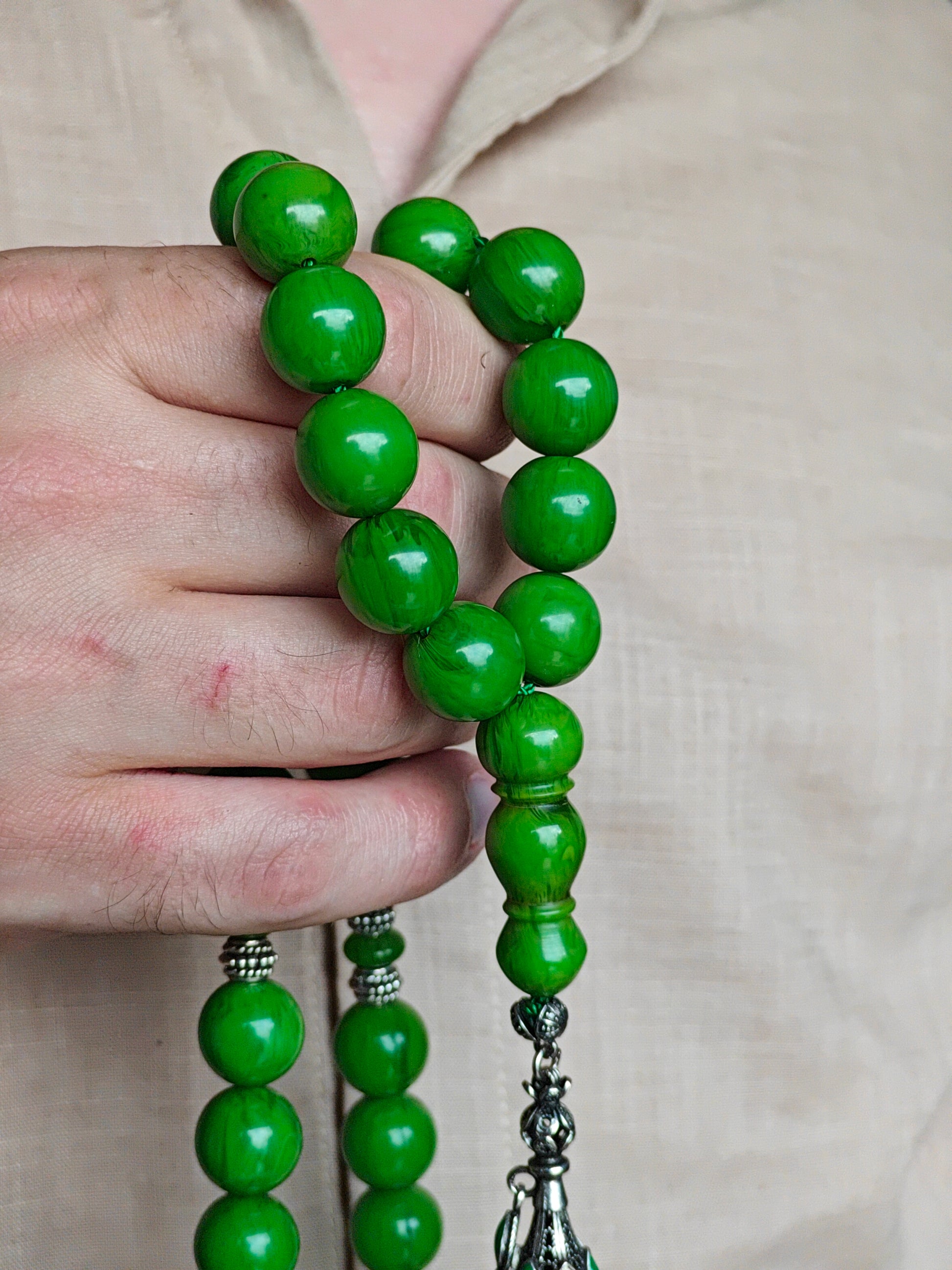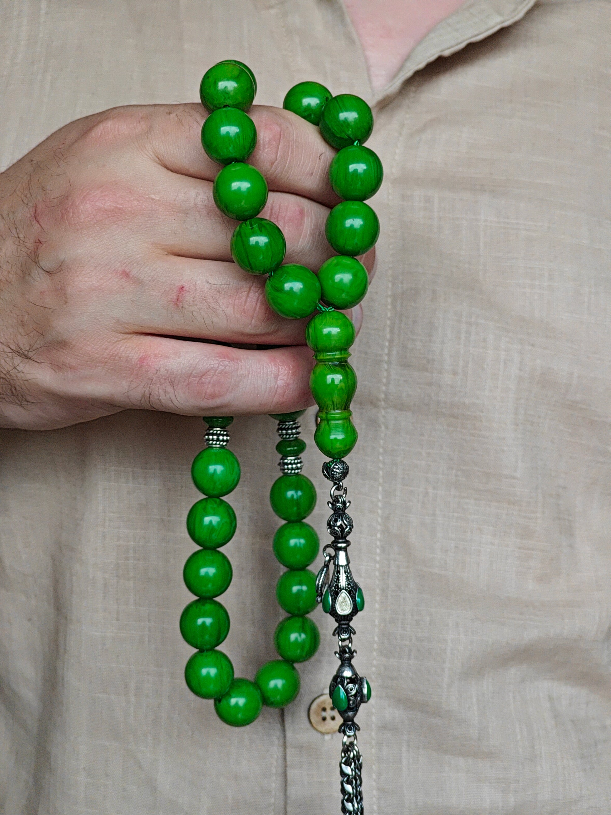 33 round beads, green with yellow veins, imami made of 3 beads. Originally a necklace.
