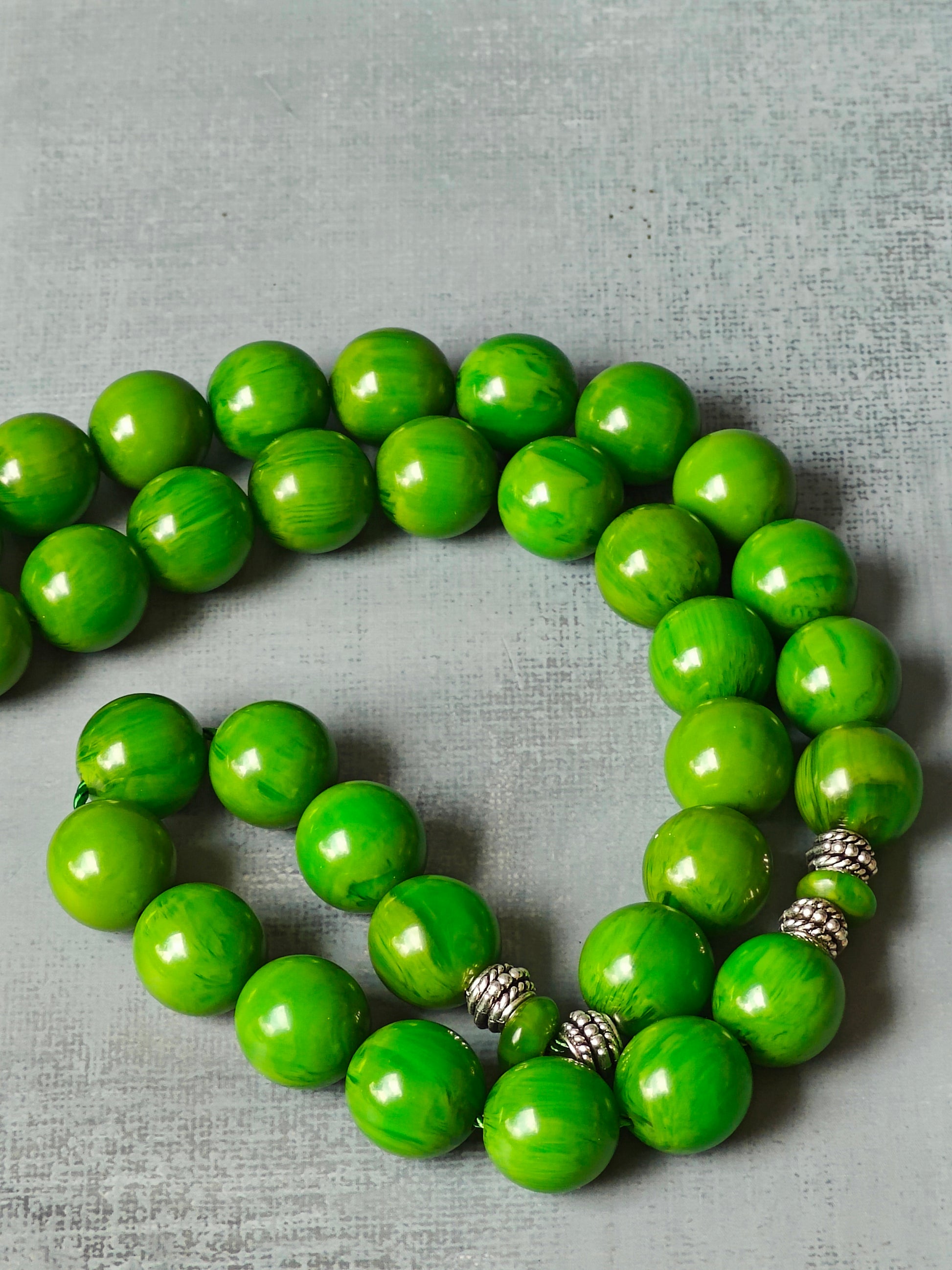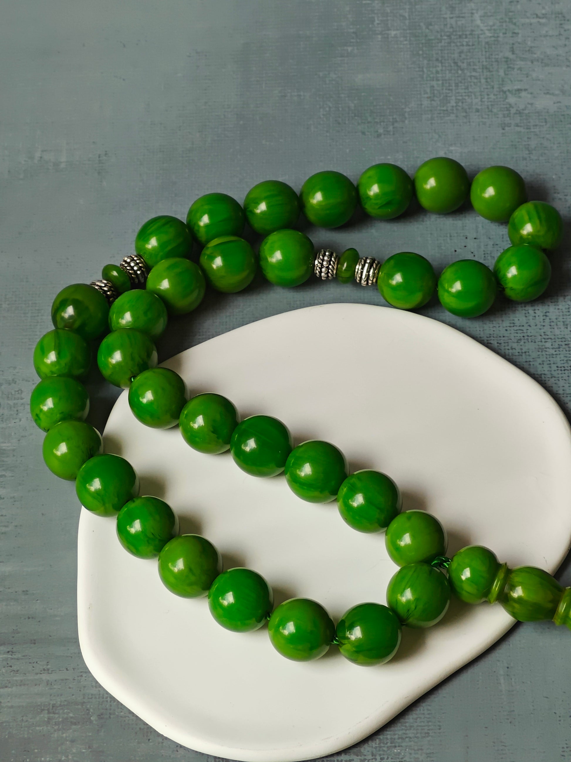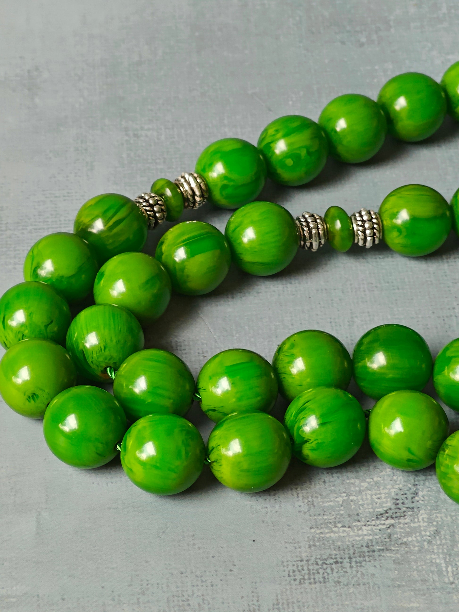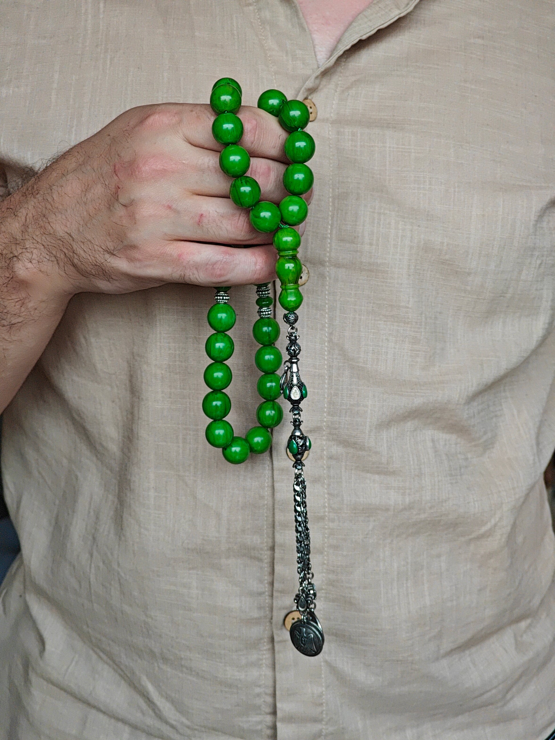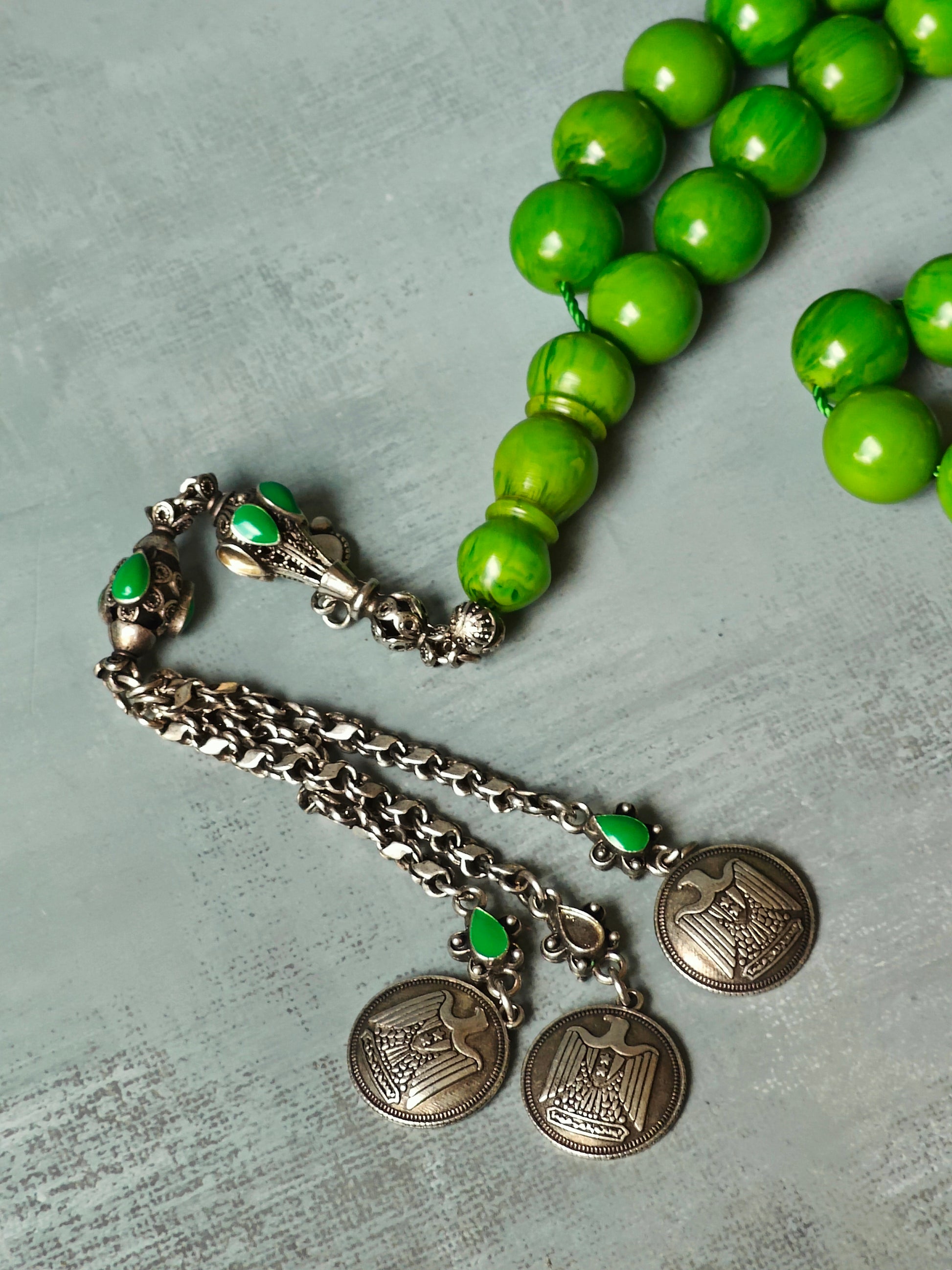 33 round beads, green with yellow veins, imami made of 3 beads. Originally a necklace.