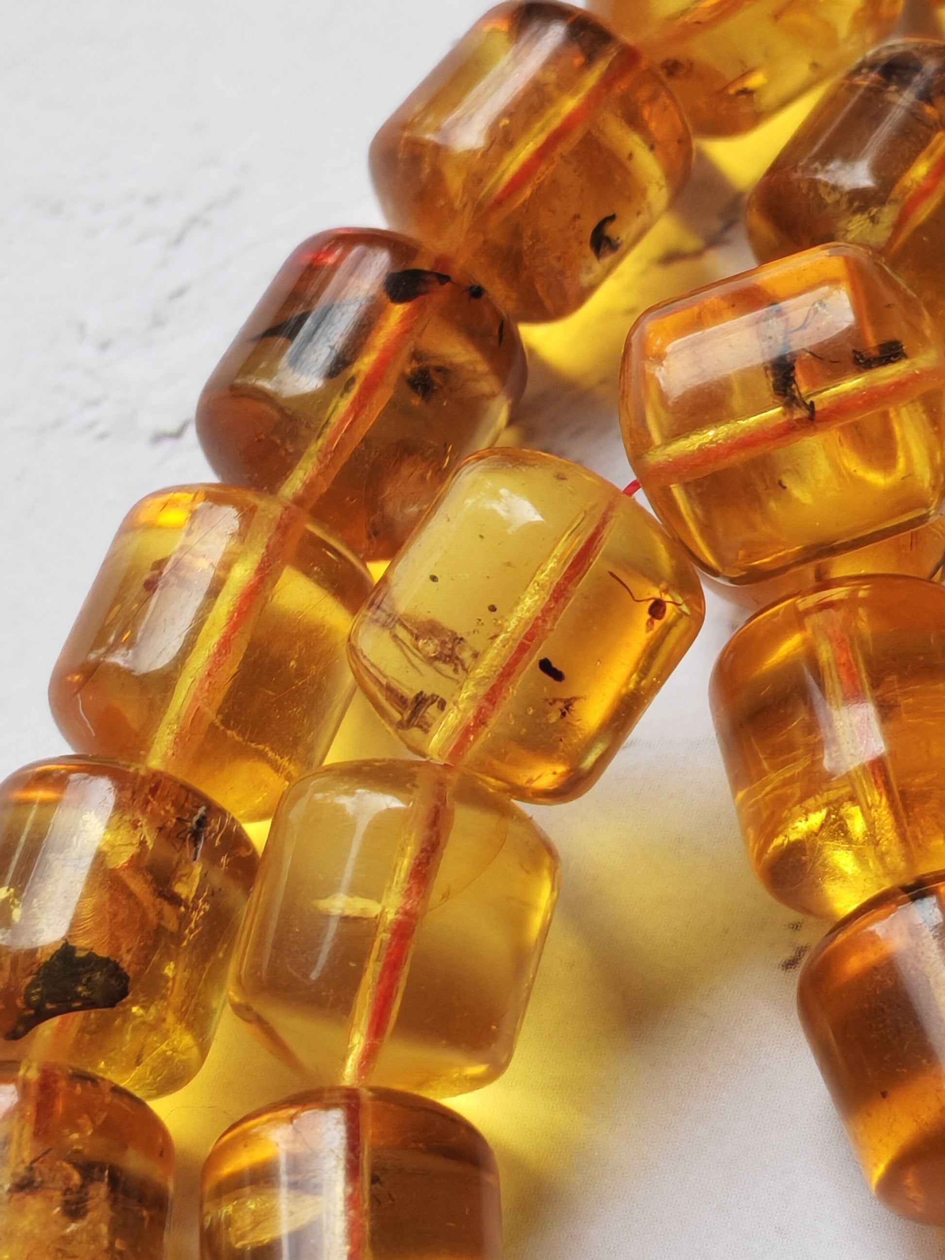 The set features 66 smooth barrel-shaped beads in a range of clear citron to deeper, dark citron tones, enriched with tiny ancient insects, natural debris, vegetation traces, and microscopic air bubbles that formed over millions of years.