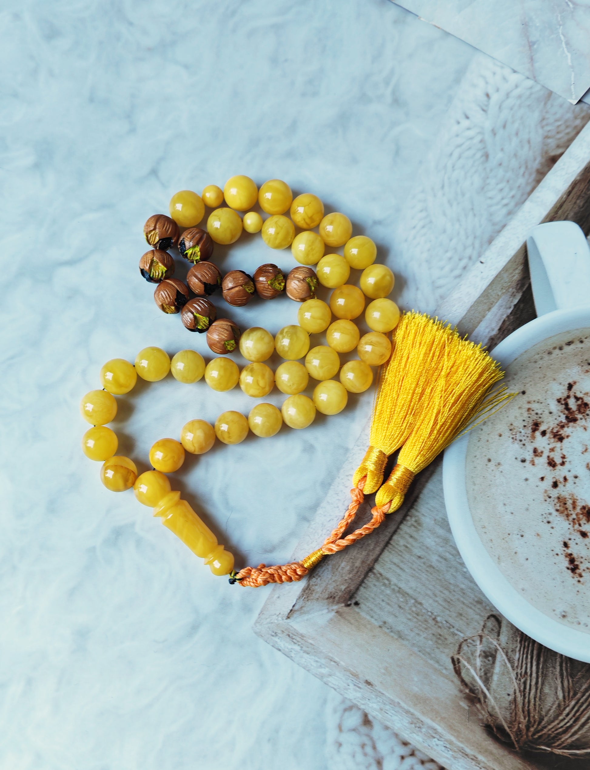 A character-filled 45-bead tasbih combining natural butterscotch and aged butterscotch amber with a distinctive artistic touch: 10 beads are hand-carved and hand-painted from peach wood, bringing color, texture and individuality to the flow. The wood beads are carefully integrated, adding a warm tactile contrast against the smooth amber.