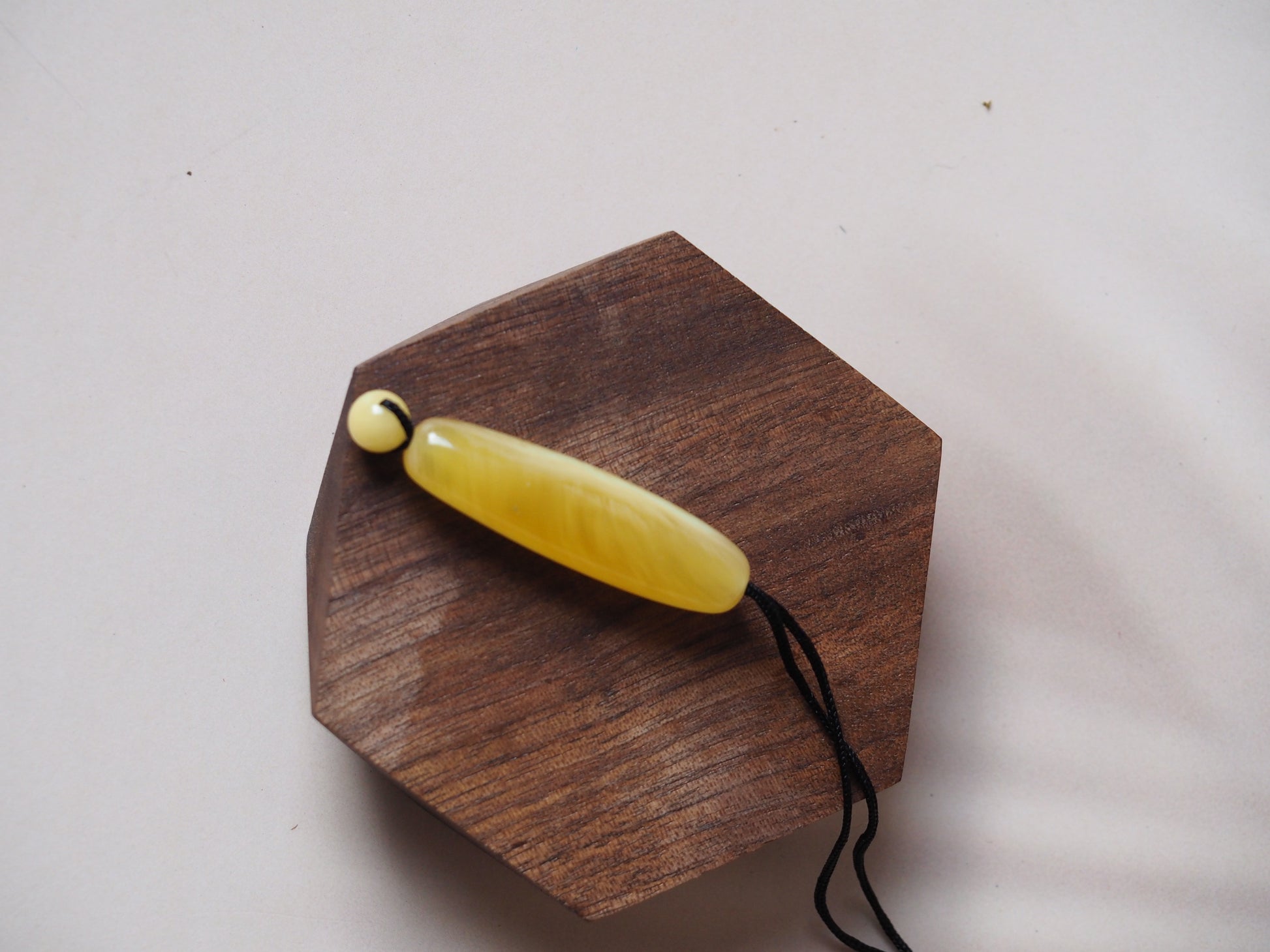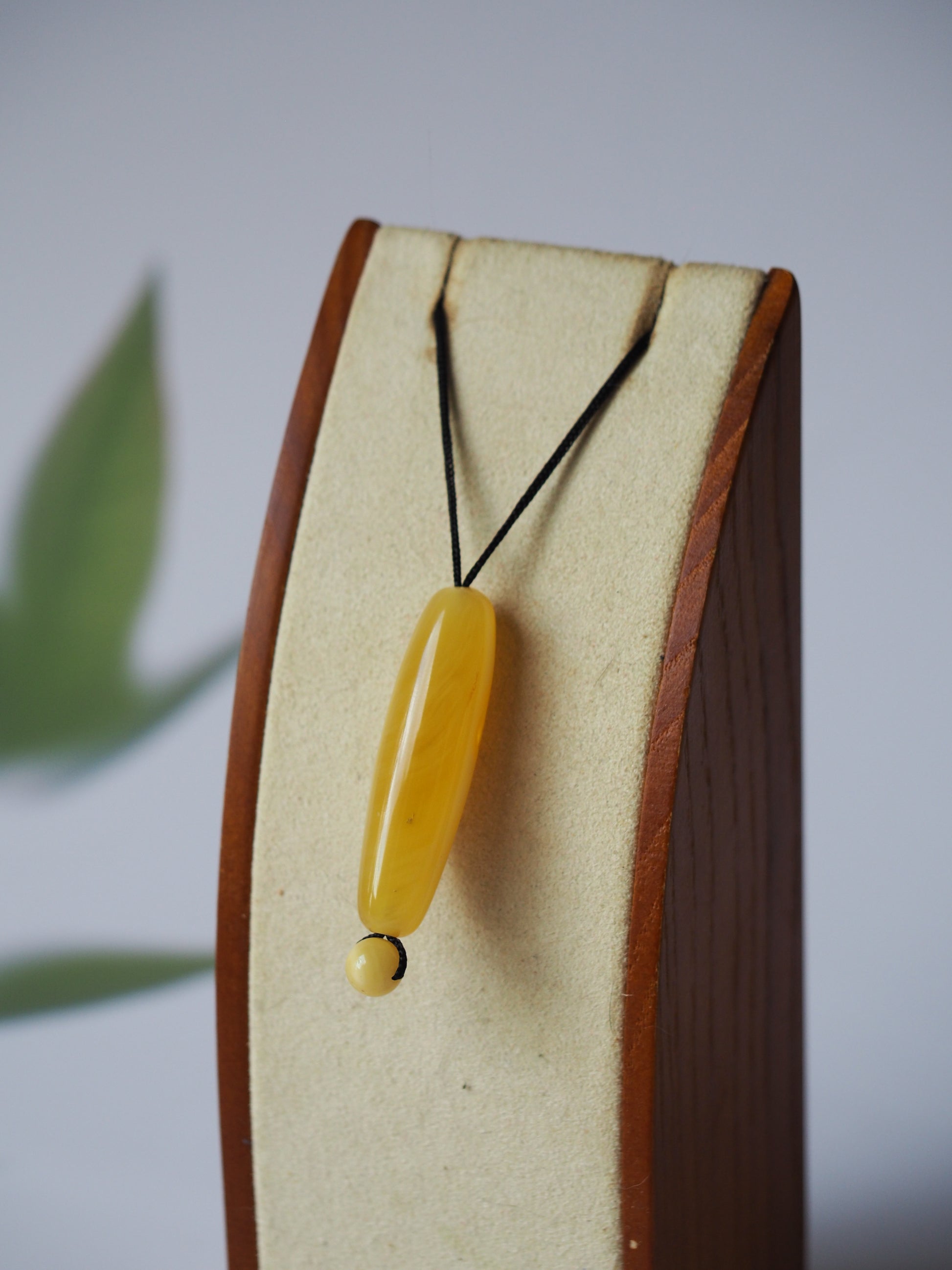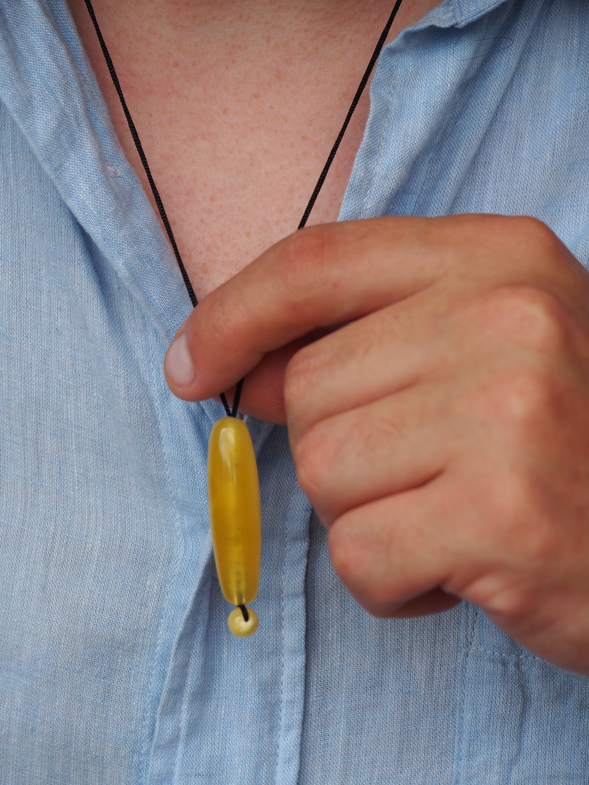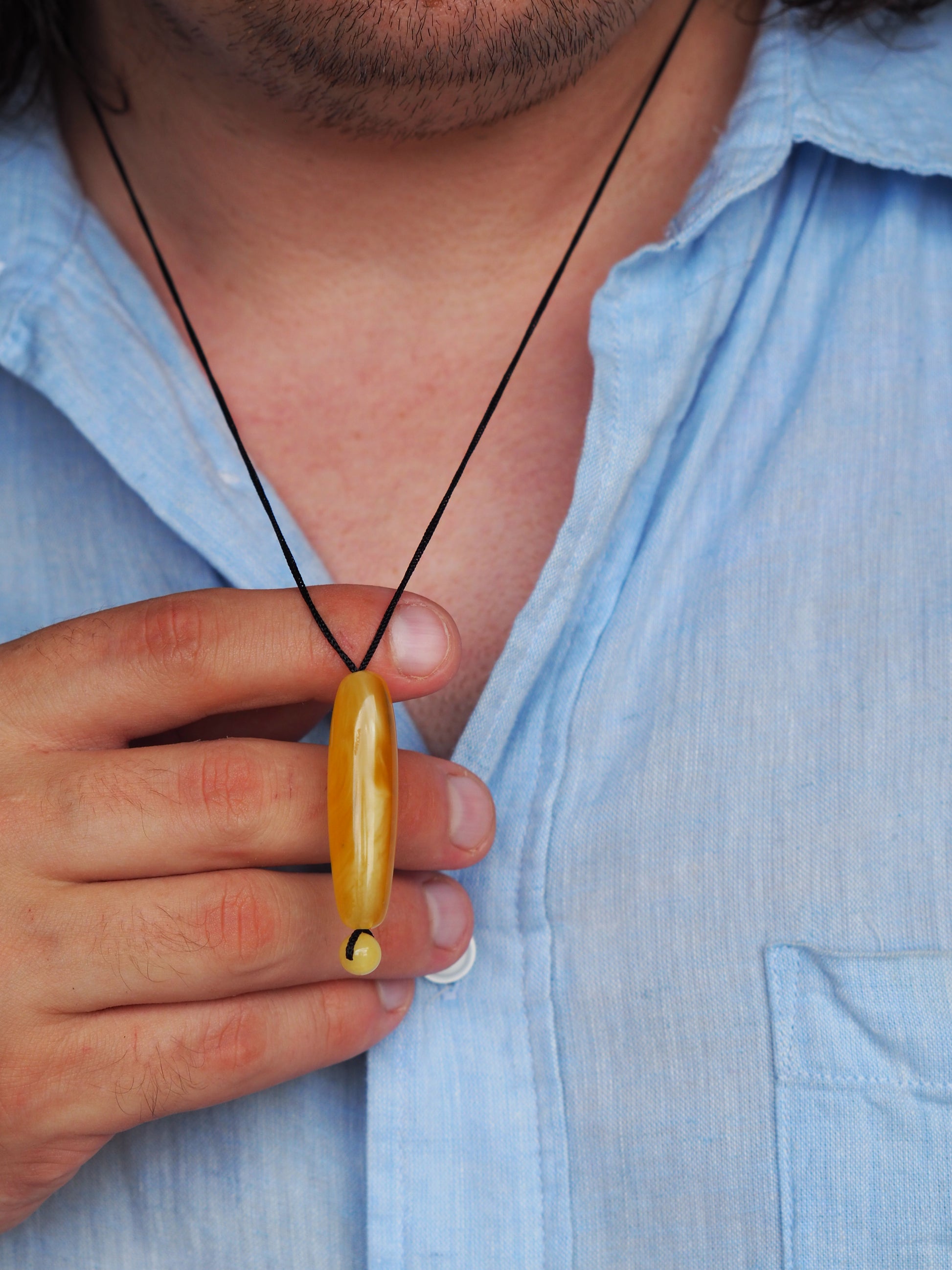 100% Natural Amber with no treatment or heat. Handmade in Singapore. Oval Piece shape: 42 x42mm. Ball size 7mm. Pure Color. Black Cotton Cord. Adjustable length. Unisex Design.
