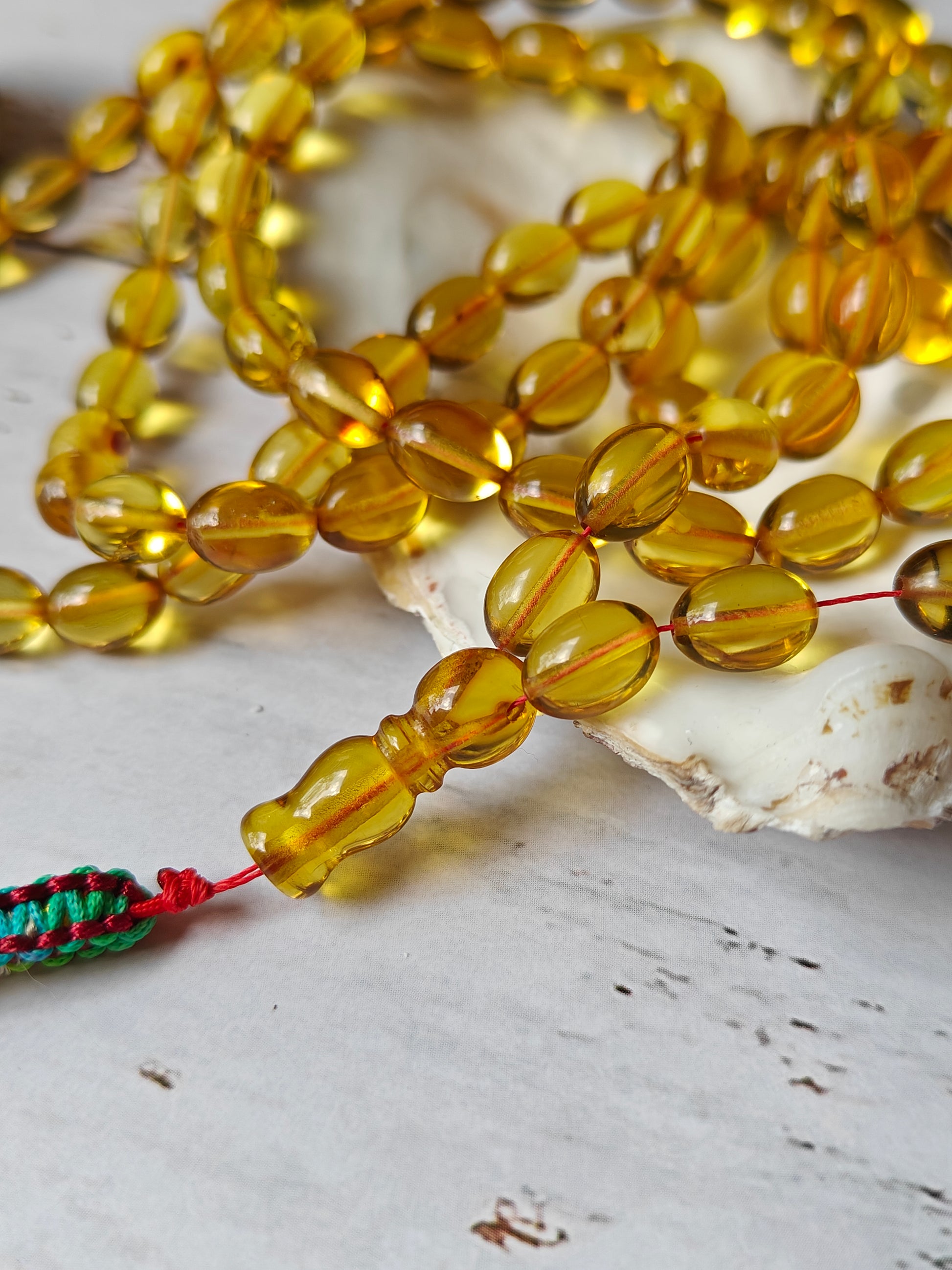 Unique origin, rare material. 99 beads olive shape, long but pocket size.