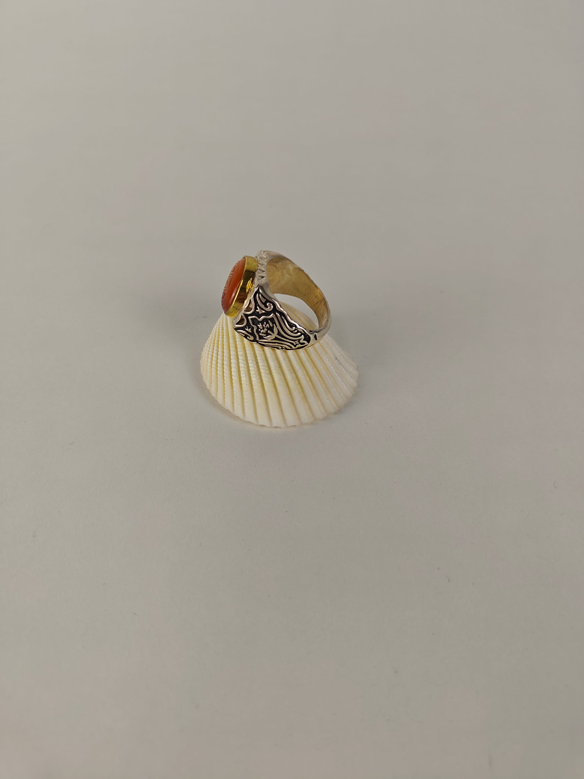 925 Silver ring, heavy and masculine with a Seal of Solomon carved on the stone and embossments on sides.