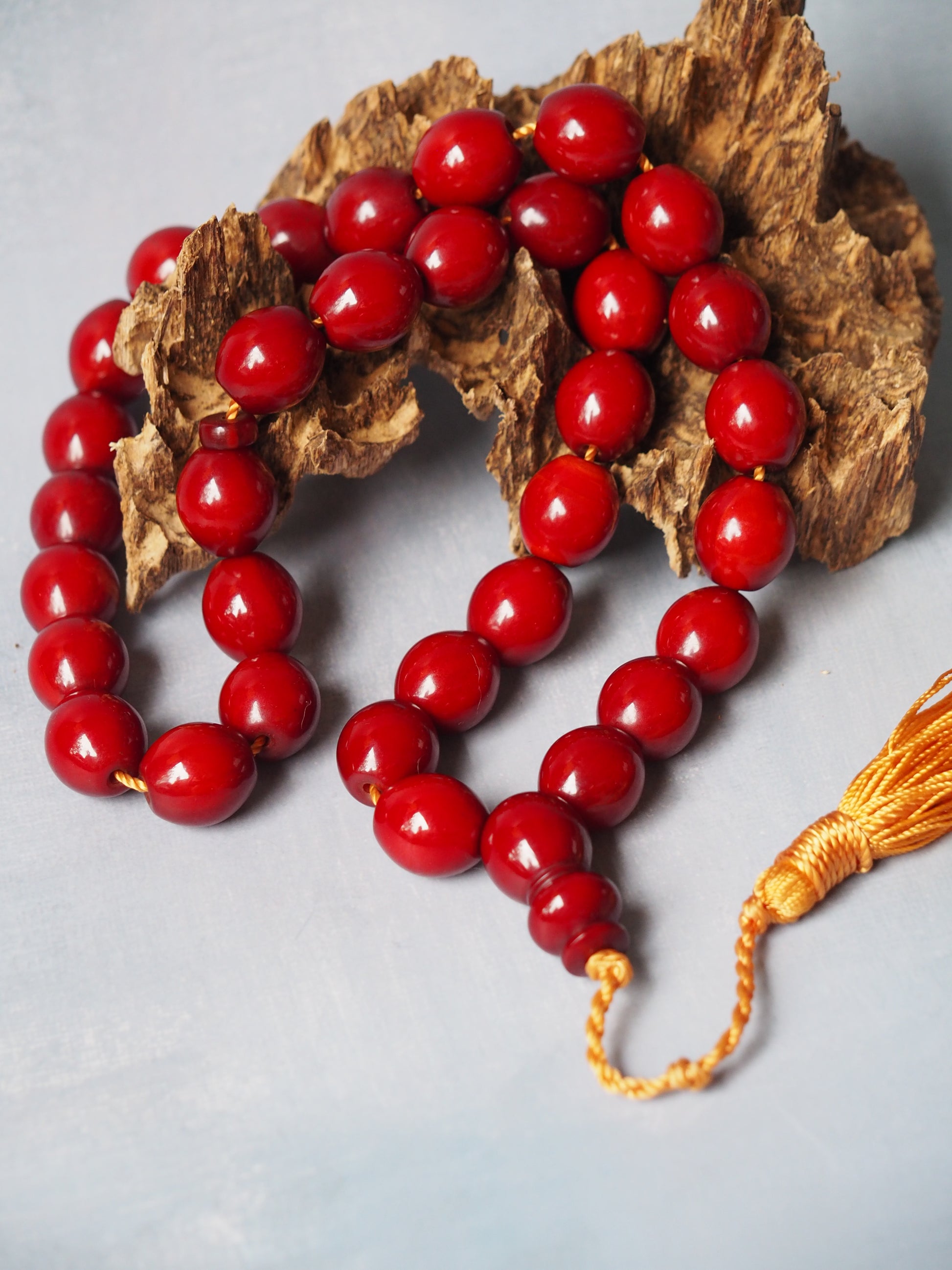 Signature Afghani imami. Bright dark red color. 33 Olive Shaped beads.