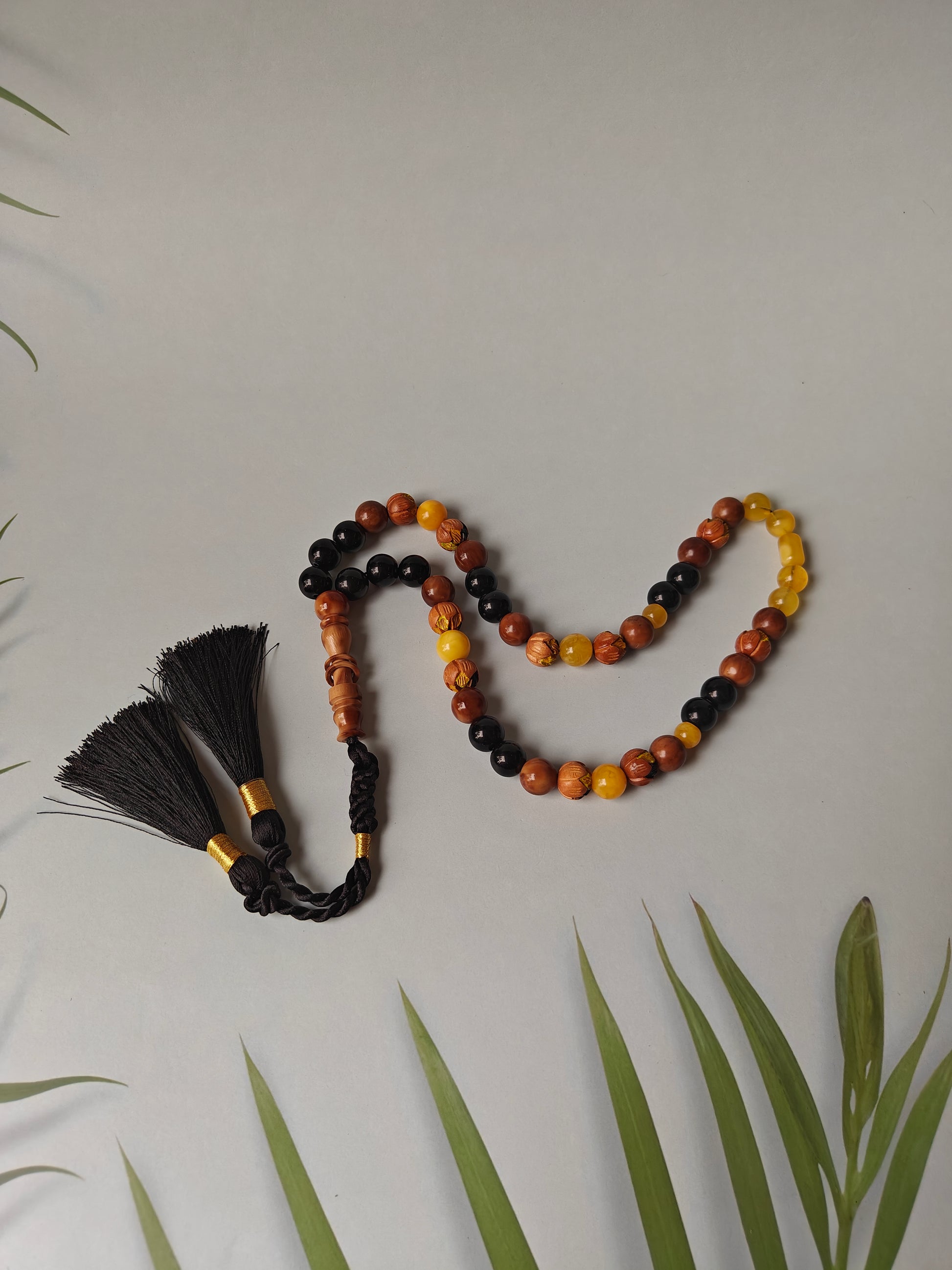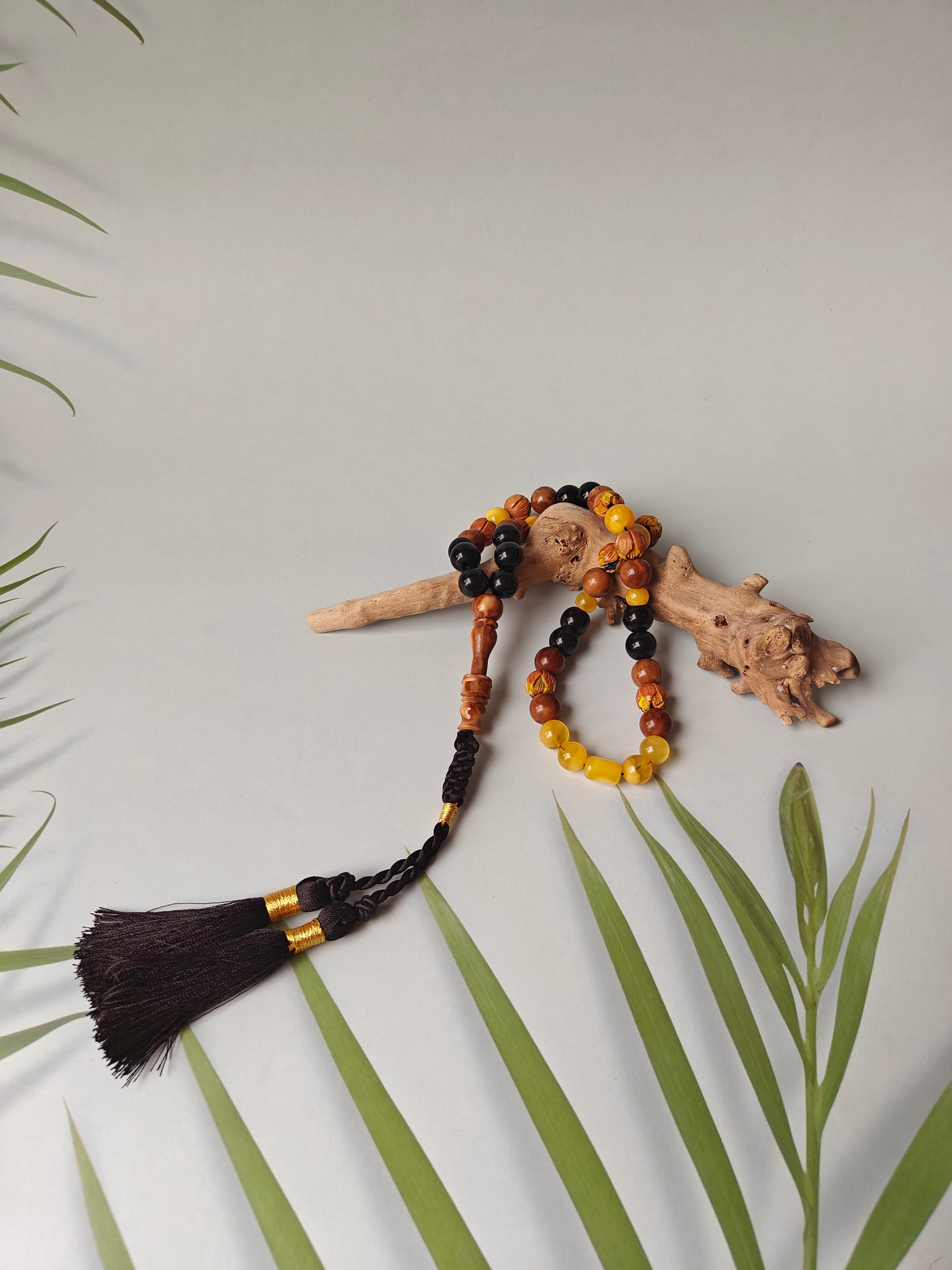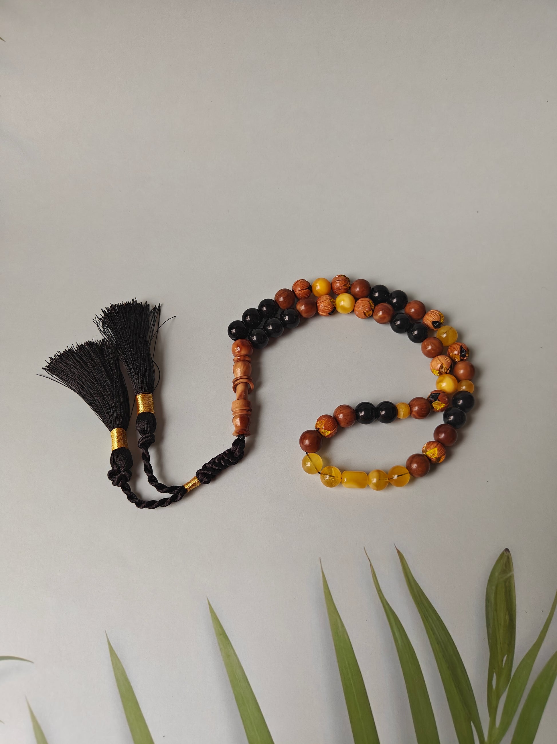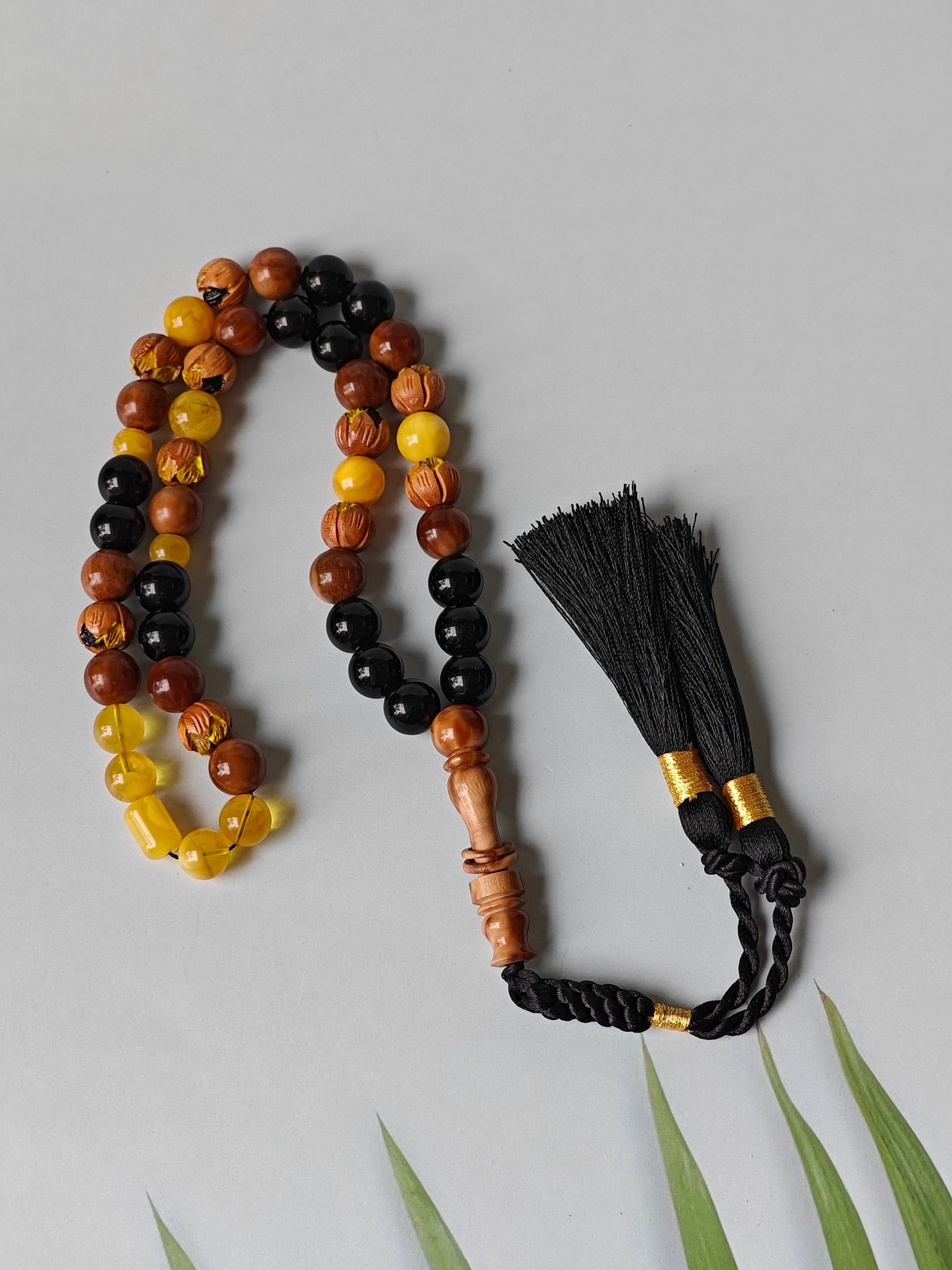 One of a Kind Hand Carved and Hand Painted Peach Wood, Butterscotch and Cloudy Amber, Kokka Wood and Black Onyx Tasbih 45 Beads