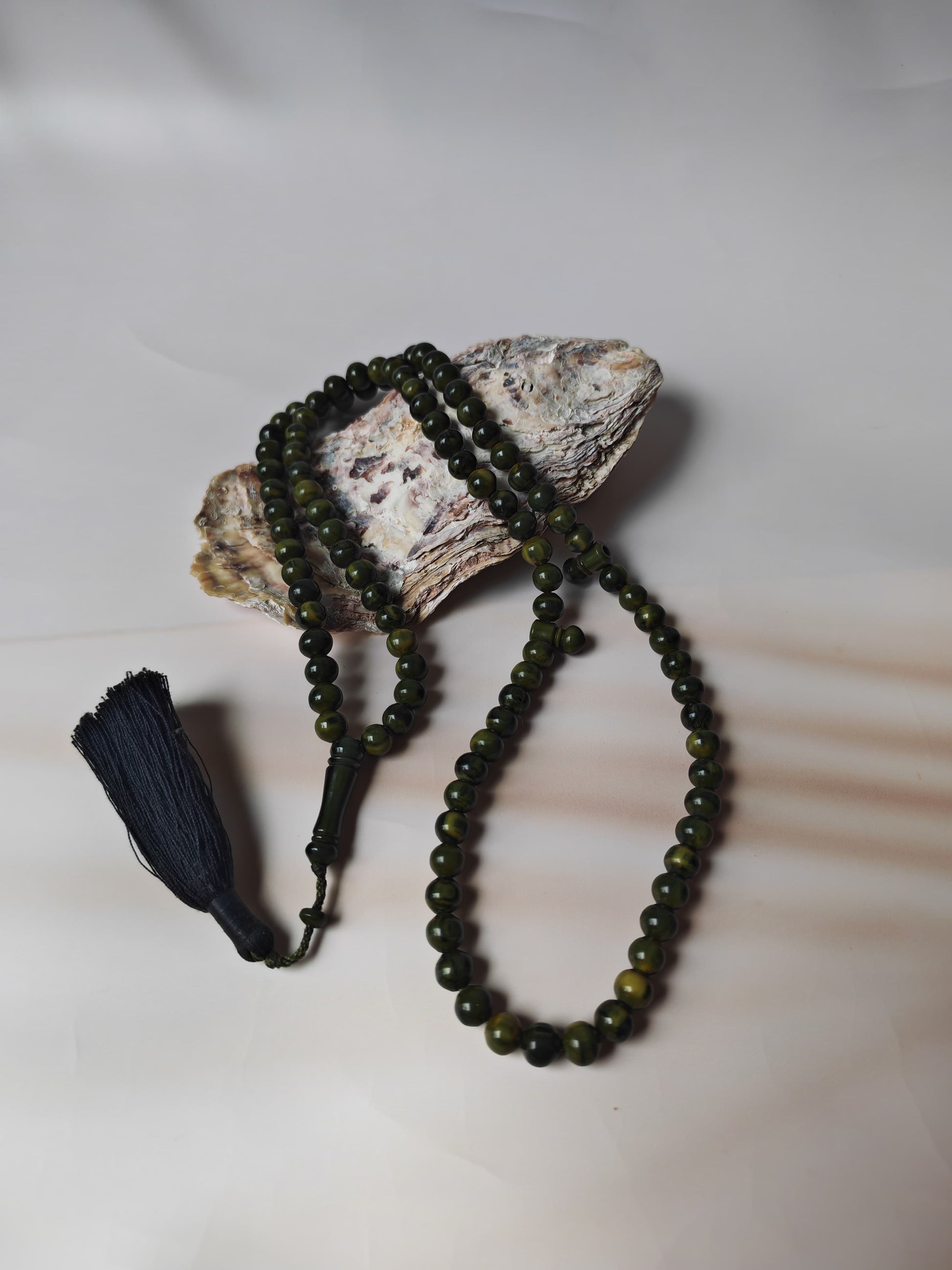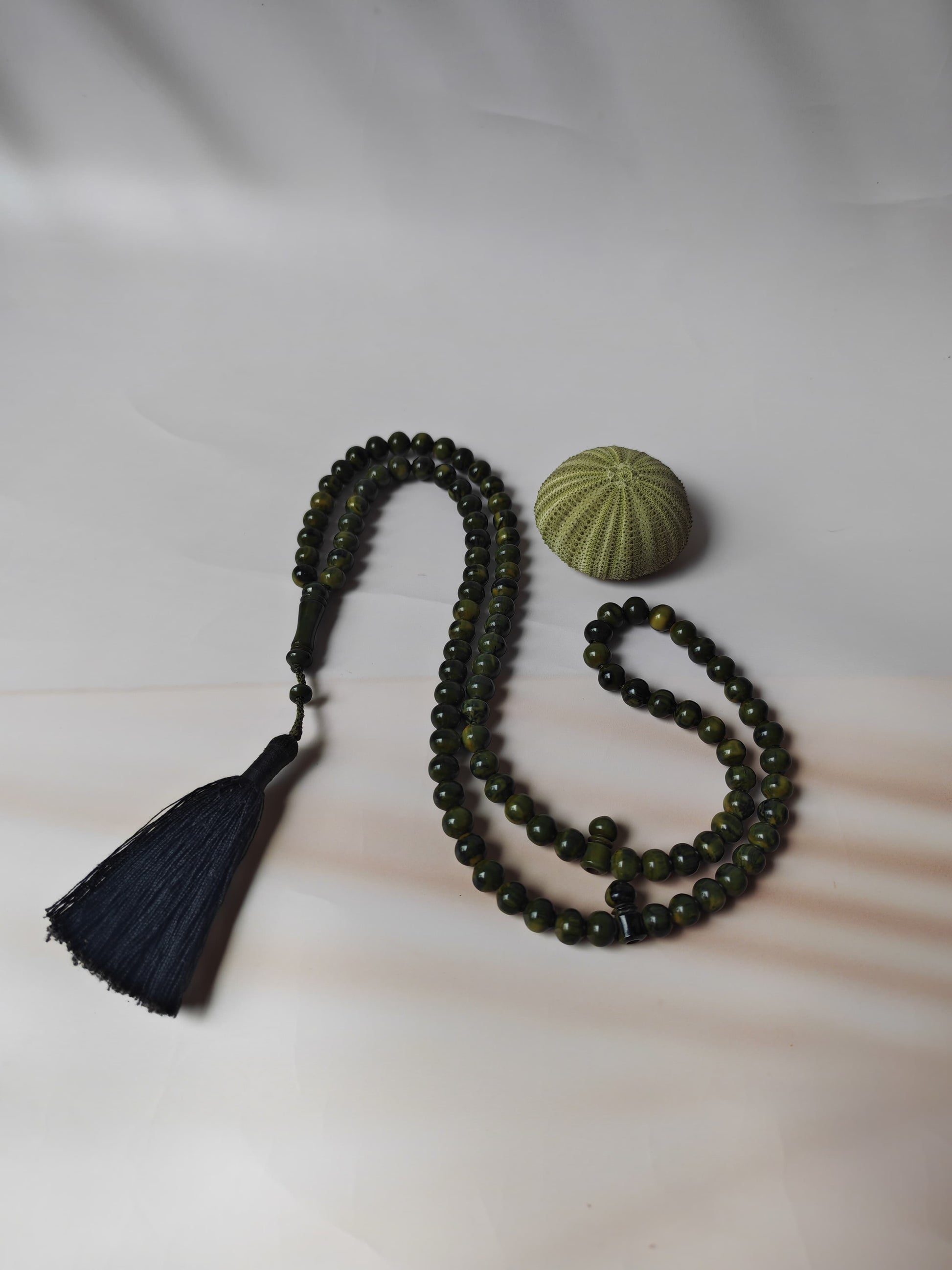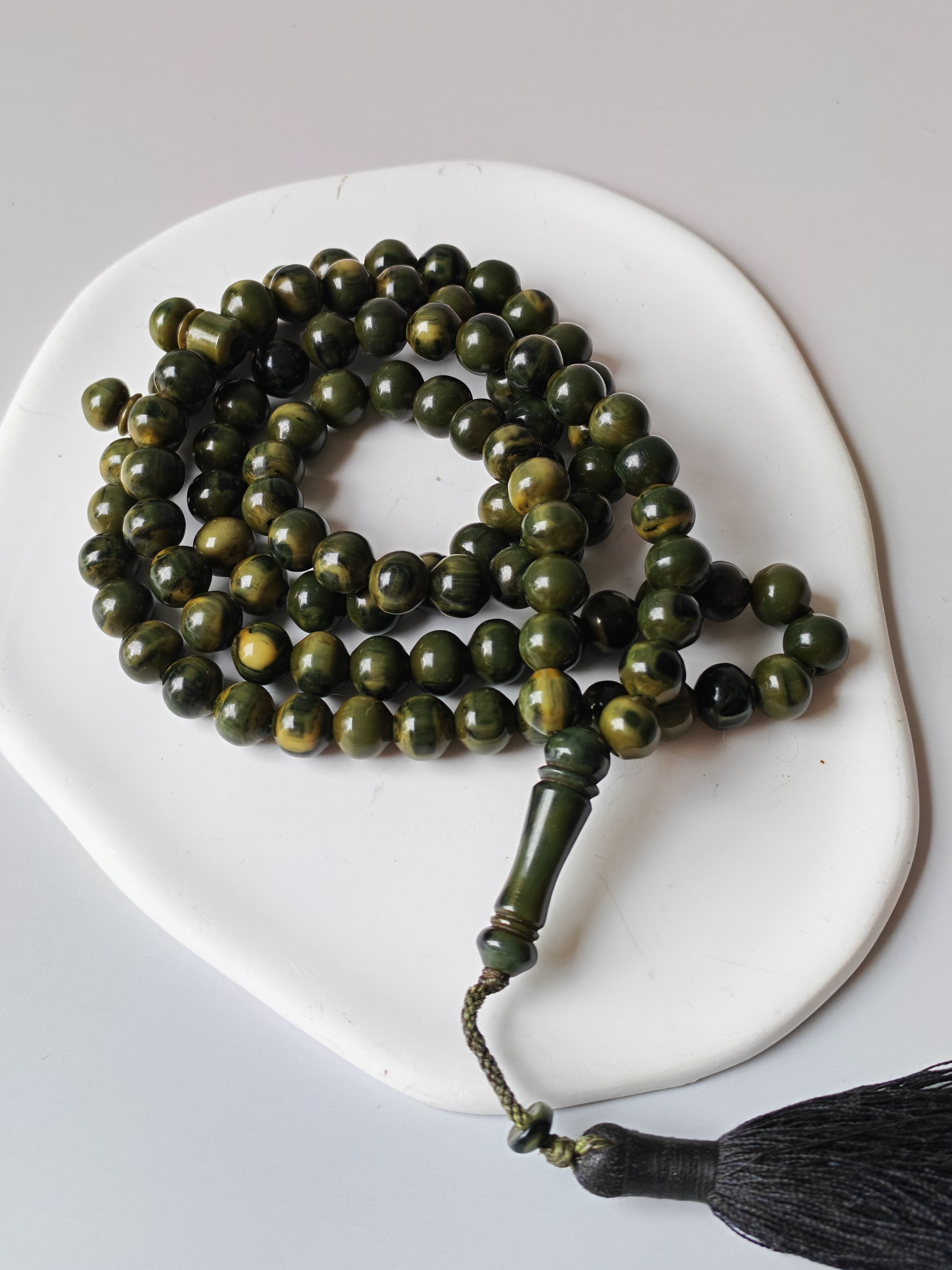 A rare and highly collectible misbah crafted from antique German Bakelite, showcasing exquisite Turkish Ottoman craftsmanship. The 99 small beads feature a distinctive frog-green hue with elegant black veins, a color pattern prized among vintage collectors.