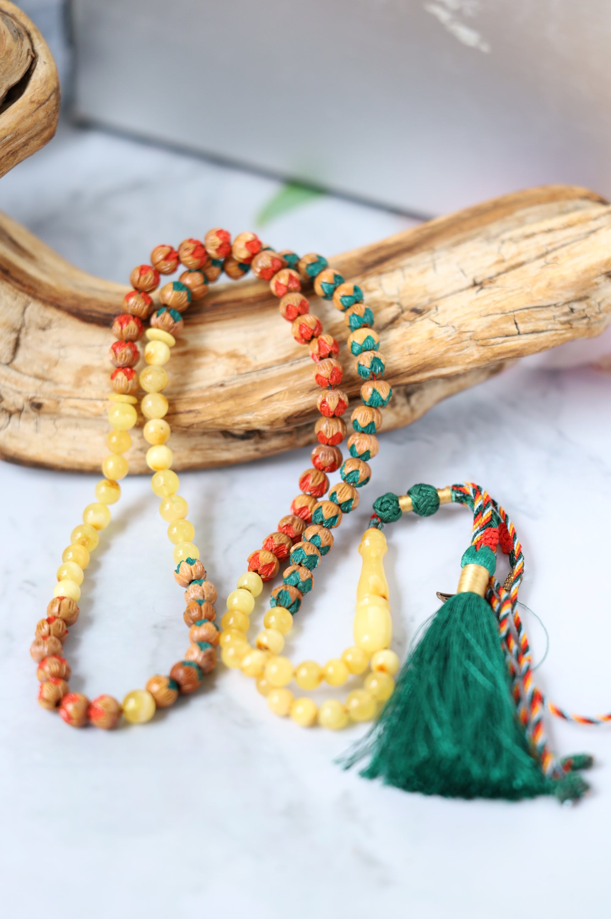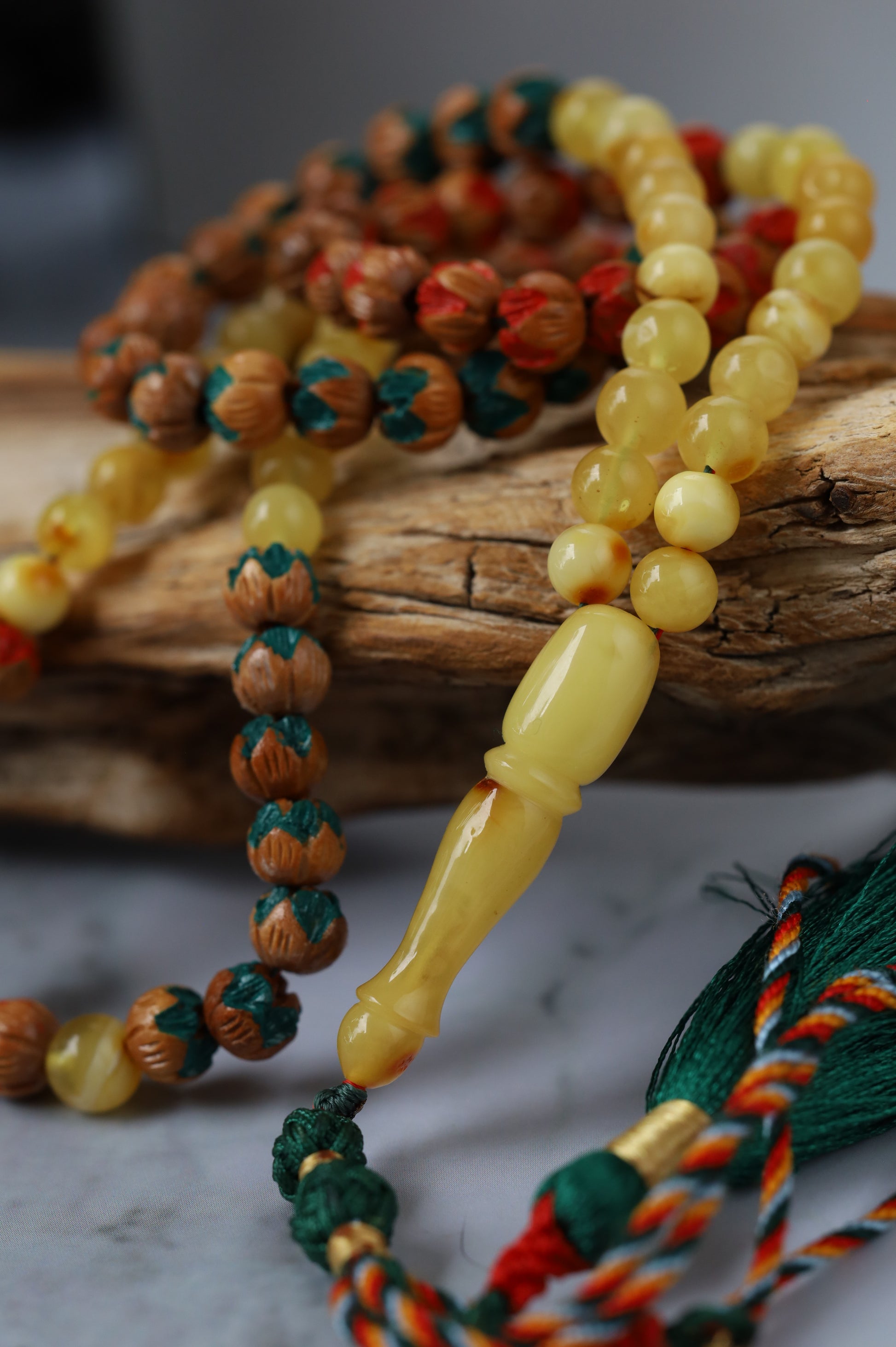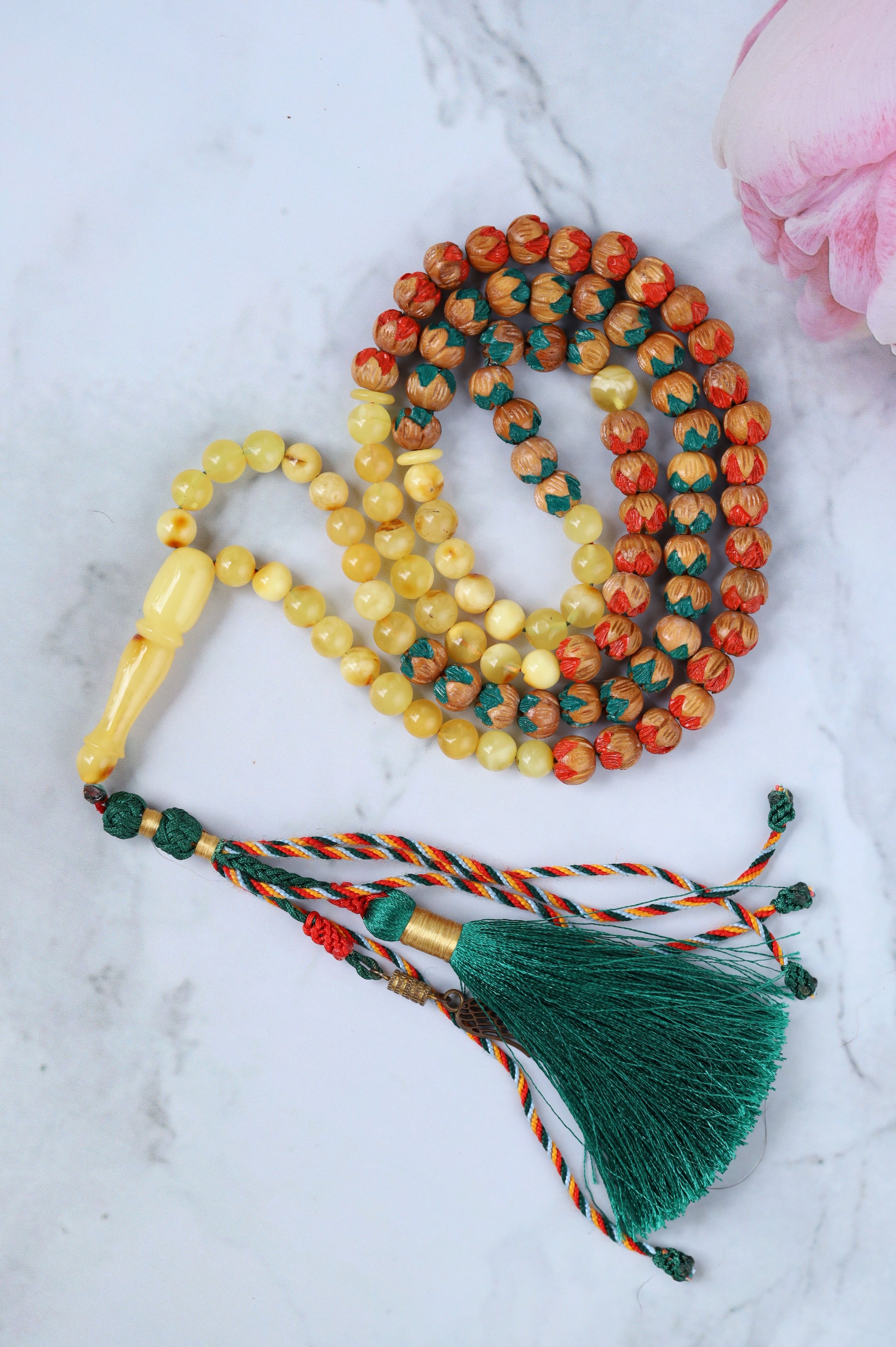 Handcarved Cherry Wood & Raw Multicolor Amber Rosary – 99 Beads