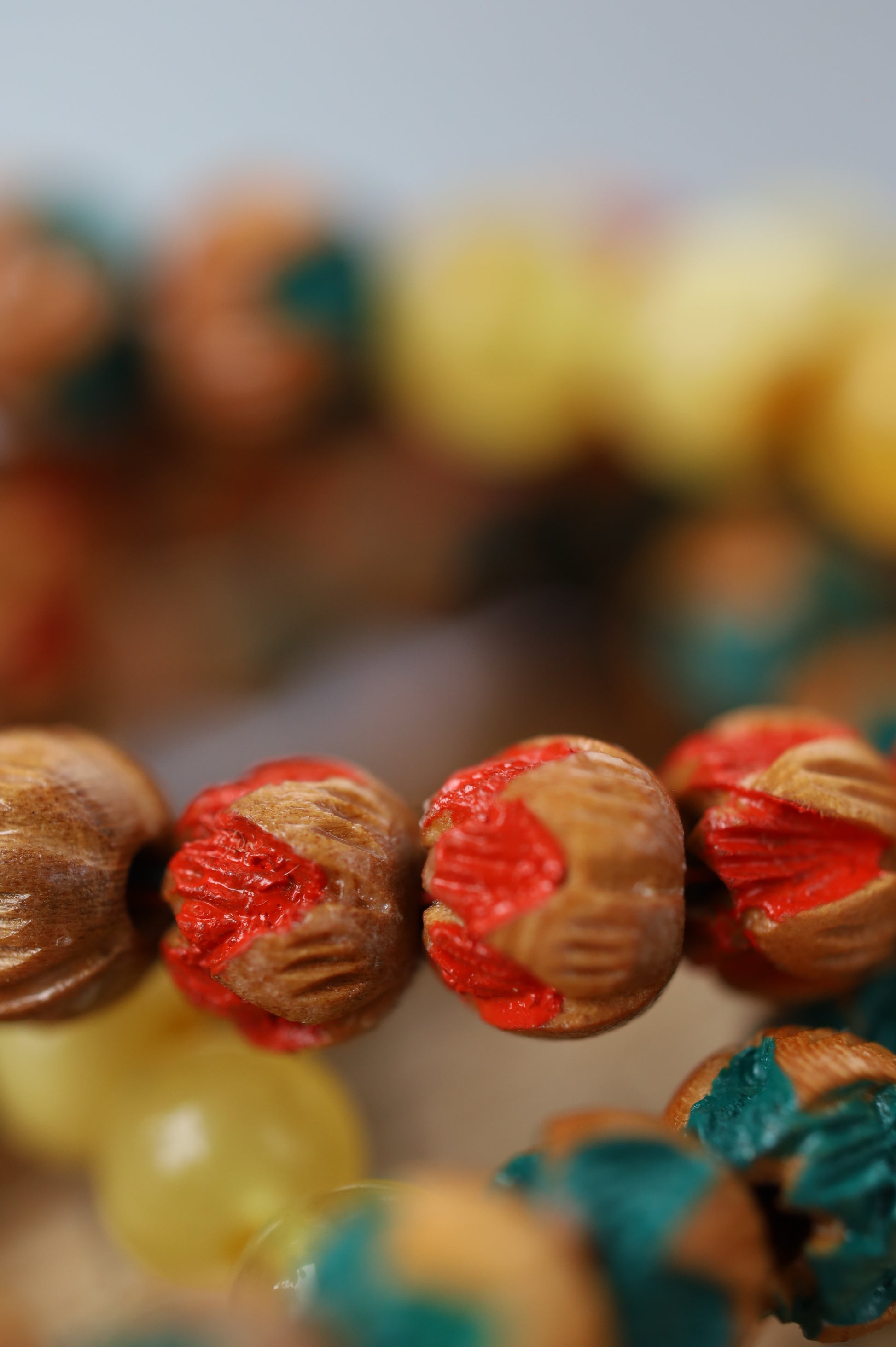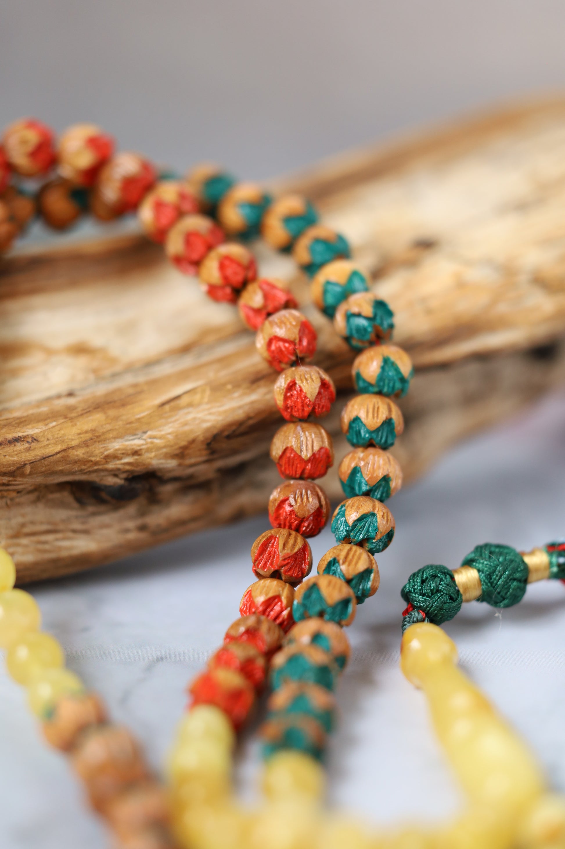 This rosary features 99 beads, strung on a double string carefully matched to the painted cherry wood beads and the tassel, creating a cohesive and intentional design. Despite its length, it remains very lightweight, making it ideal for daily use without fatigue.