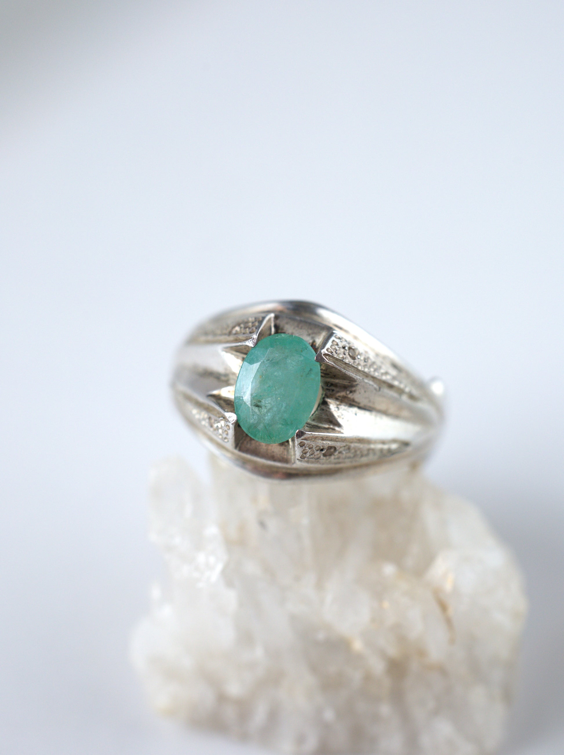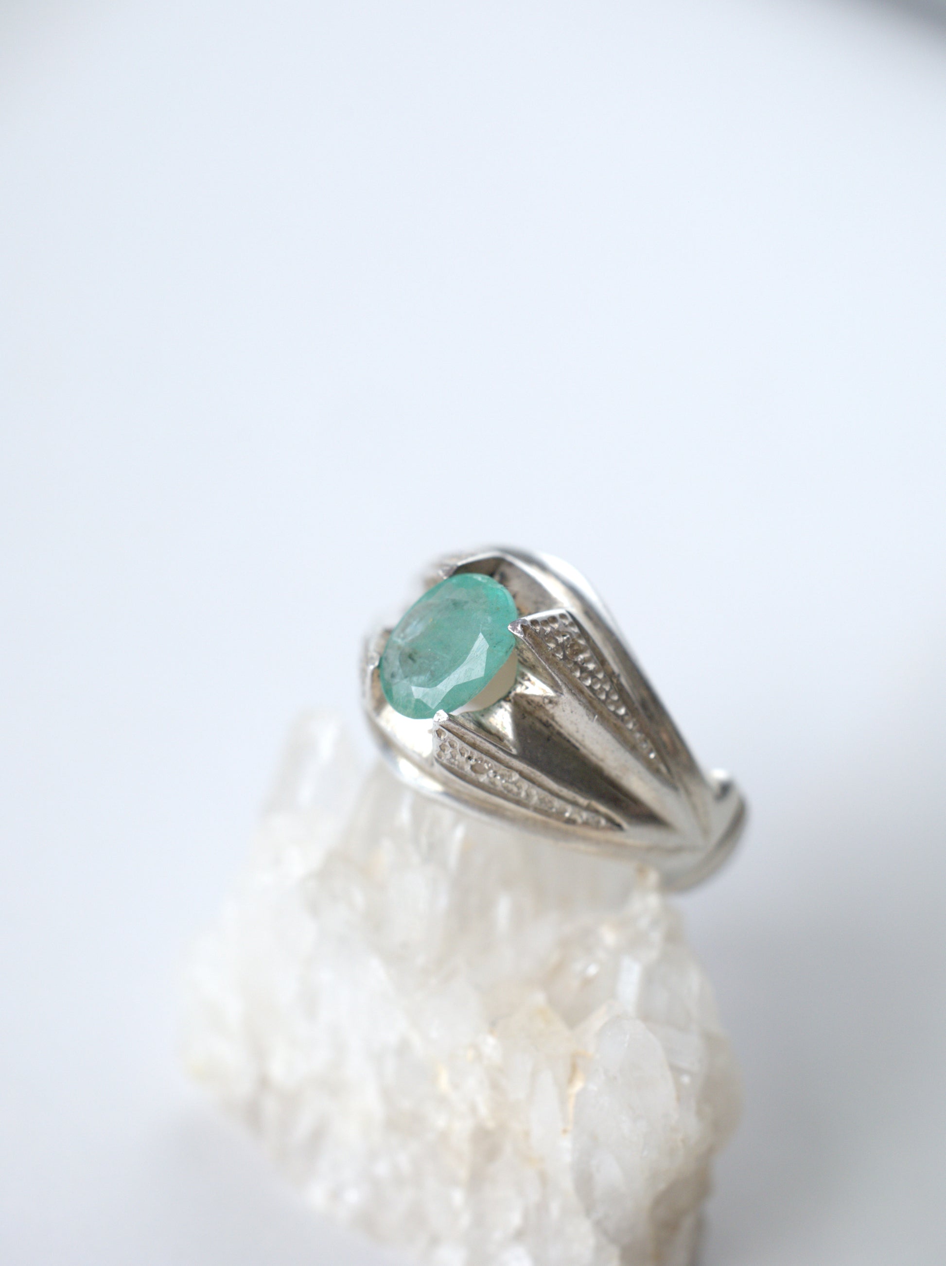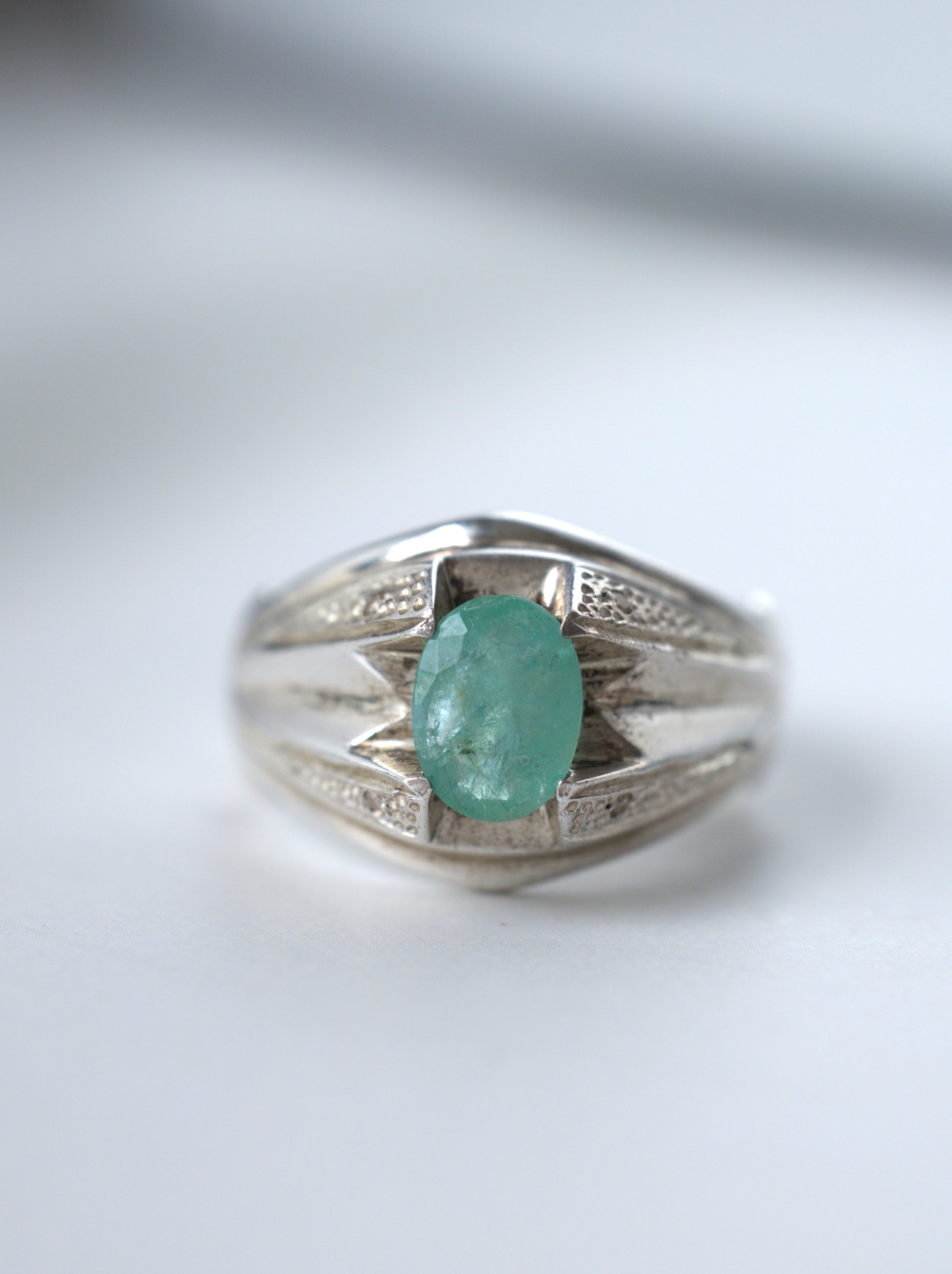 A delicate ring set with light-colored, almost transparent natural emerald, framed in 925 sterling silver. The design is light and refined, making it comfortable and easy to wear every day.
