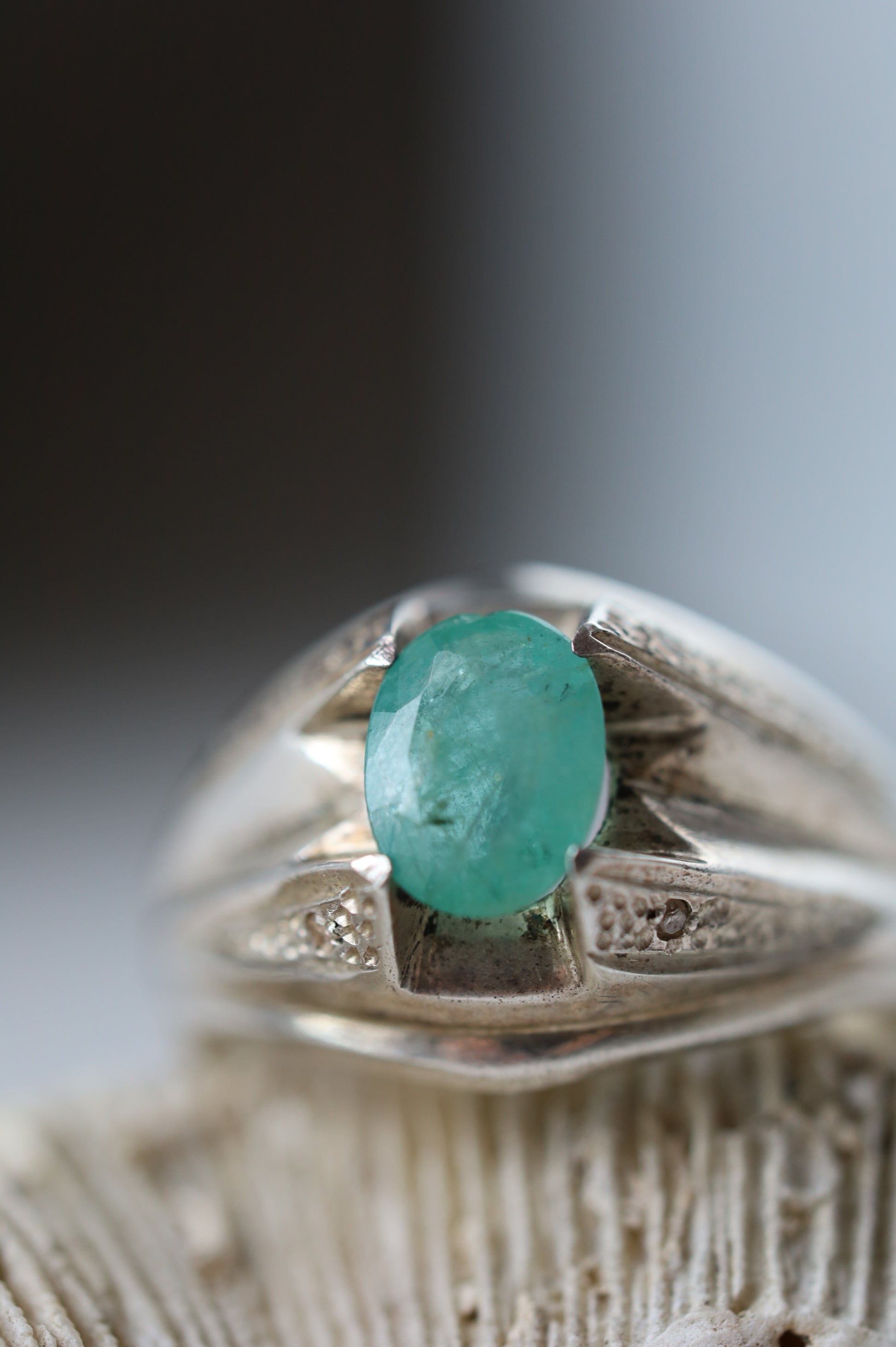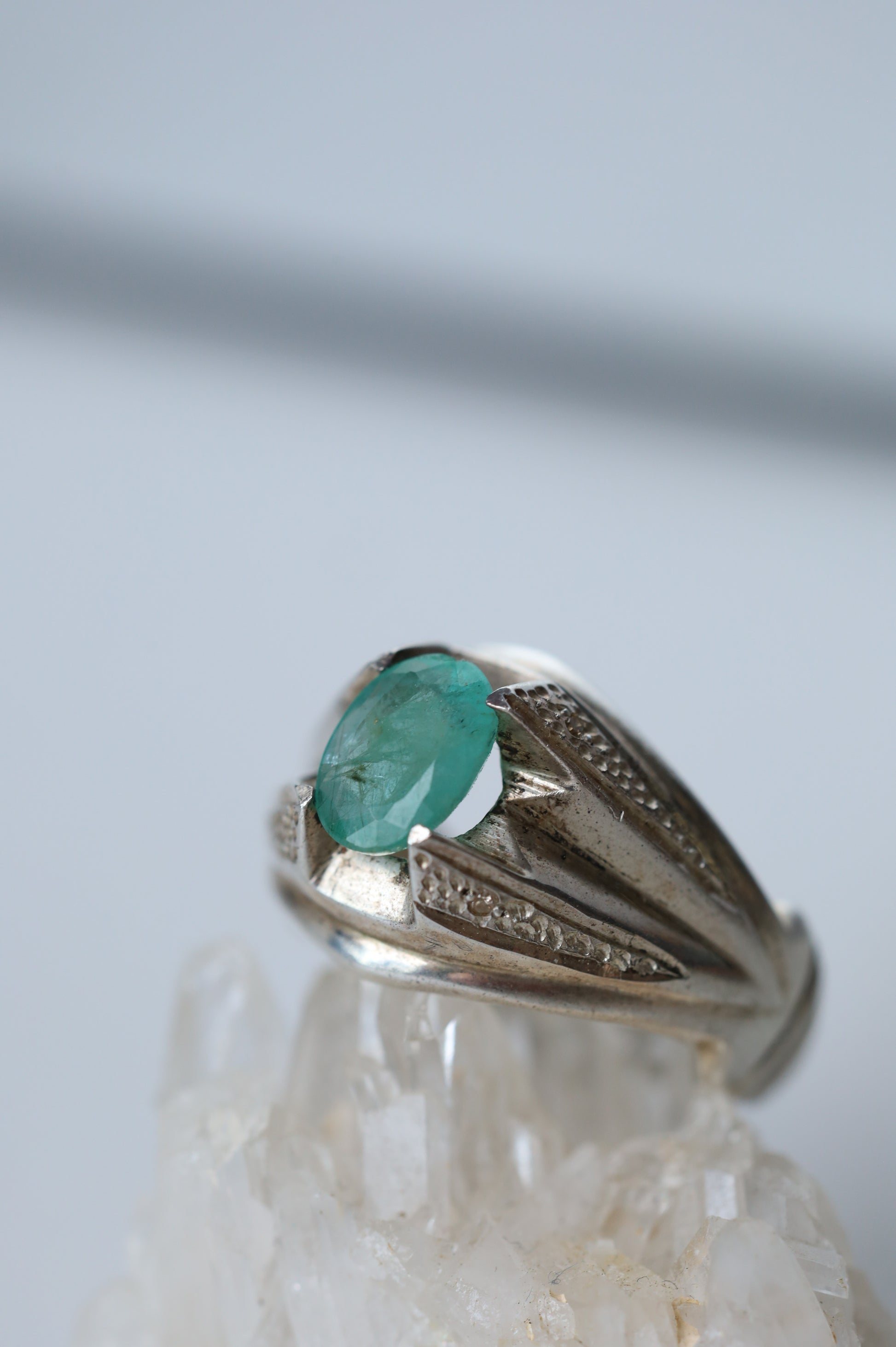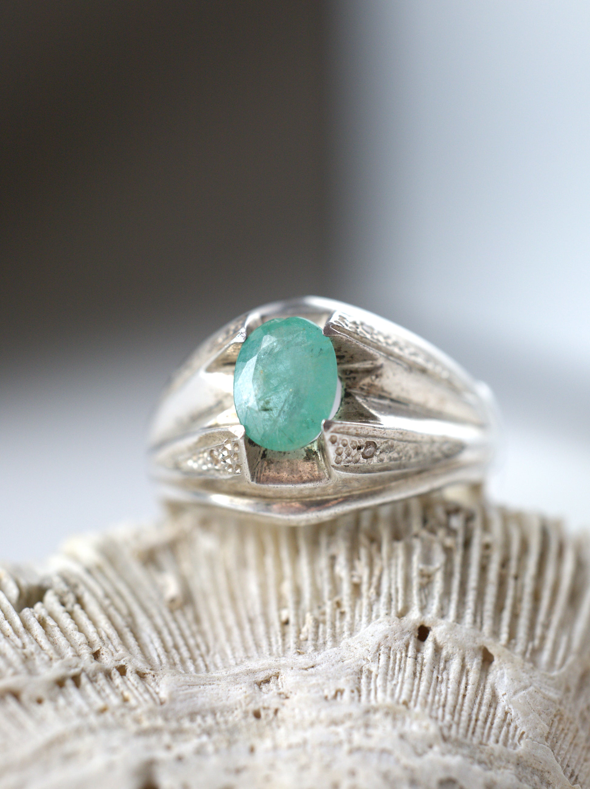 A delicate ring set with light-colored, almost transparent natural emerald, framed in 925 sterling silver. The design is light and refined, making it comfortable and easy to wear every day.