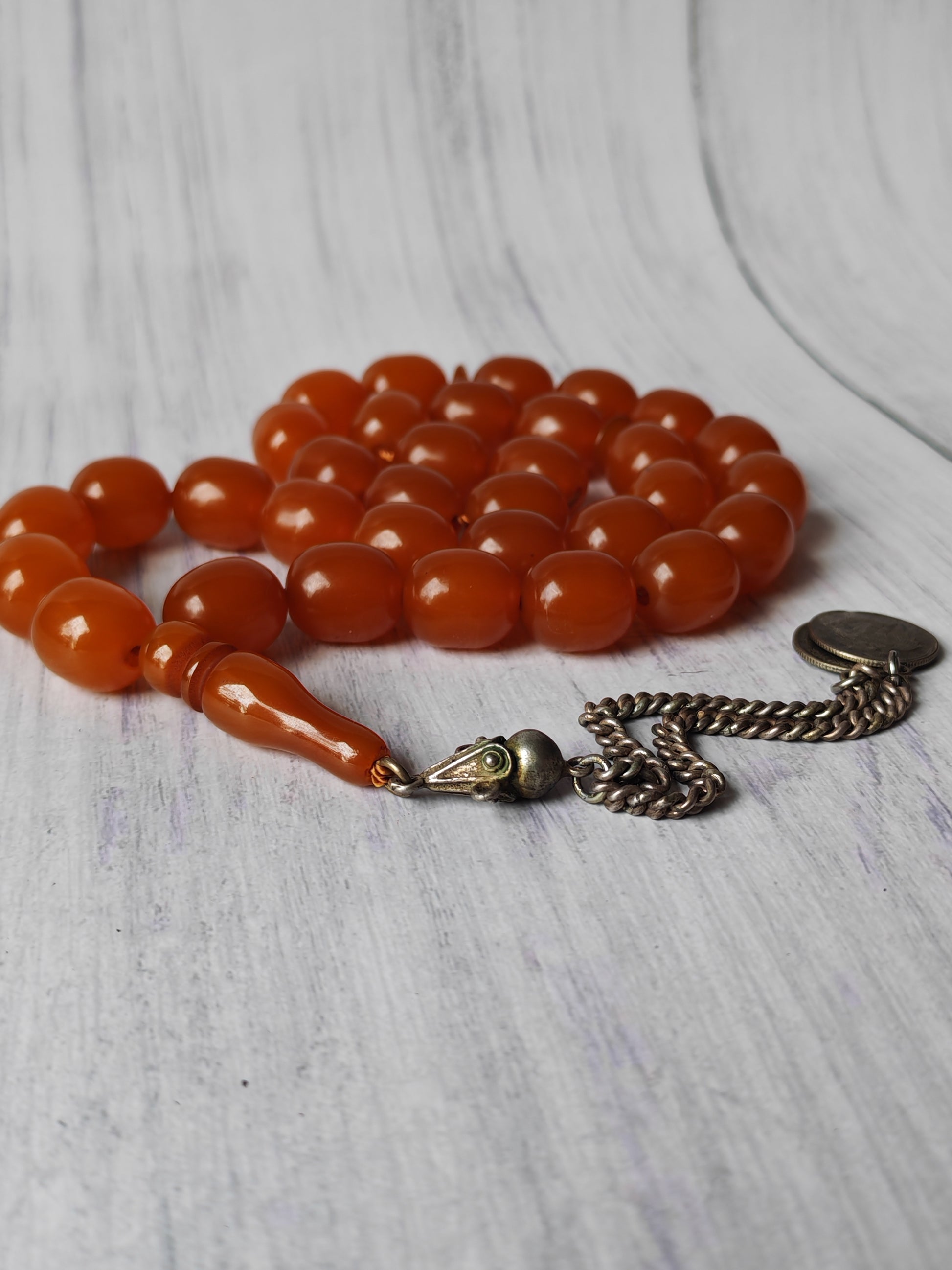 A remarkable antique German Bakelite tasbih crafted in the Czech Republic, showcasing classic workmanship and a rich, warm honey color. Signature Small Imami in comparison to other beads.