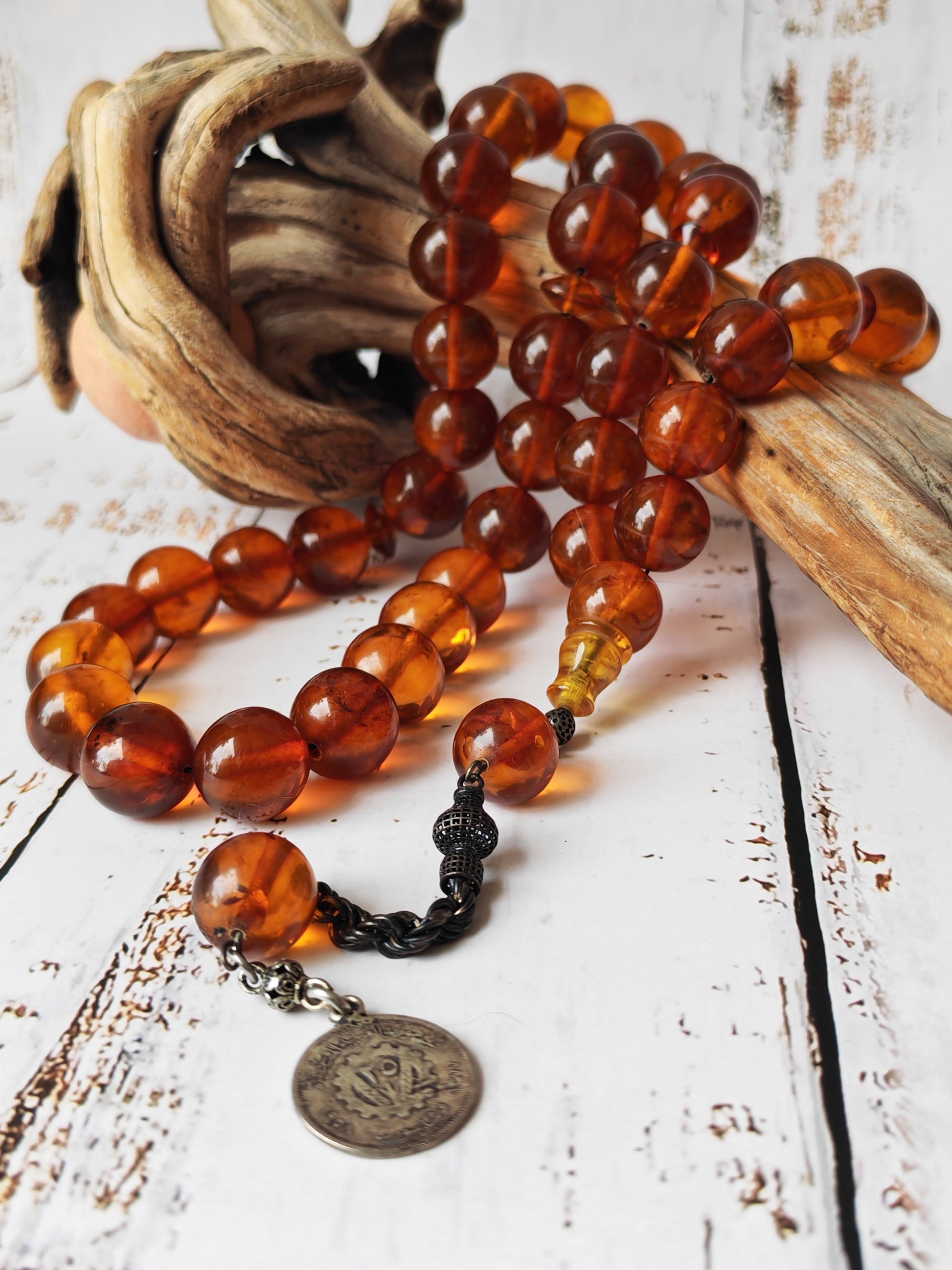 Natural debris and inclusions are clearly visible inside the beads, confirming the authenticity and untouched nature of the material. The large bead size offers a substantial, satisfying feel in hand, making this piece more of a statement rosary than an everyday lightweight tasbih.
