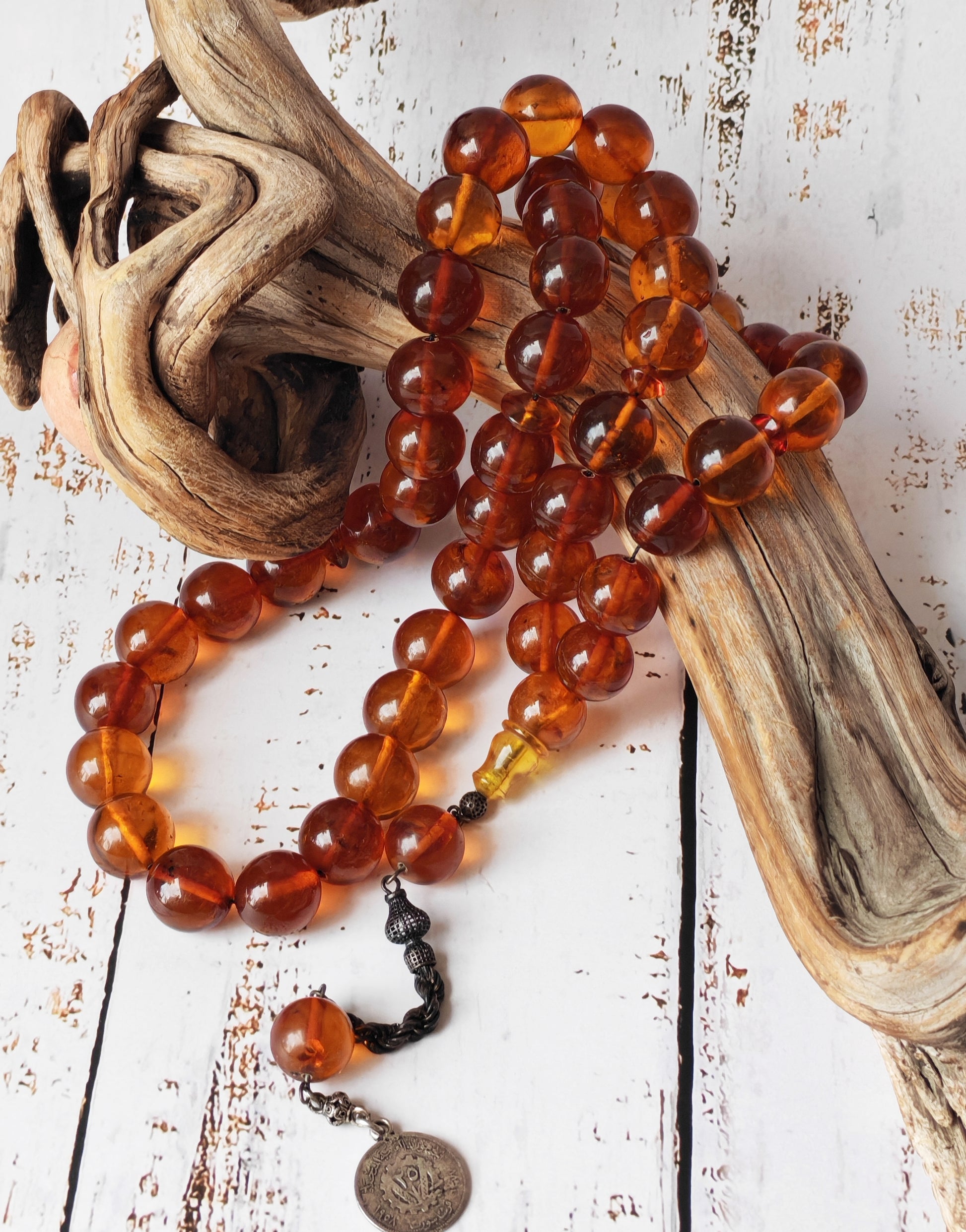 Finished with an antique silver tassel, the rosary carries a distinctly old-world aura, perfectly matching the aged amber material. With 47 beads, this is a rare and imposing piece intended for serious collectors of antique amber, appreciated both for its material value and its historical character.