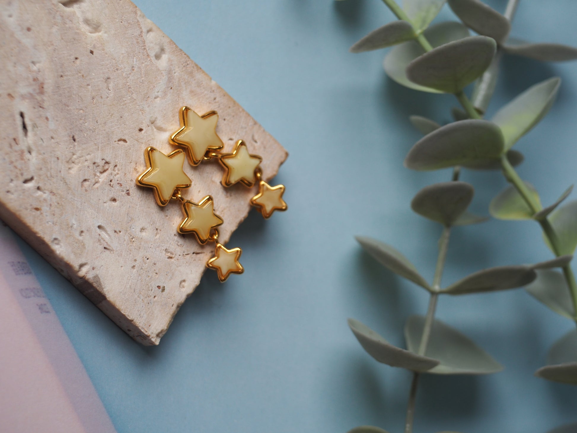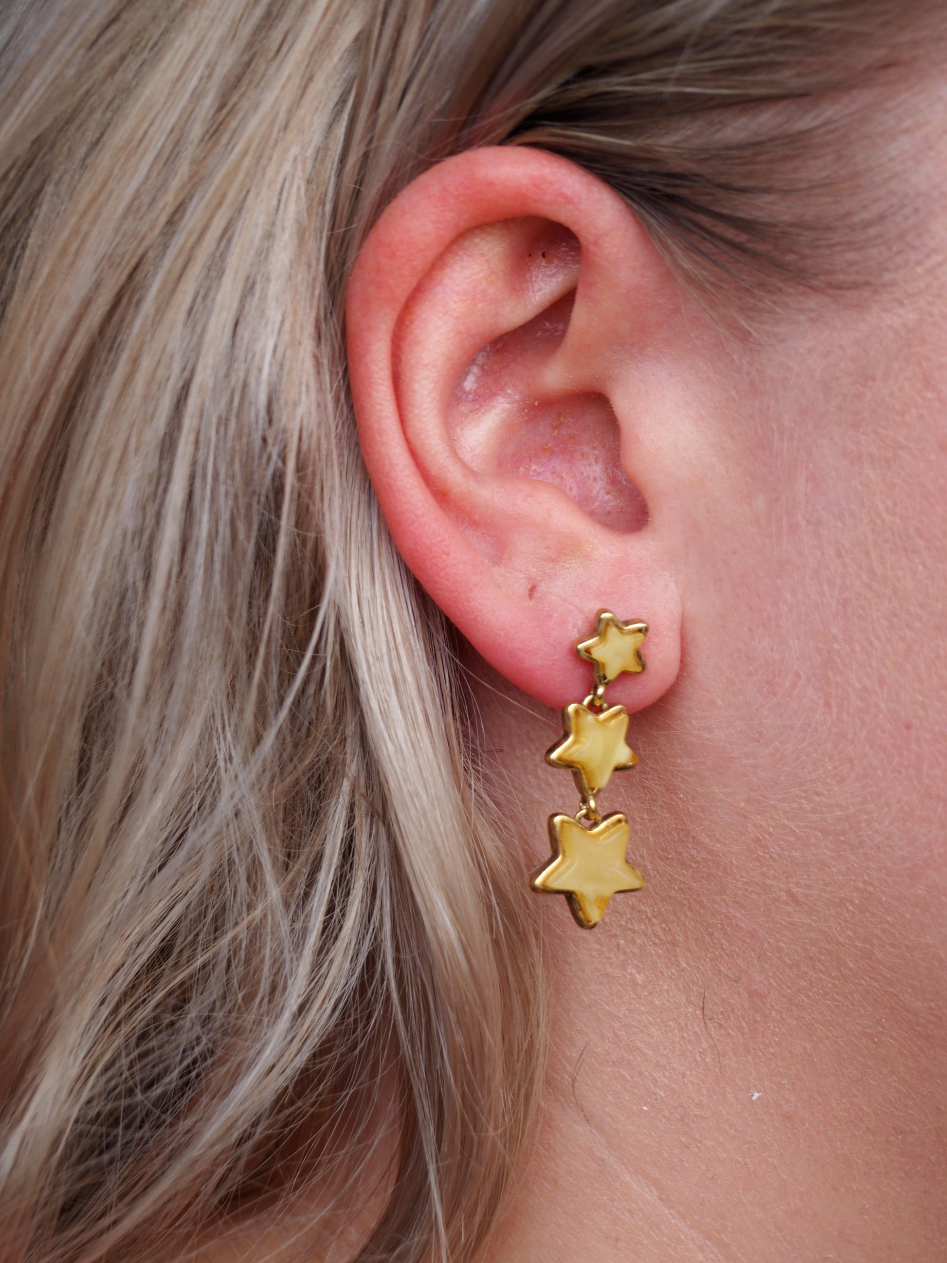 100% Natural Butterscotch Amber + Silver 925, 14k Gold Pleated. Three hanging stars, studs.