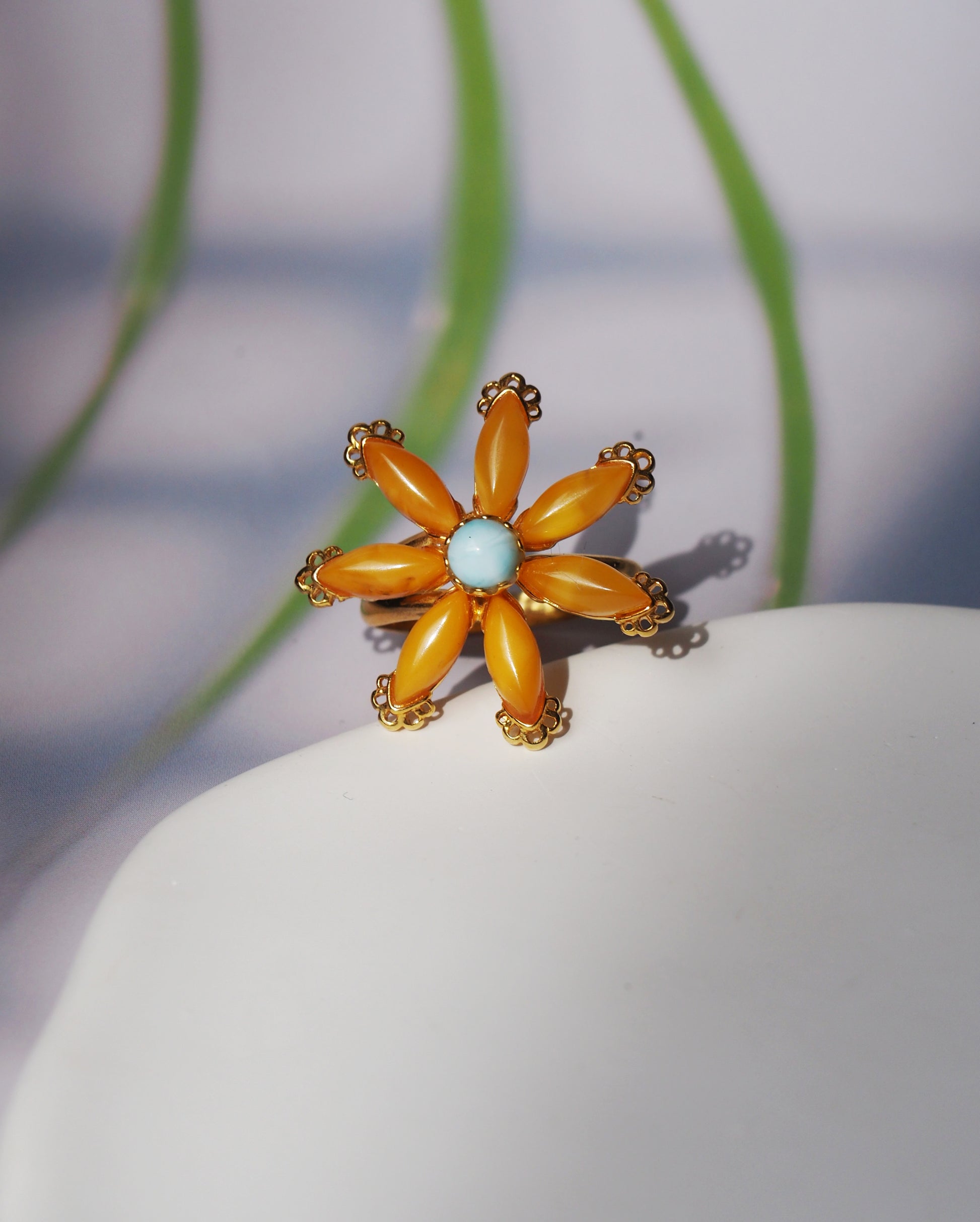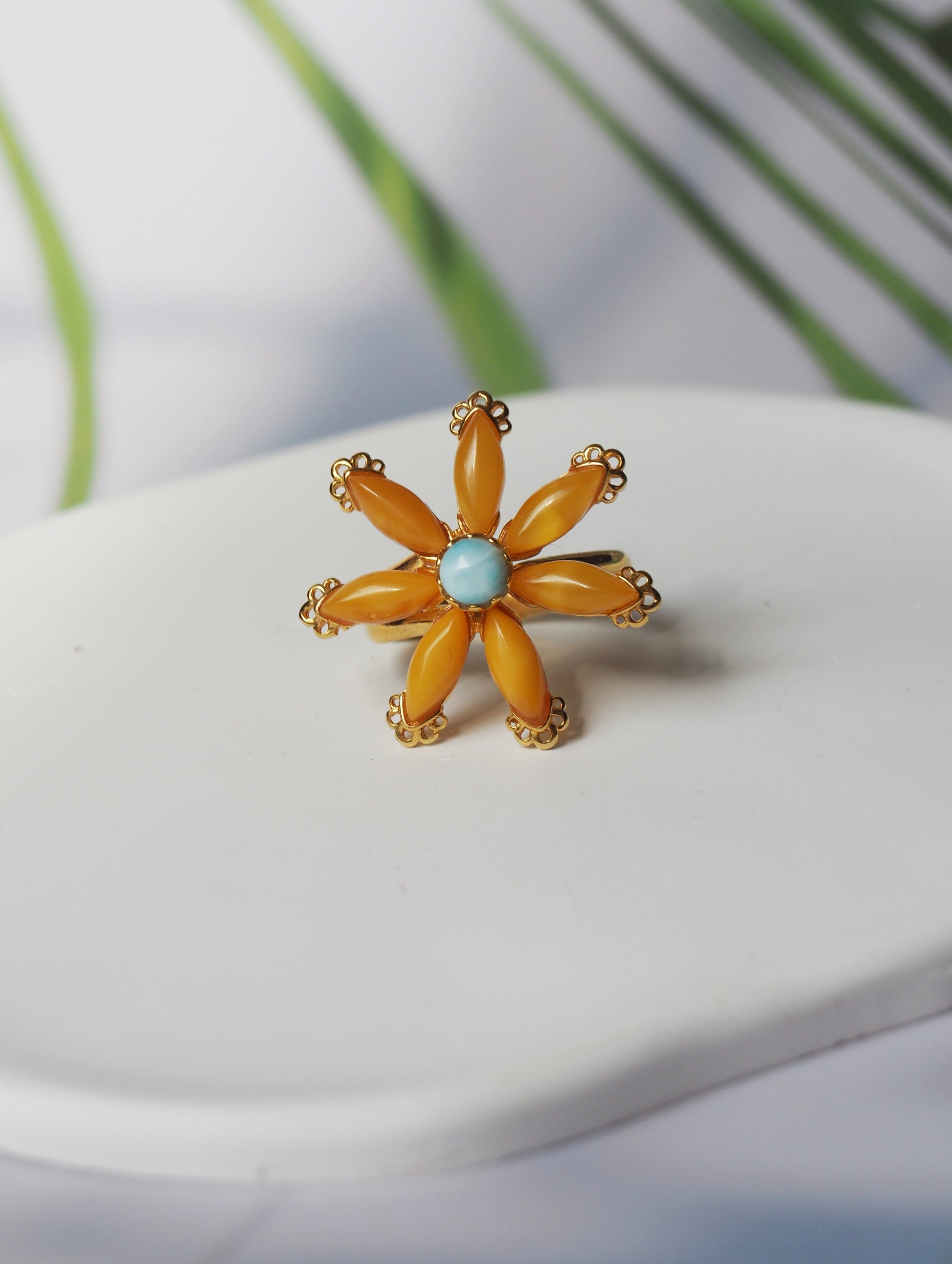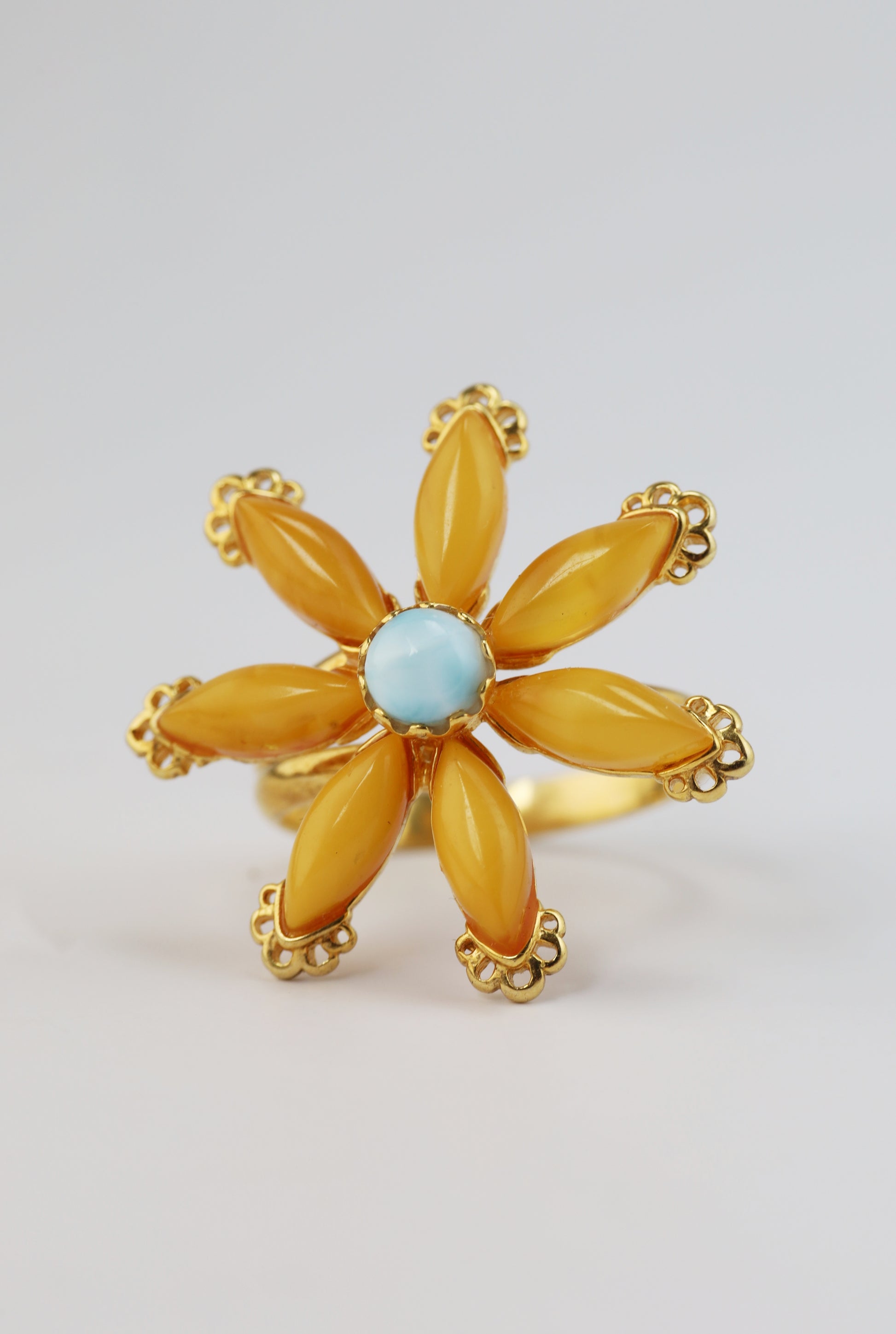 Deep Butterscotch Amber & Larimar Elegant Ring in Flower Shape in Gold Plated Silver