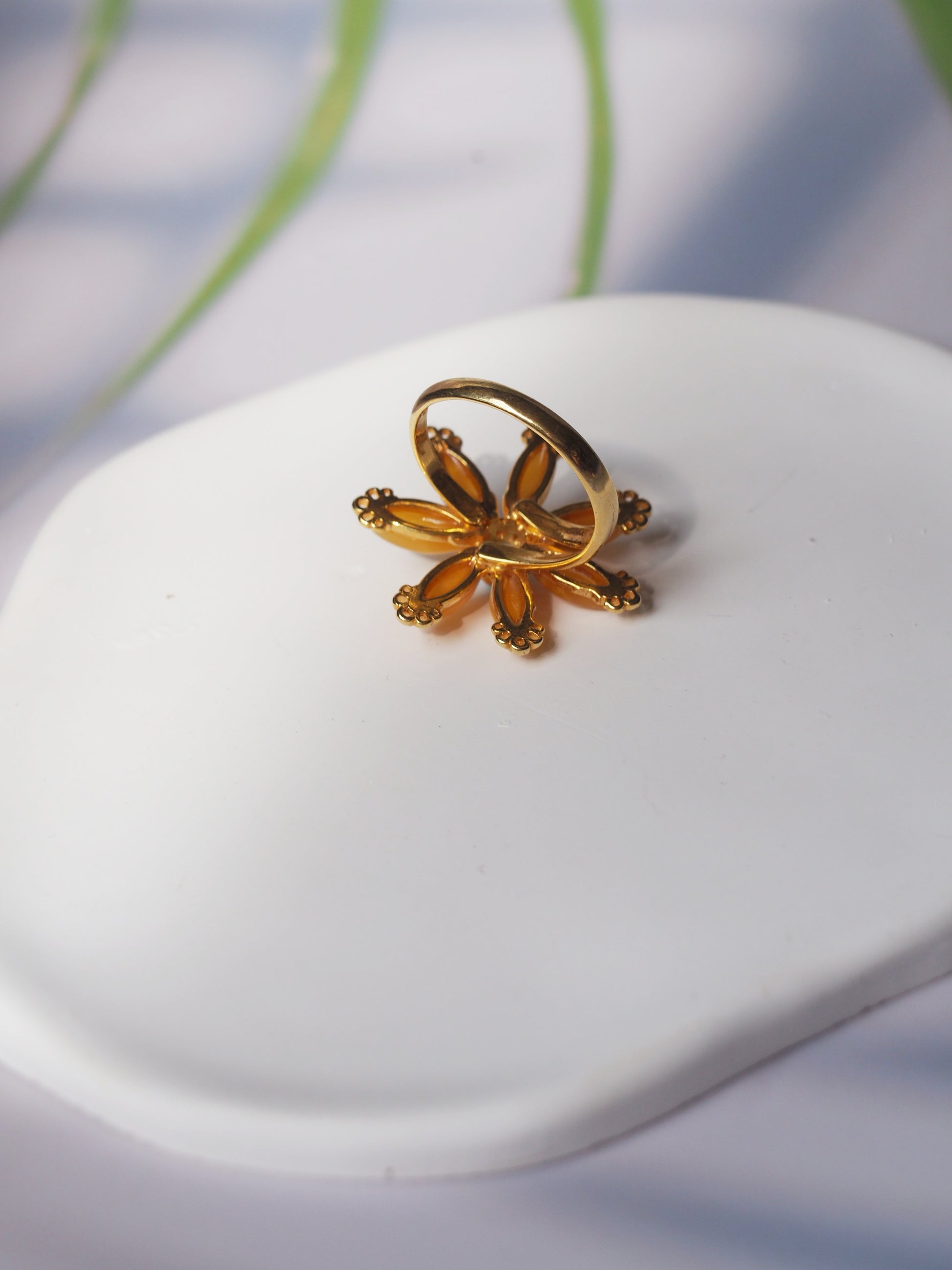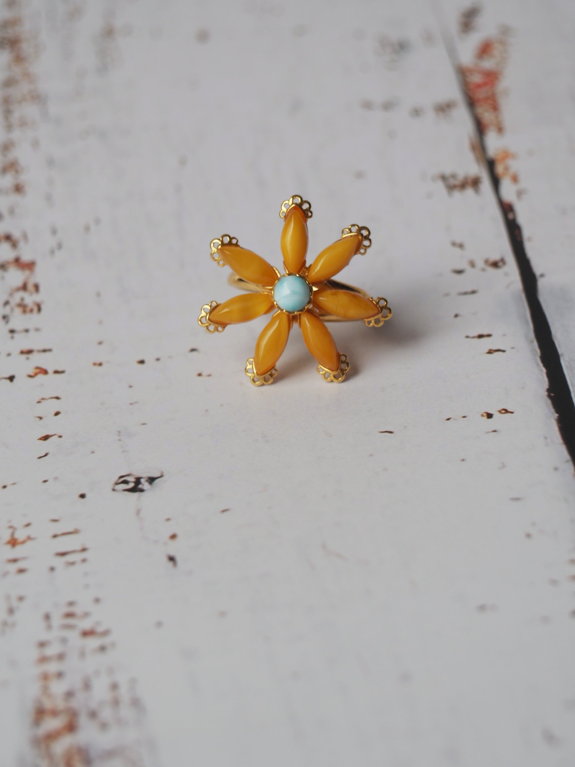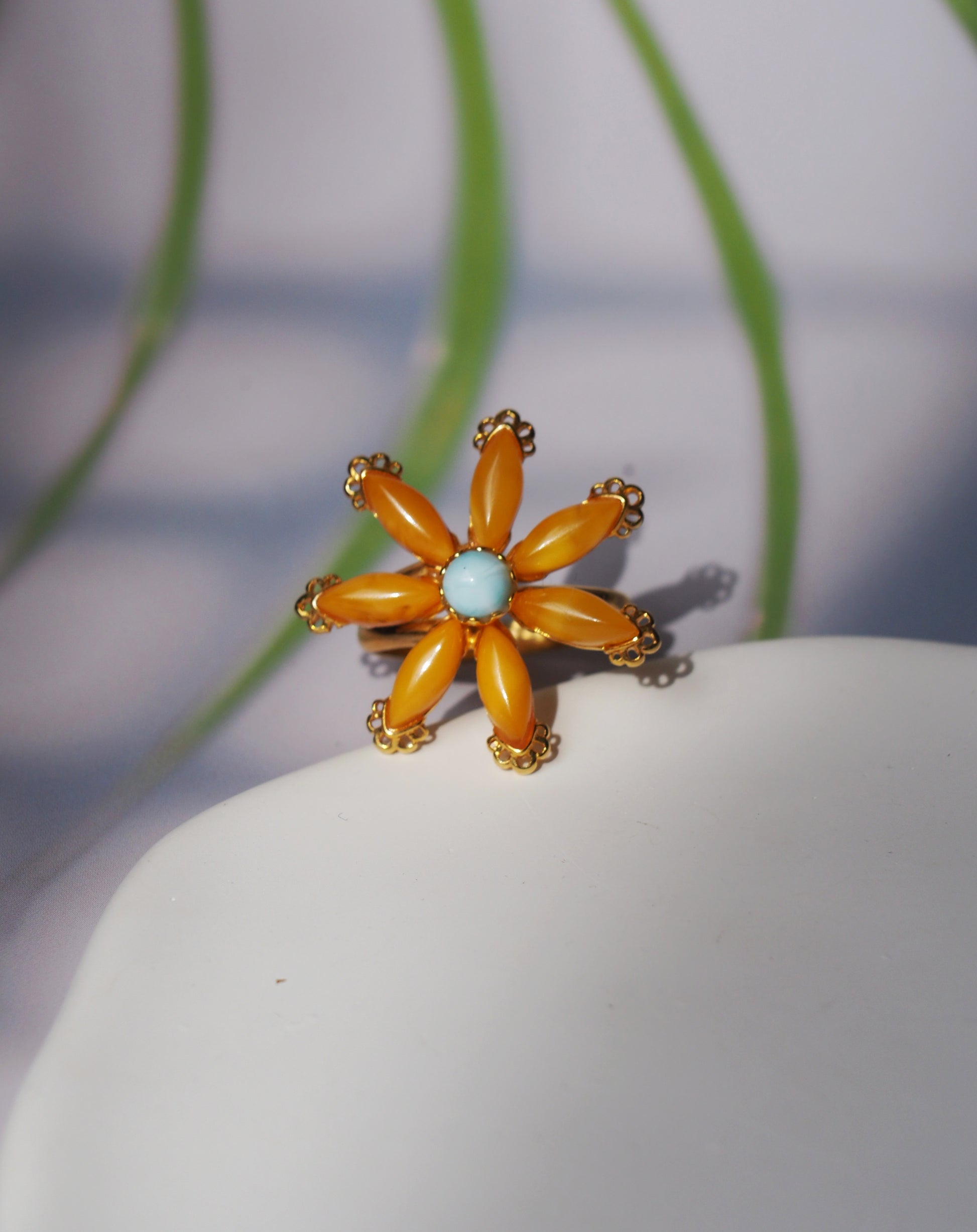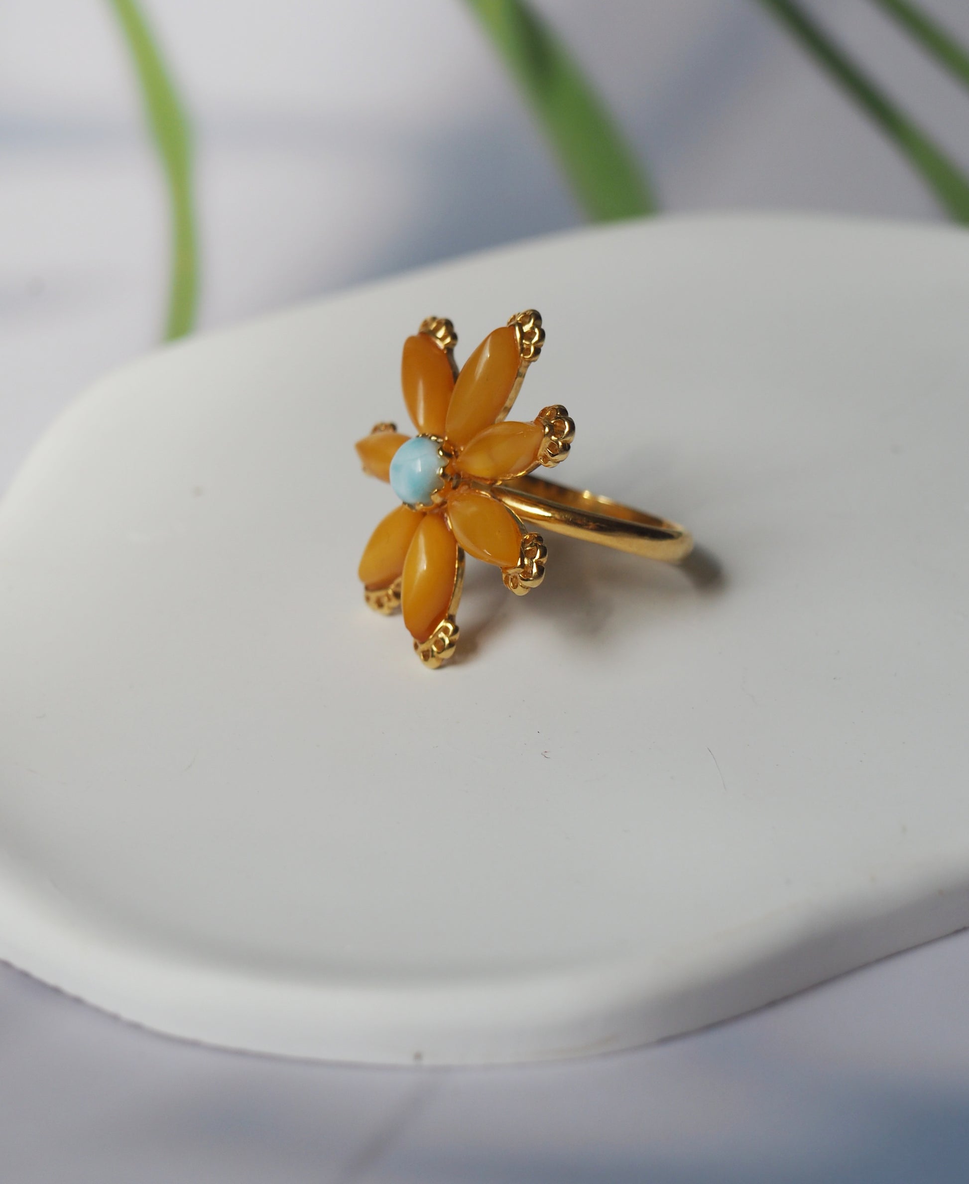 Deep Butterscotch Amber & Larimar Elegant Ring in Flower Shape in Gold Plated Silver
