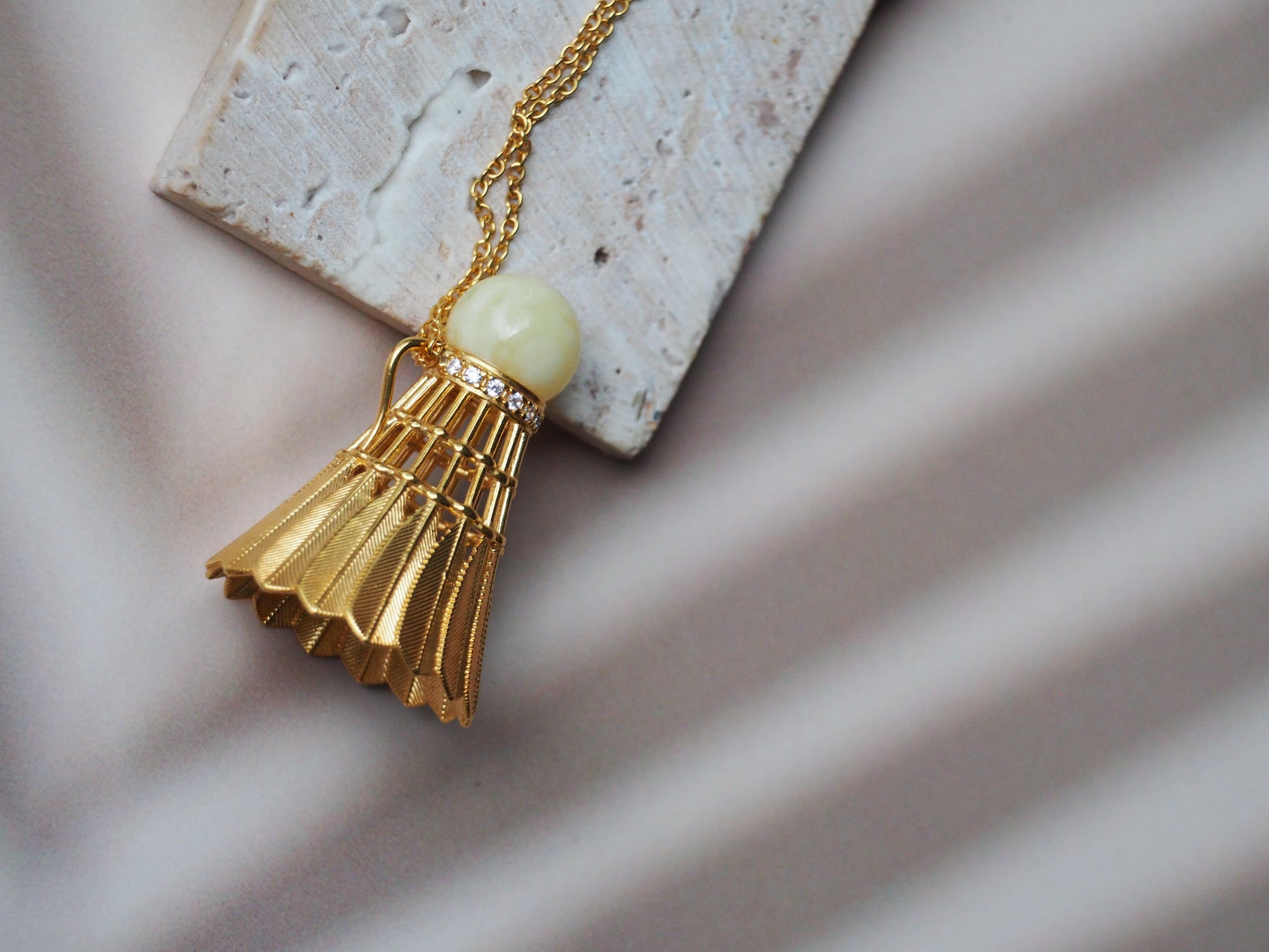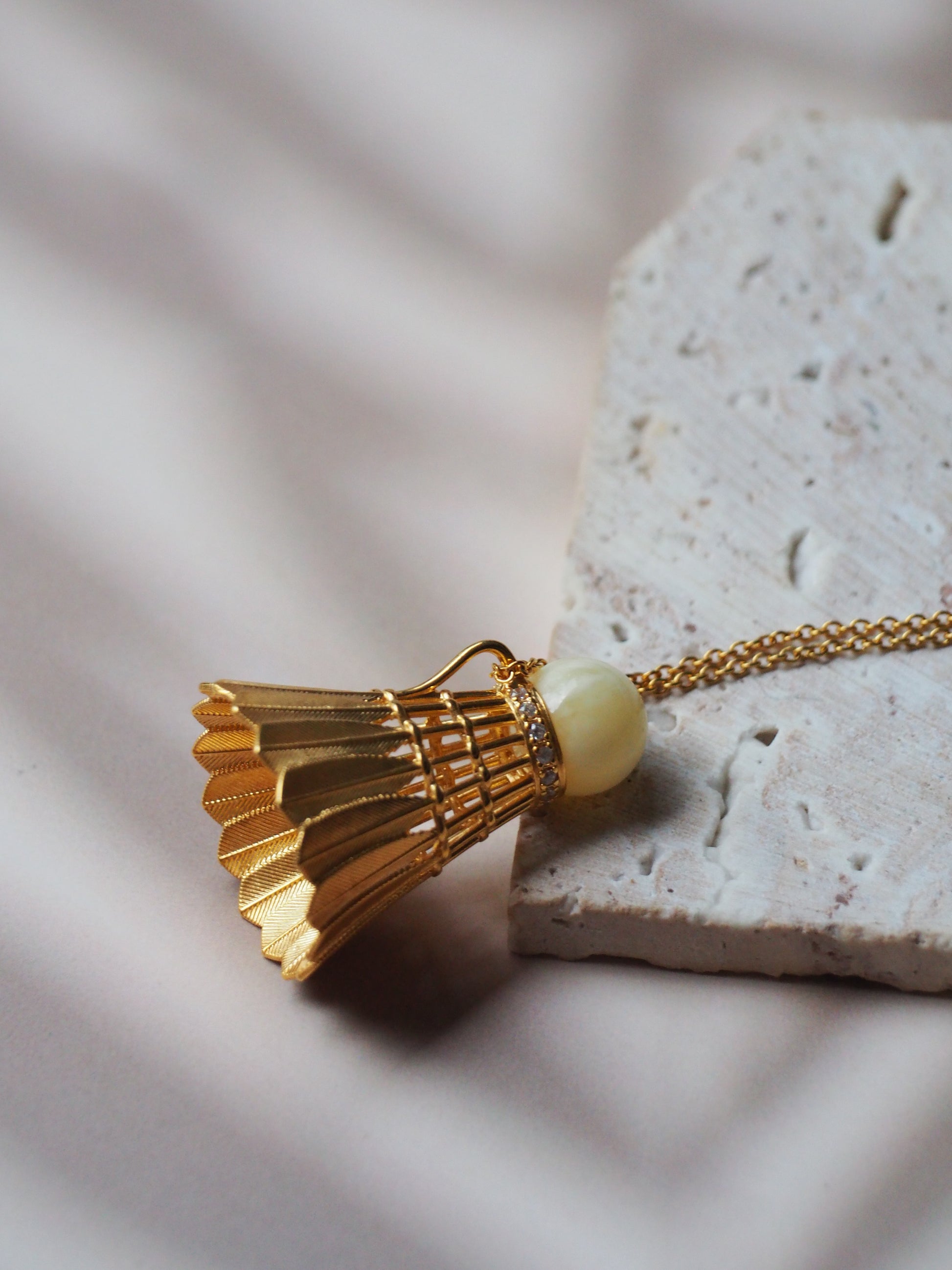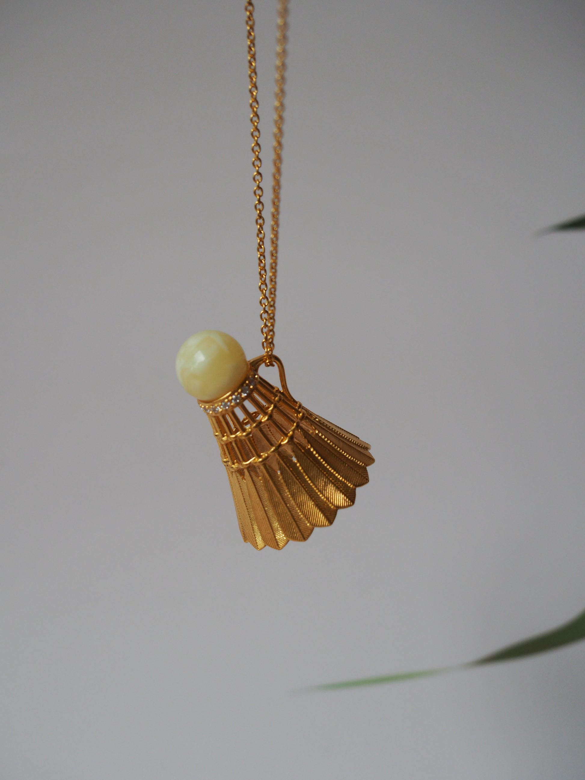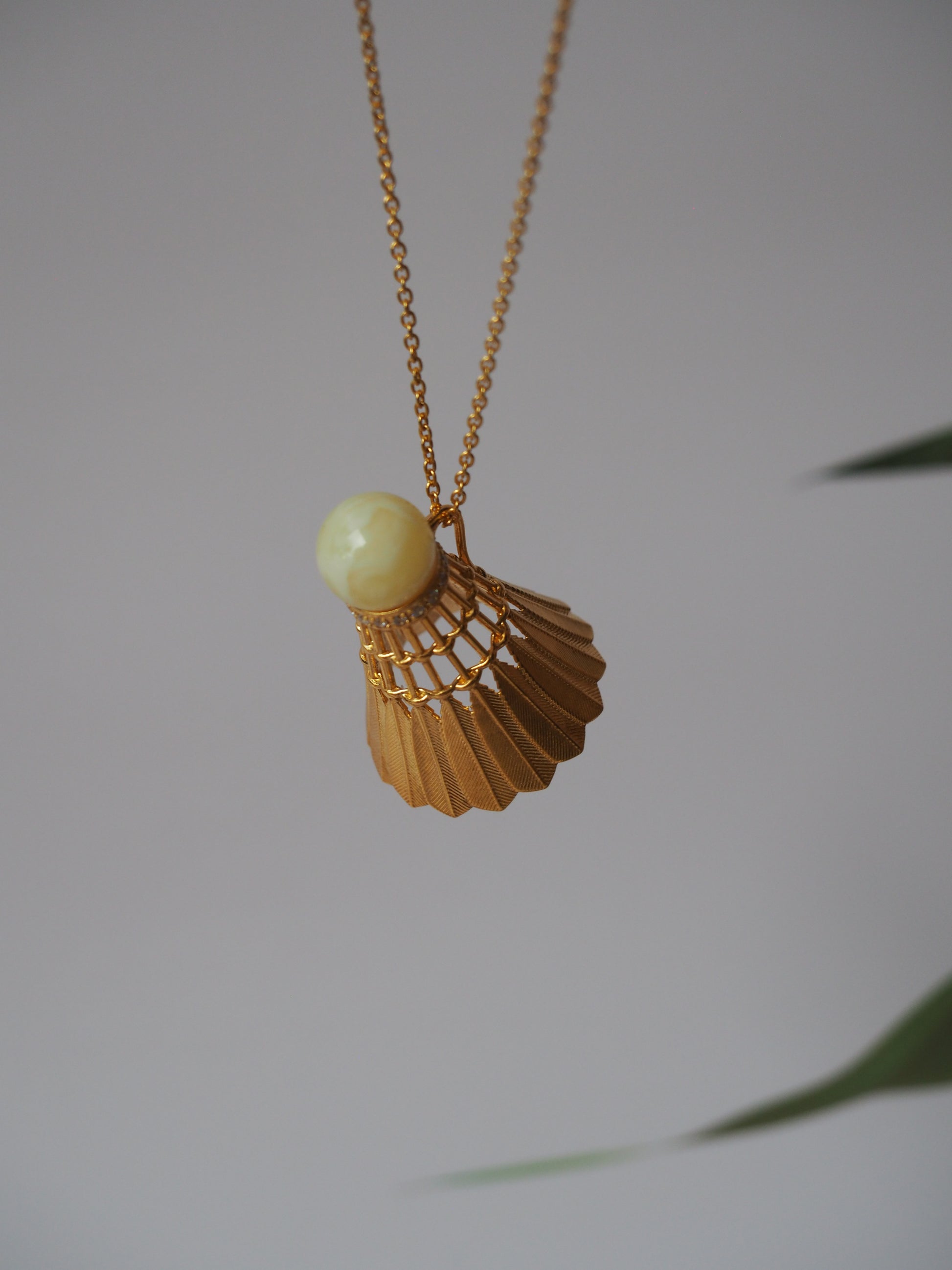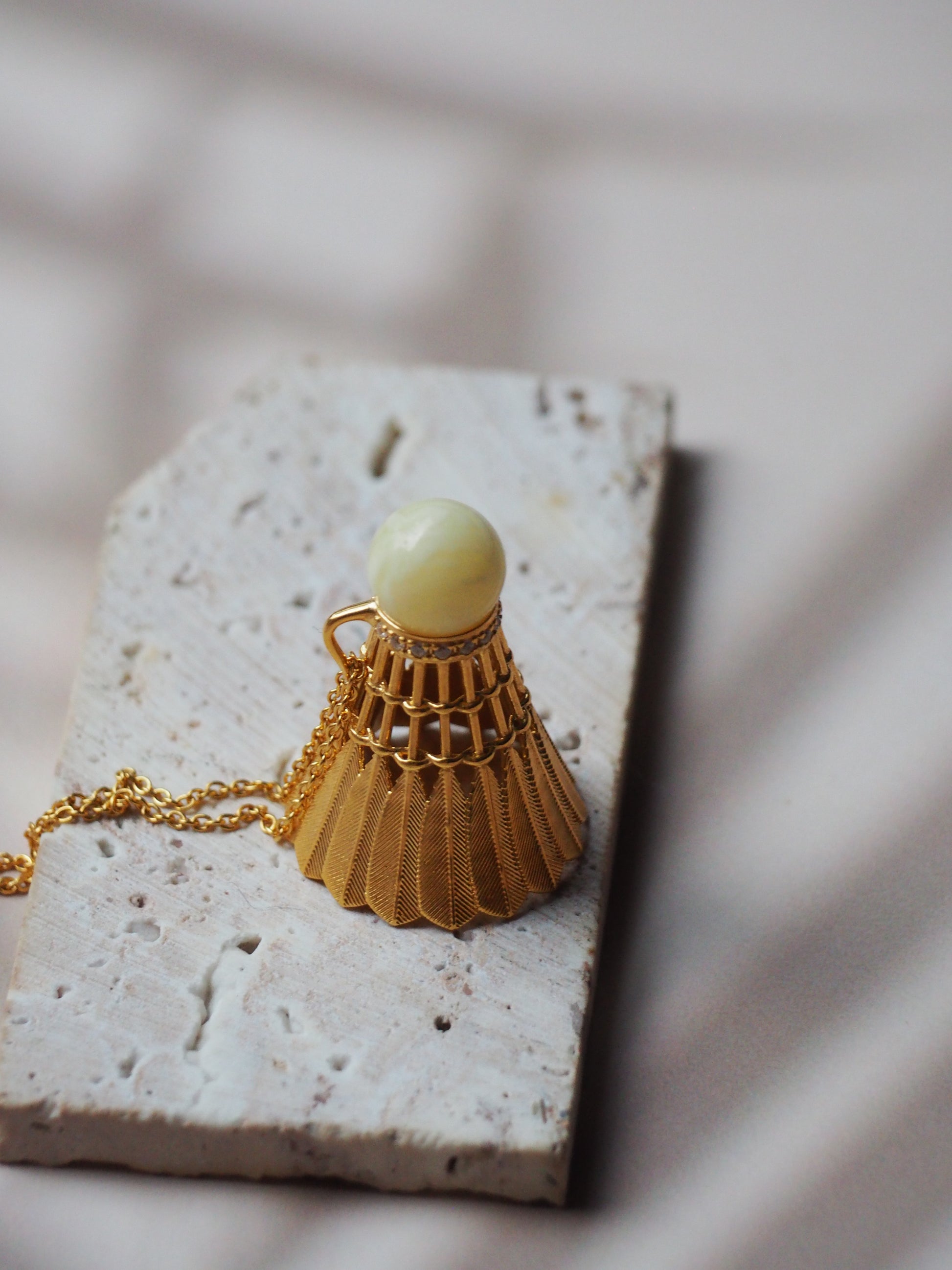 Feather Shuttlecock Shaped Natural Royal White Amber Pendant with Gold Plated Silver