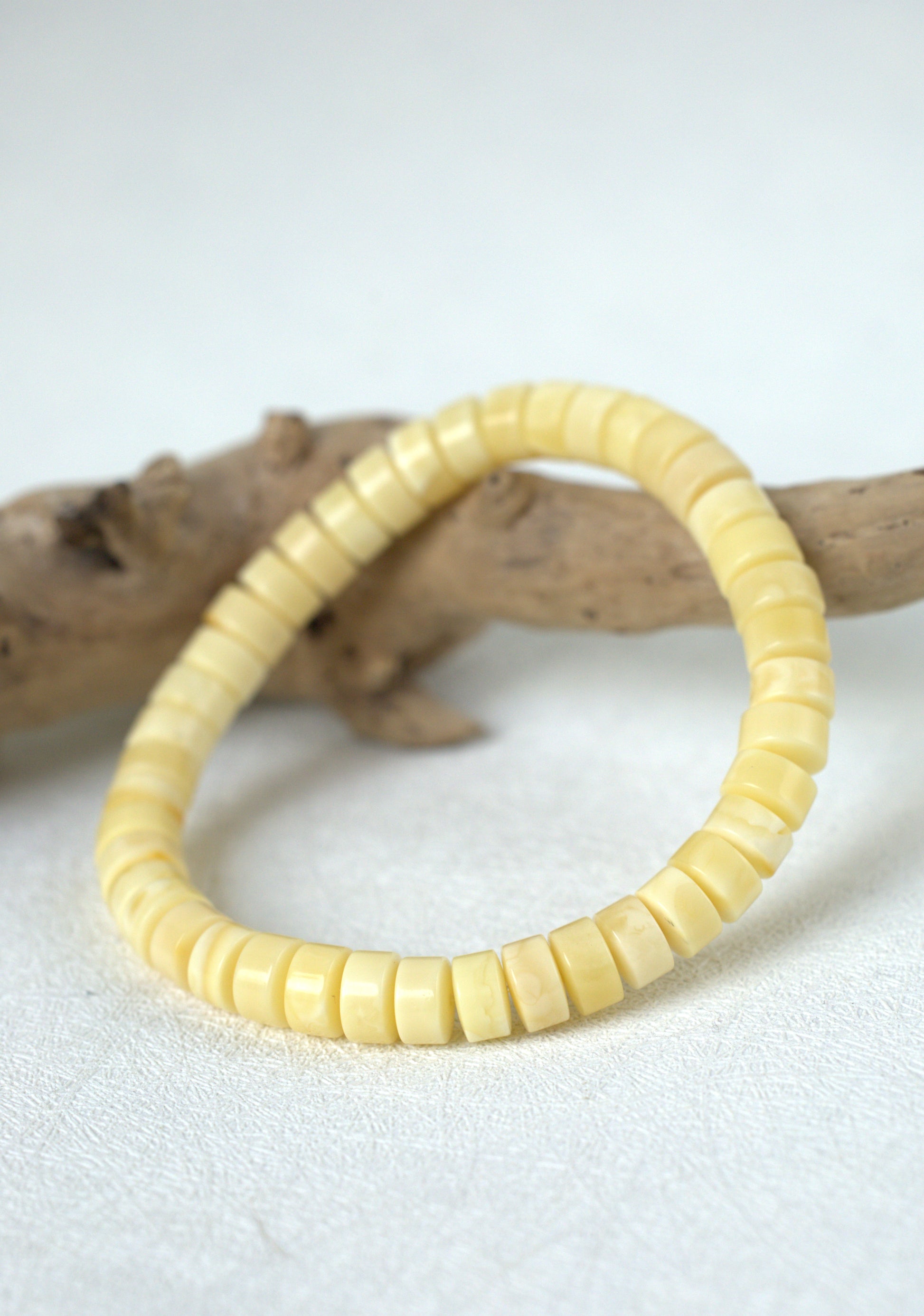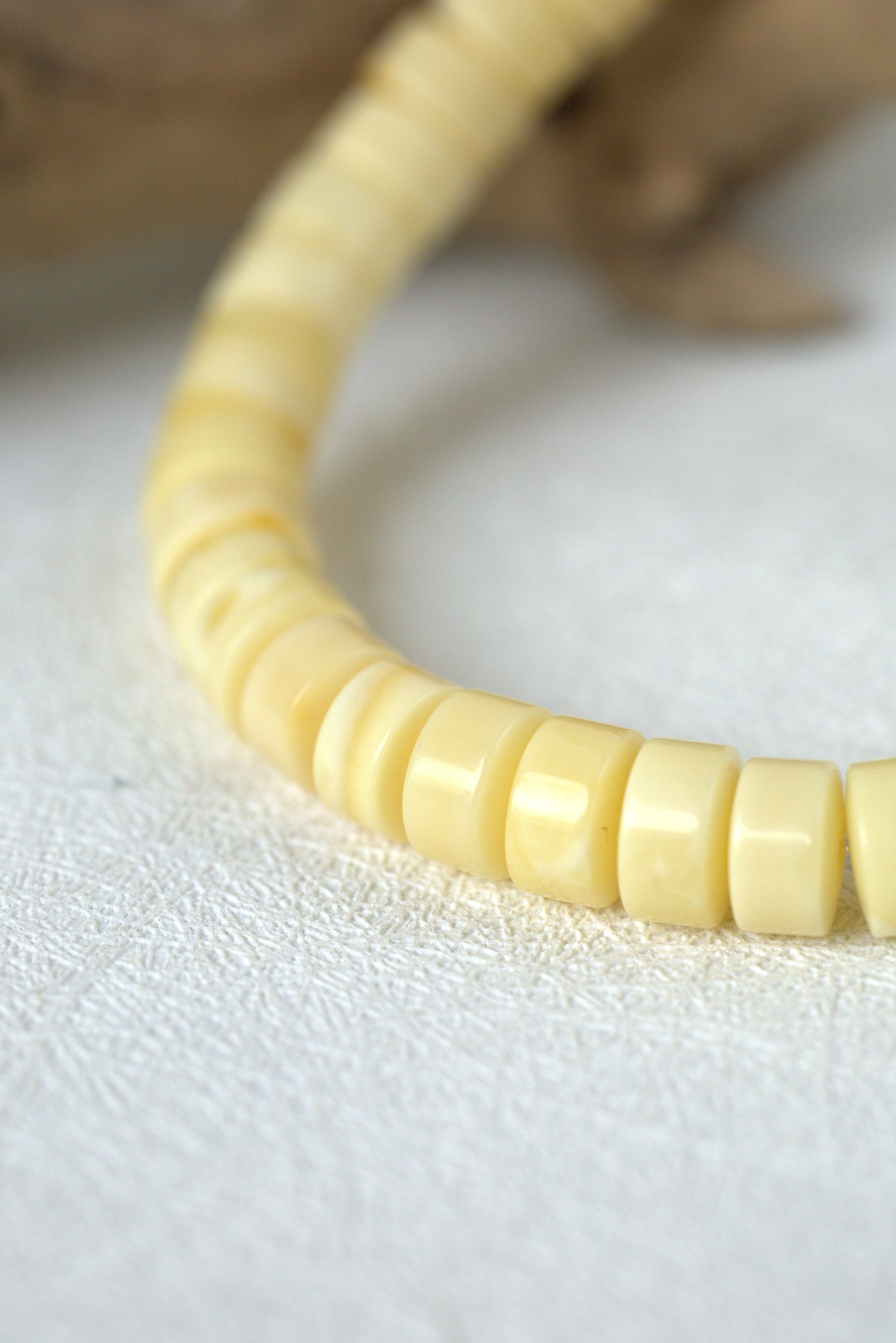 A light and elegant beaded bracelet crafted from milk and white amber, featuring smooth disc-shaped (donut) beads. Comfortable on the wrist and easy to wear daily, it will naturally age and develop character with use, enhancing its beauty over time.