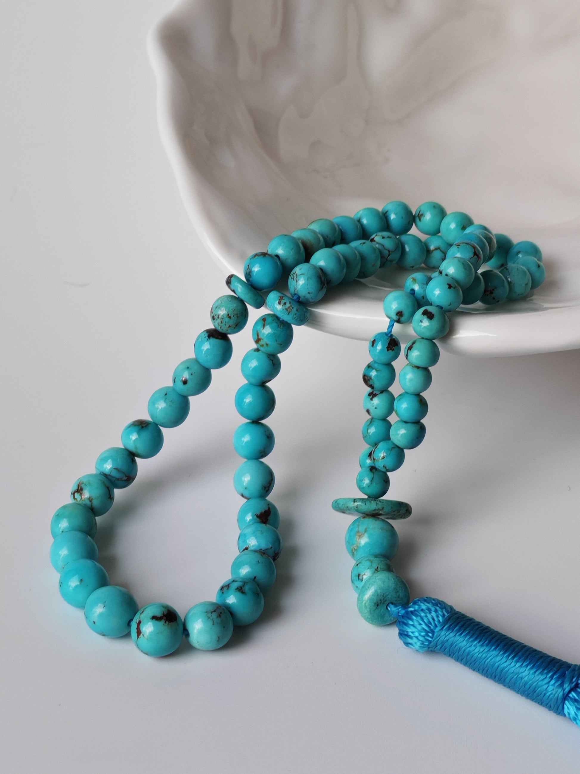 A refined and truly authentic Persian Turquoise rosary, crafted from 100% natural, untreated stones — not powdered or reconstituted. The 66 irregular beads exhibit a gentle gradient in size and tone, reflecting the natural charm and individuality of genuine turquoise.