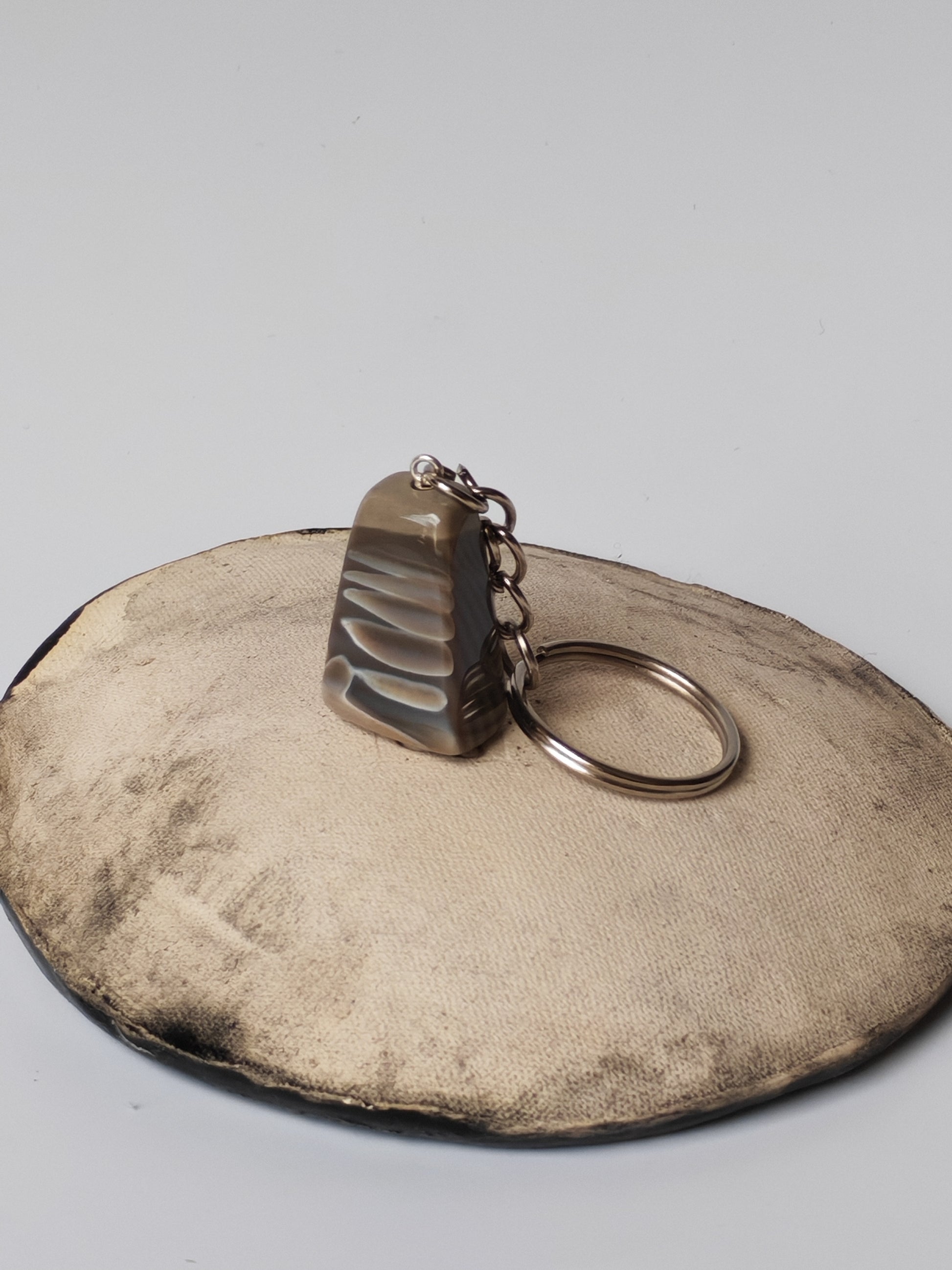 A distinctive monolith-shaped keychain crafted from authentic Striped Flint, a rare stone found only in Poland’s Świętokrzyskie Mountains. The piece showcases clearly visible natural stripes and stone markings, reflecting the ancient and organic beauty of this unique material.