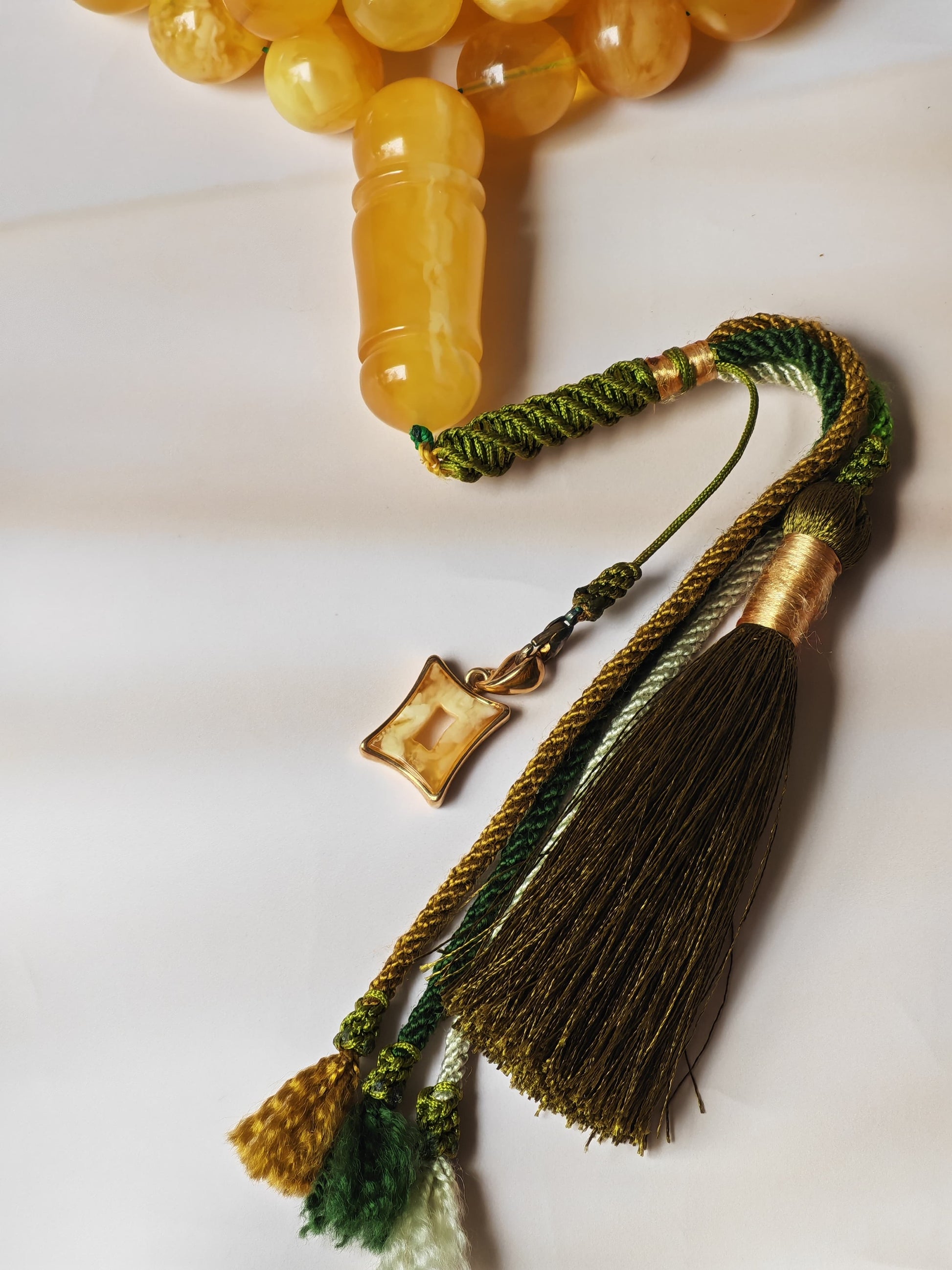 The piece is crowned with a large, bulky imam and complemented by a handmade tassel from Iraq, adorned with a cloudy amber pendant set in a gold-plated silver frame — a refined finishing touch to an already majestic creation.