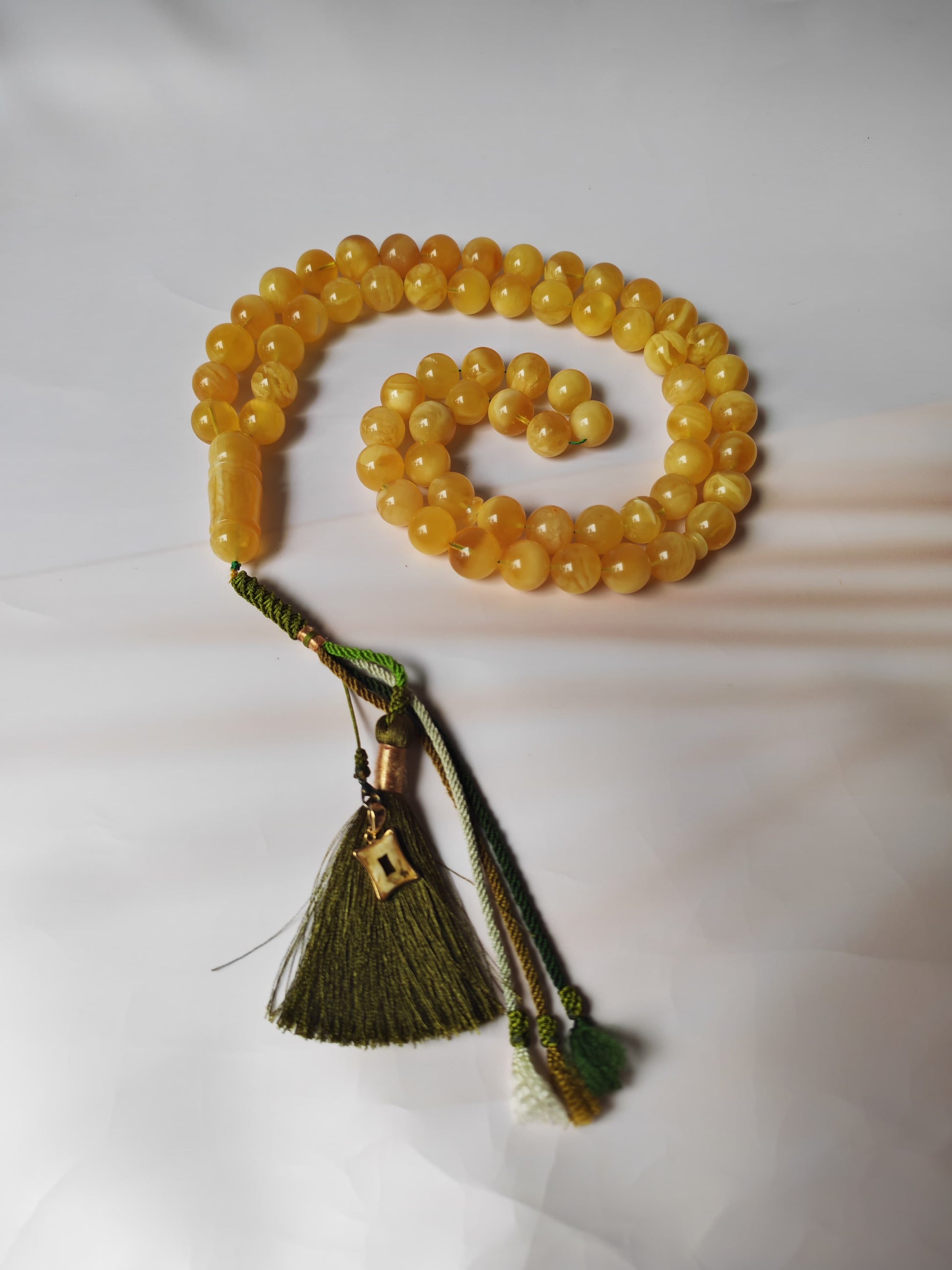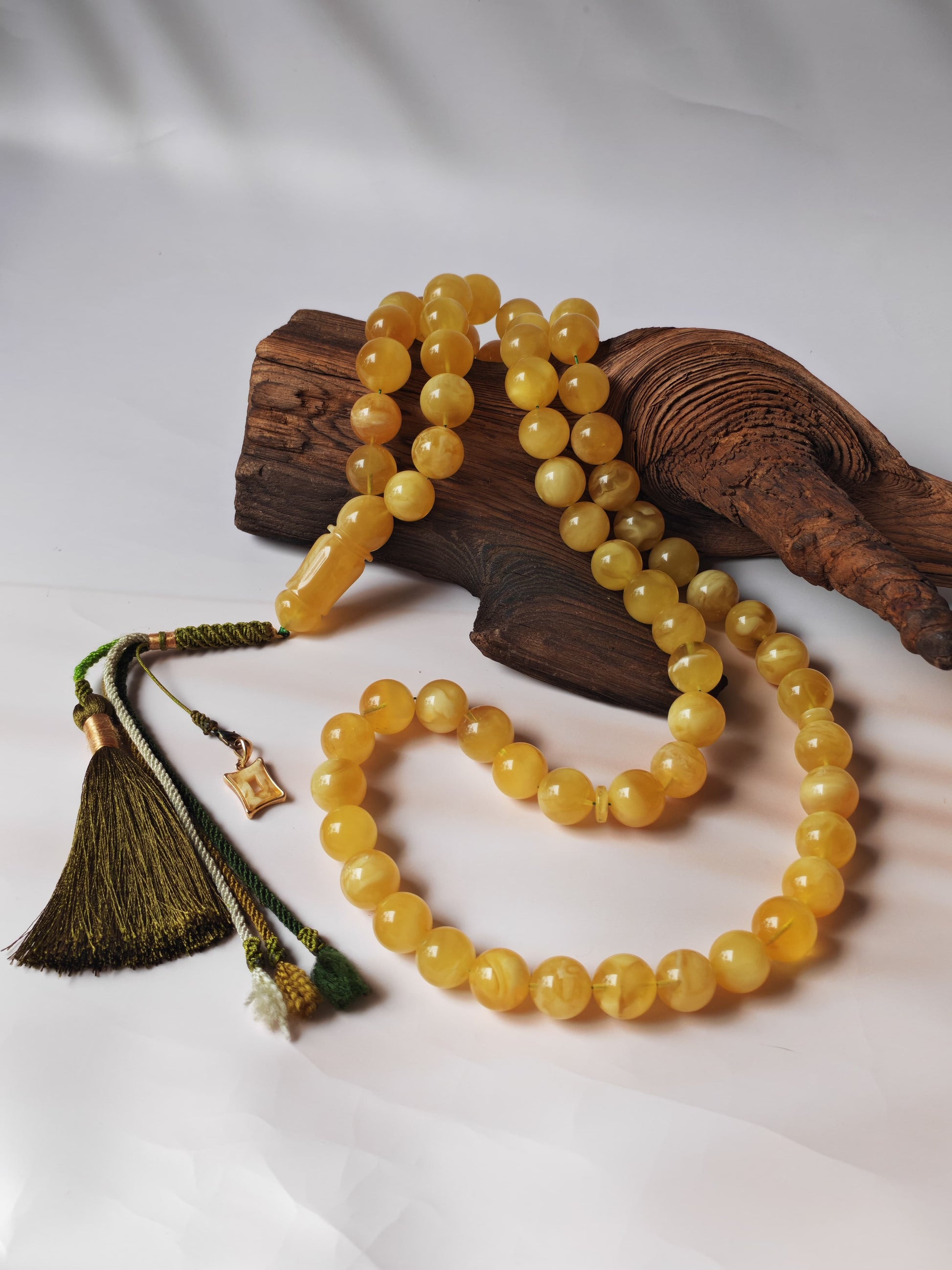 An extraordinary statement misbah of truly impressive scale and craftsmanship. This jumbo-sized rosary, weighing 124 grams, features large 14.5–15.5 mm beads in a mesmerizing half-half pattern, blending shades of cloudy amber, butterscotch, and honey with natural inclusions that make every bead unique.