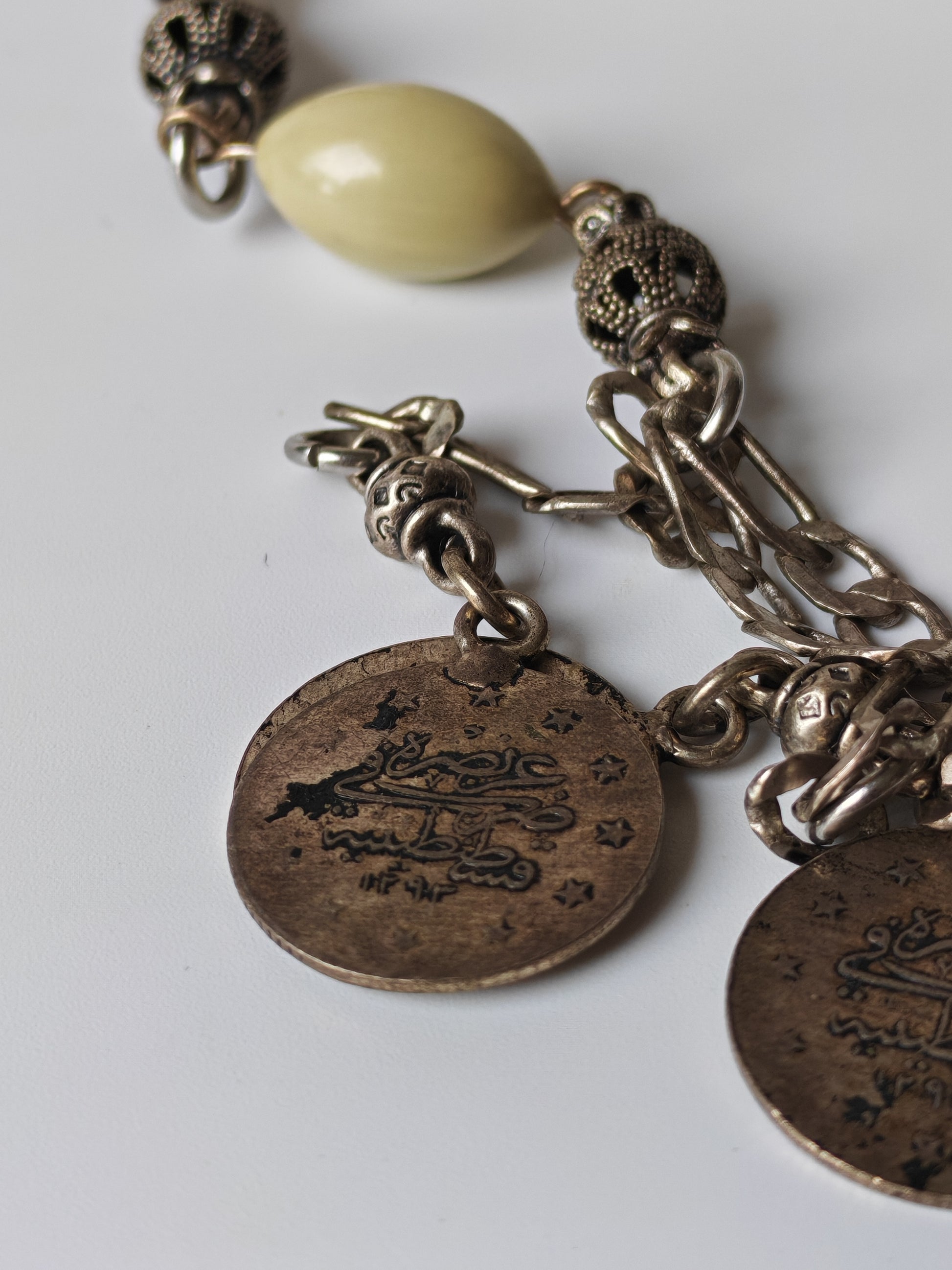 Comprising 49 olive-shaped beads plus one within the tassel, each bead displays its own distinctive dark grey veining set against a cloudy light grey base, making no two beads alike. The misbah is completed with a vintage silver tassel adorned with three silver coins, and comes with 17 spare beads, an imam, and two dividers — a true treasure for collectors who appreciate rare materials with a storied past.