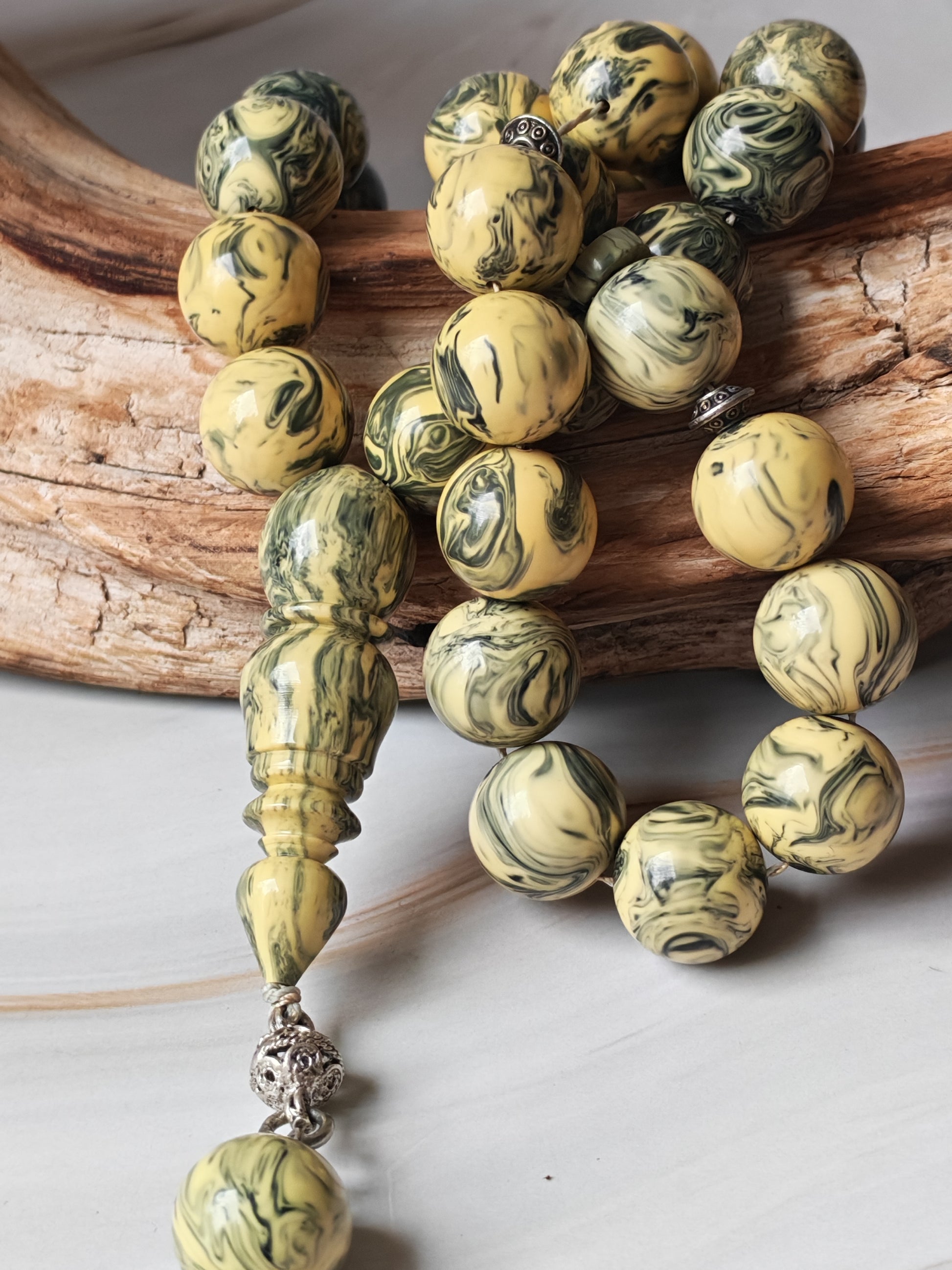 Wide range of colors from light milky green to dark olive, beads in different shades of green and aged milk, yellow, depending on the raw material. Cloudy and stormy waves in each bead and imam.