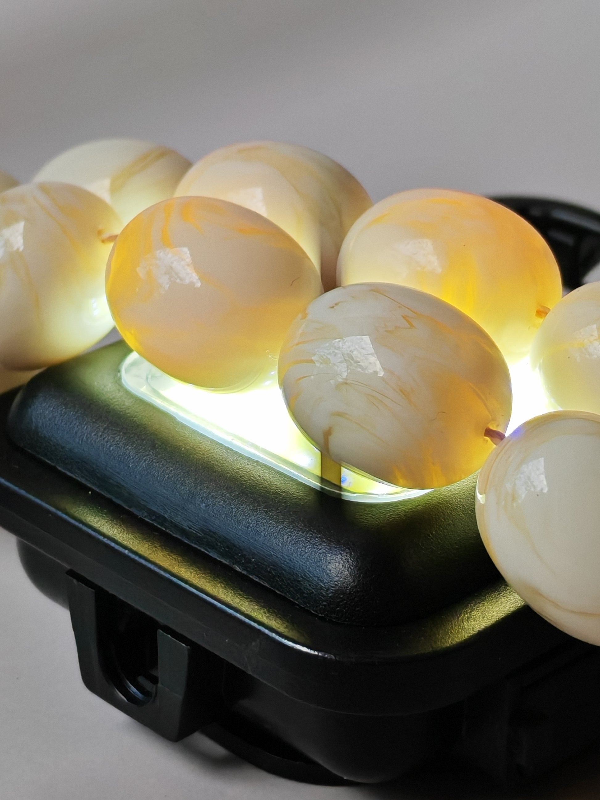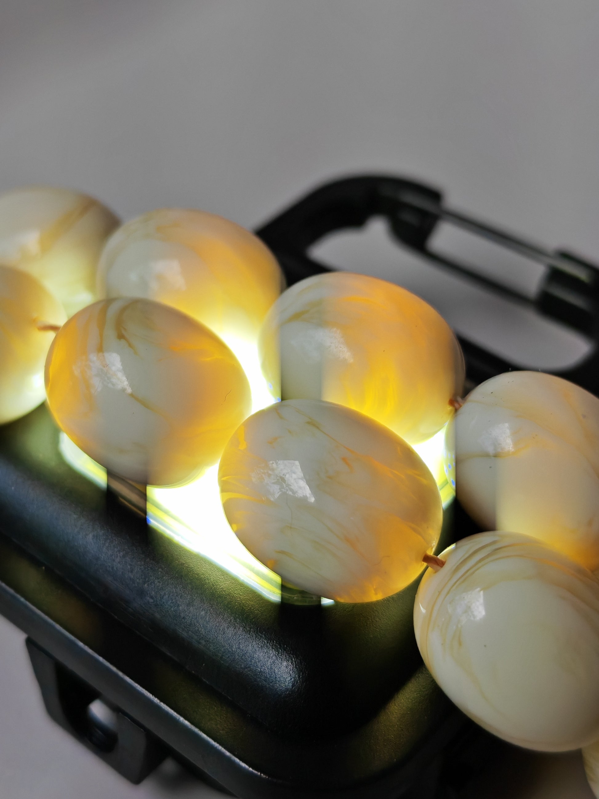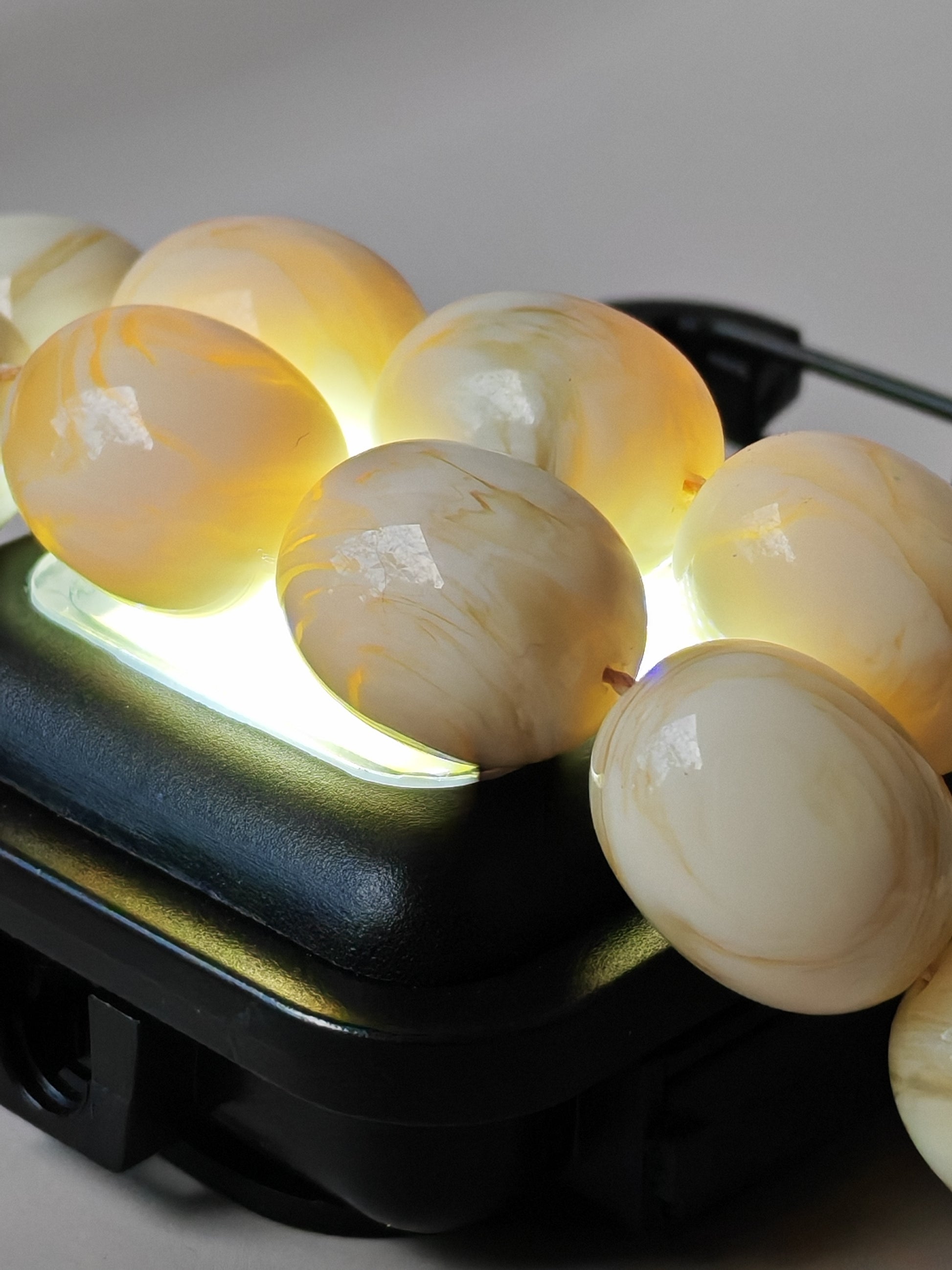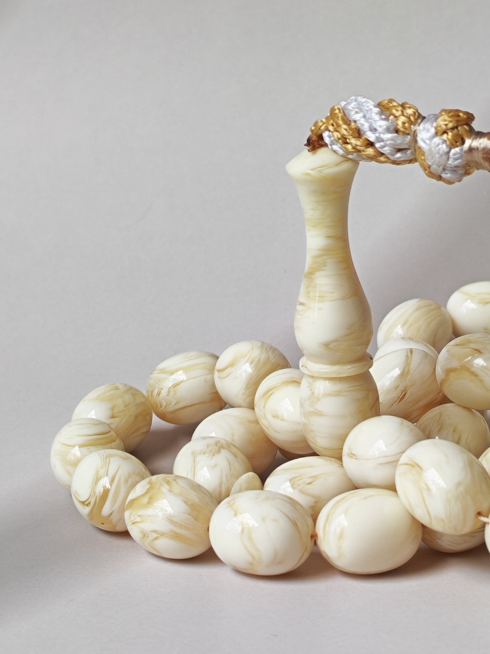 A refined 33-bead tasbih crafted from authentic French Galalith, a prized vintage material known for its silky texture and timeless elegance. The original cylinder pipe beads are distinguished by their white body streaked with vivid yellow “tornado” veins, creating a captivating natural pattern unique to each piece. Elegant in form and rich in character, Tornado Veins embodies the harmony of French craftsmanship and classic design—an exquisite addition to any refined collection.