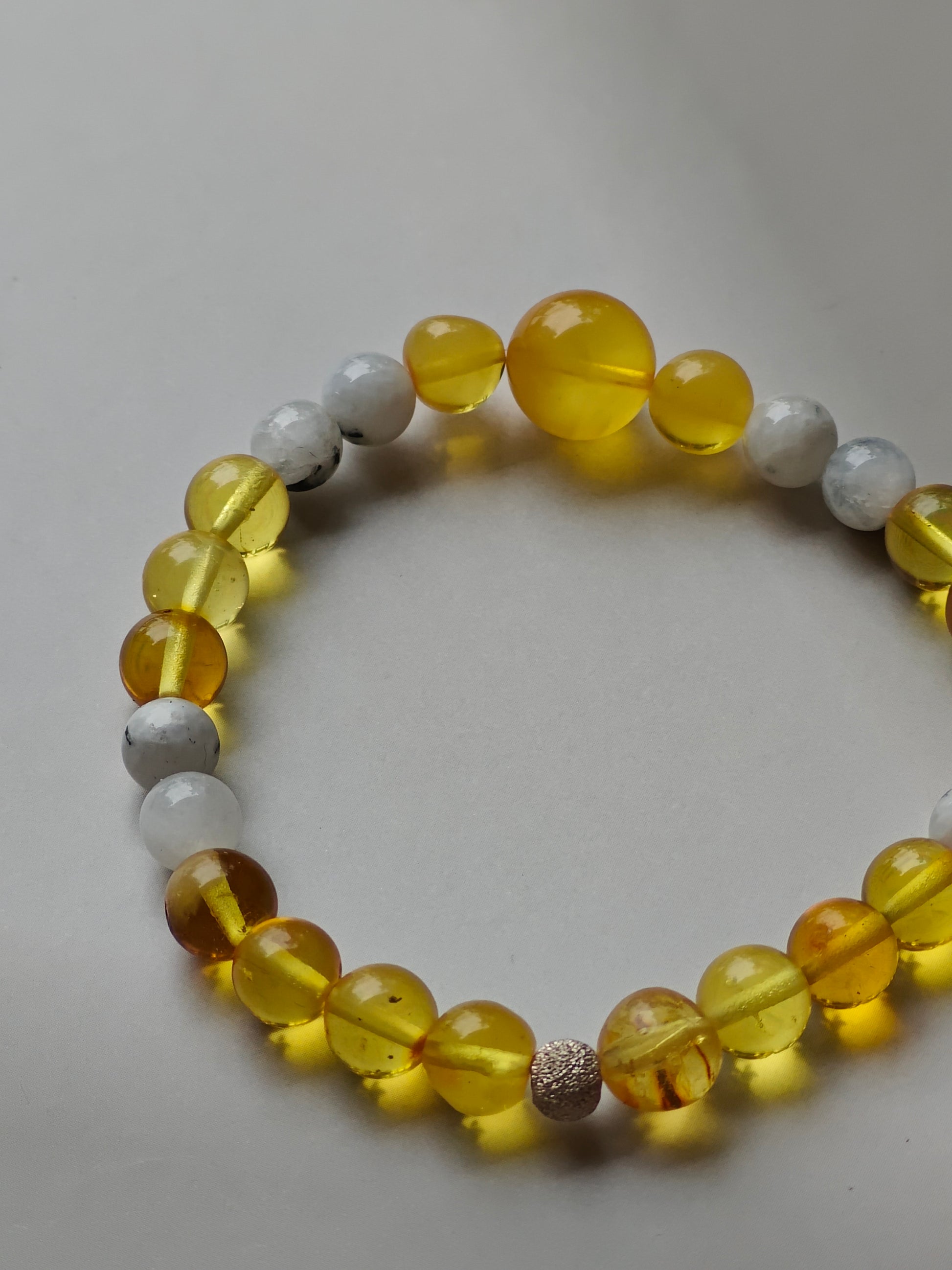 A delicate beaded bracelet crafted from transparent citron amber with natural inclusions, paired with soft moonstones for a gentle contrast. At the center sits one larger cloudy amber bead, subtly highlighted with a small silver accent bead, adding a refined focal point to the design.