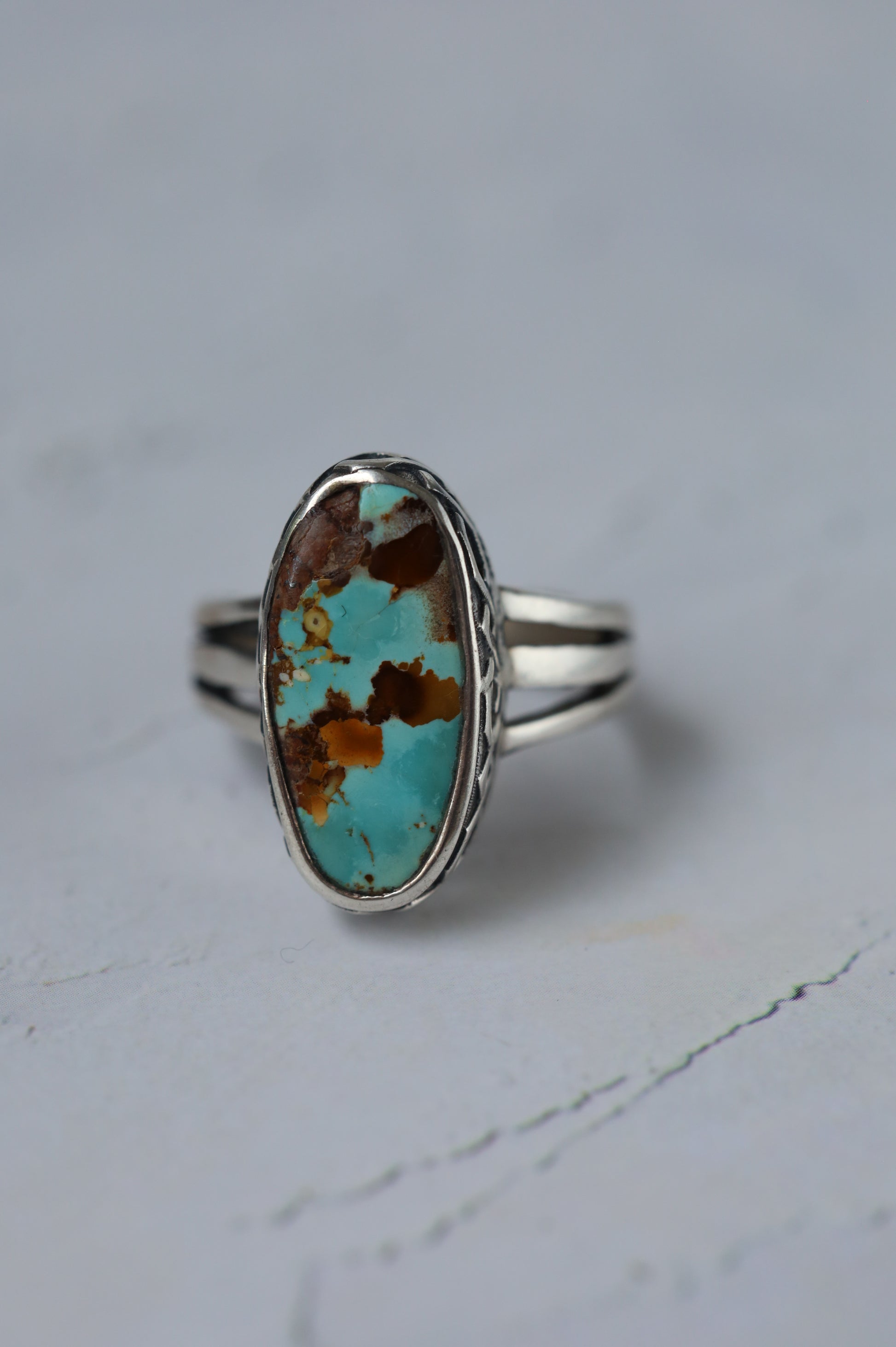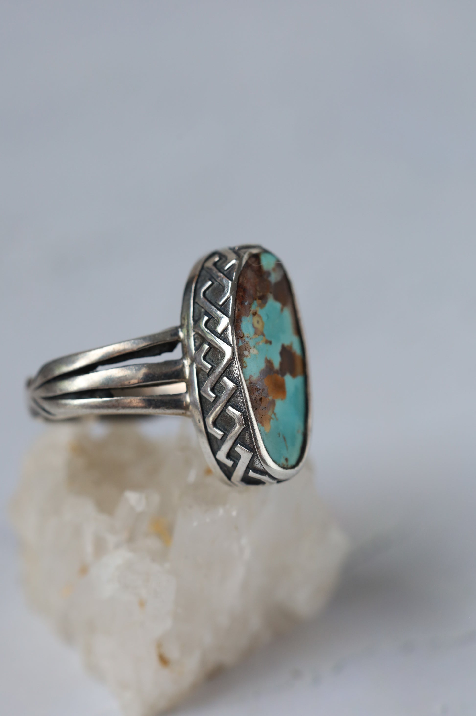 A refined unisex ring set with natural Persian turquoise from Neyshabur, framed in 925 sterling silver. The long oval stone and vintage-inspired design give the piece timeless character. Made in a fixed size, it’s a classic, elegant ring highlighting the beauty of genuine turquoise.