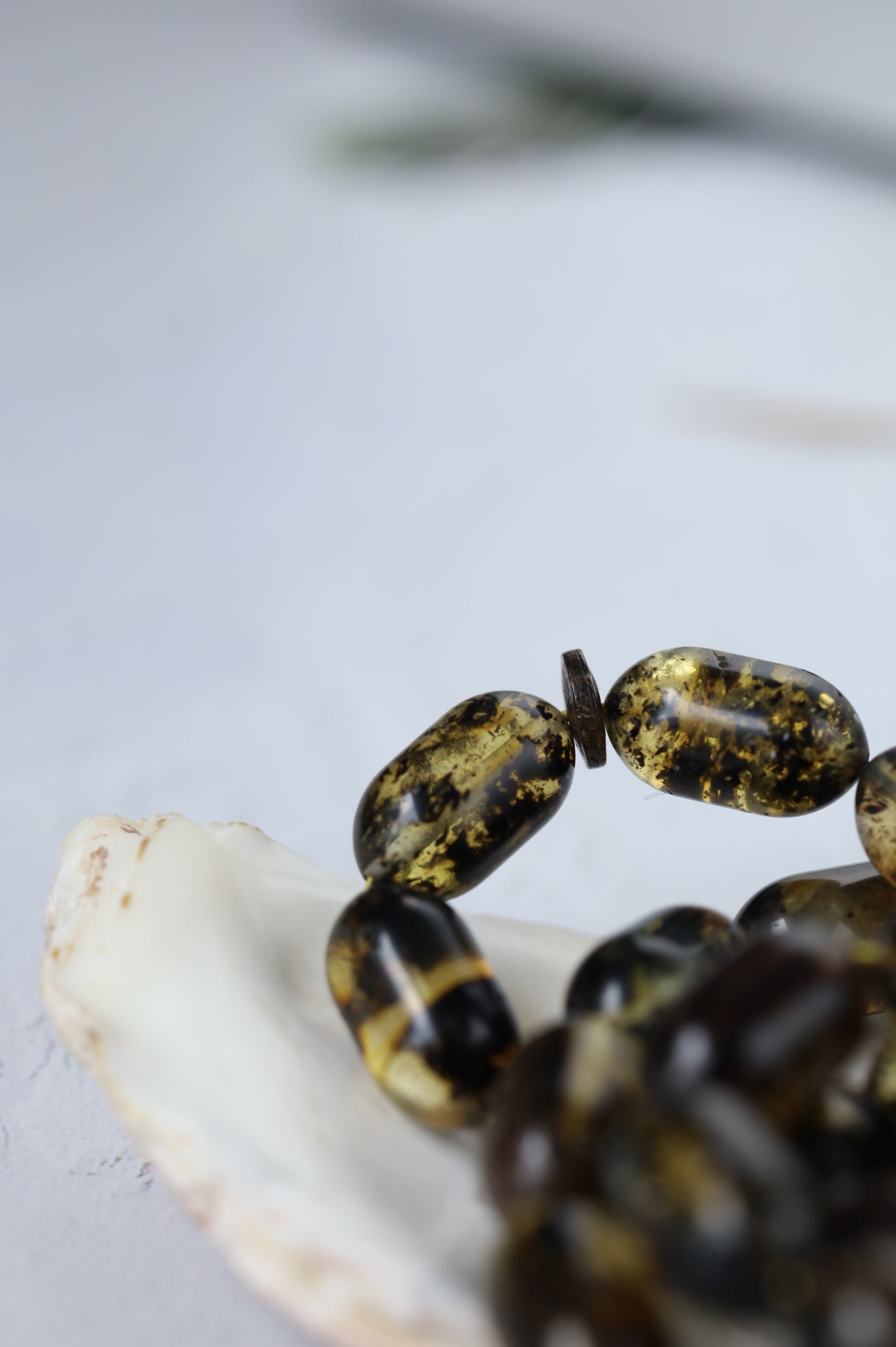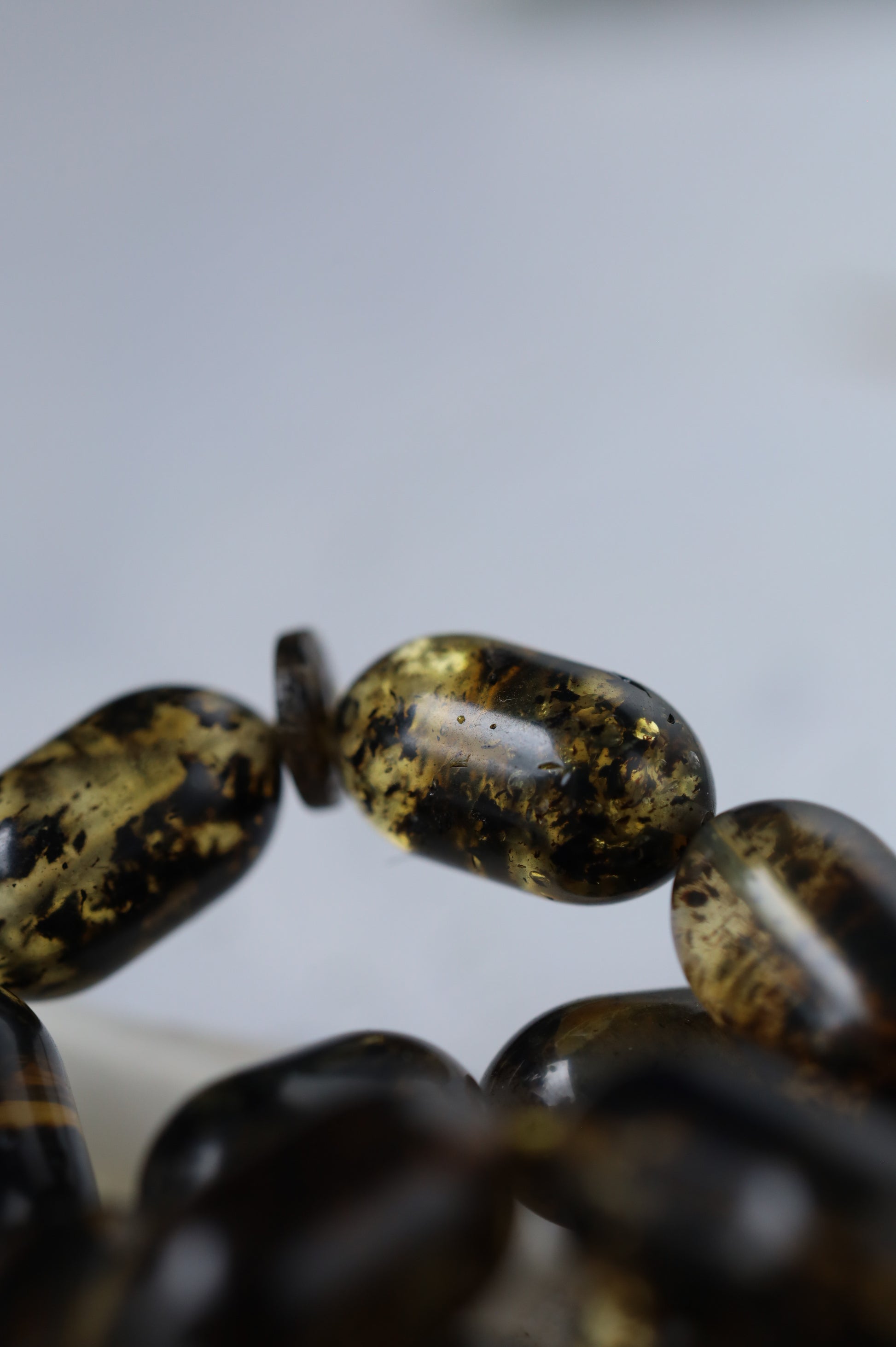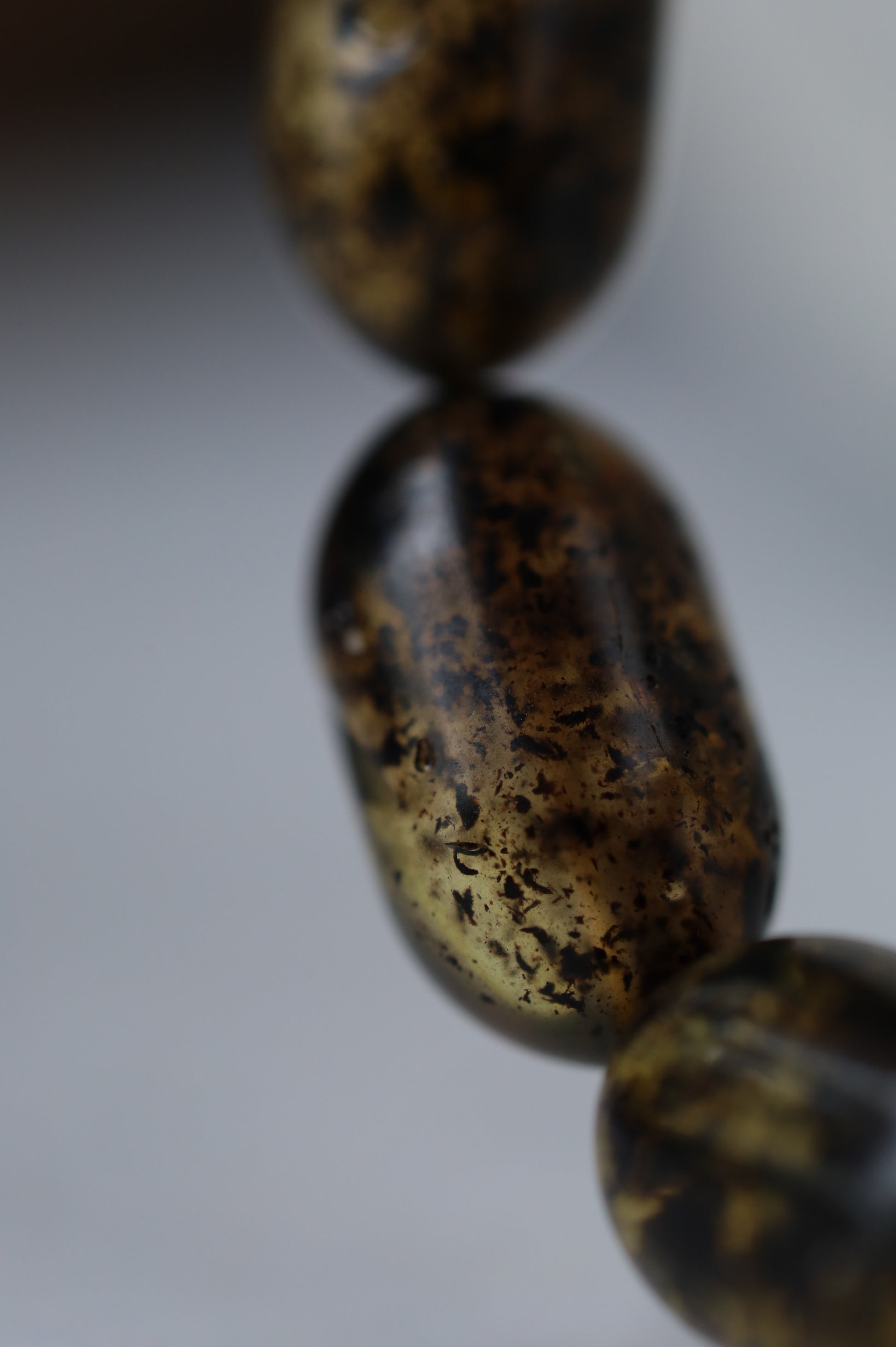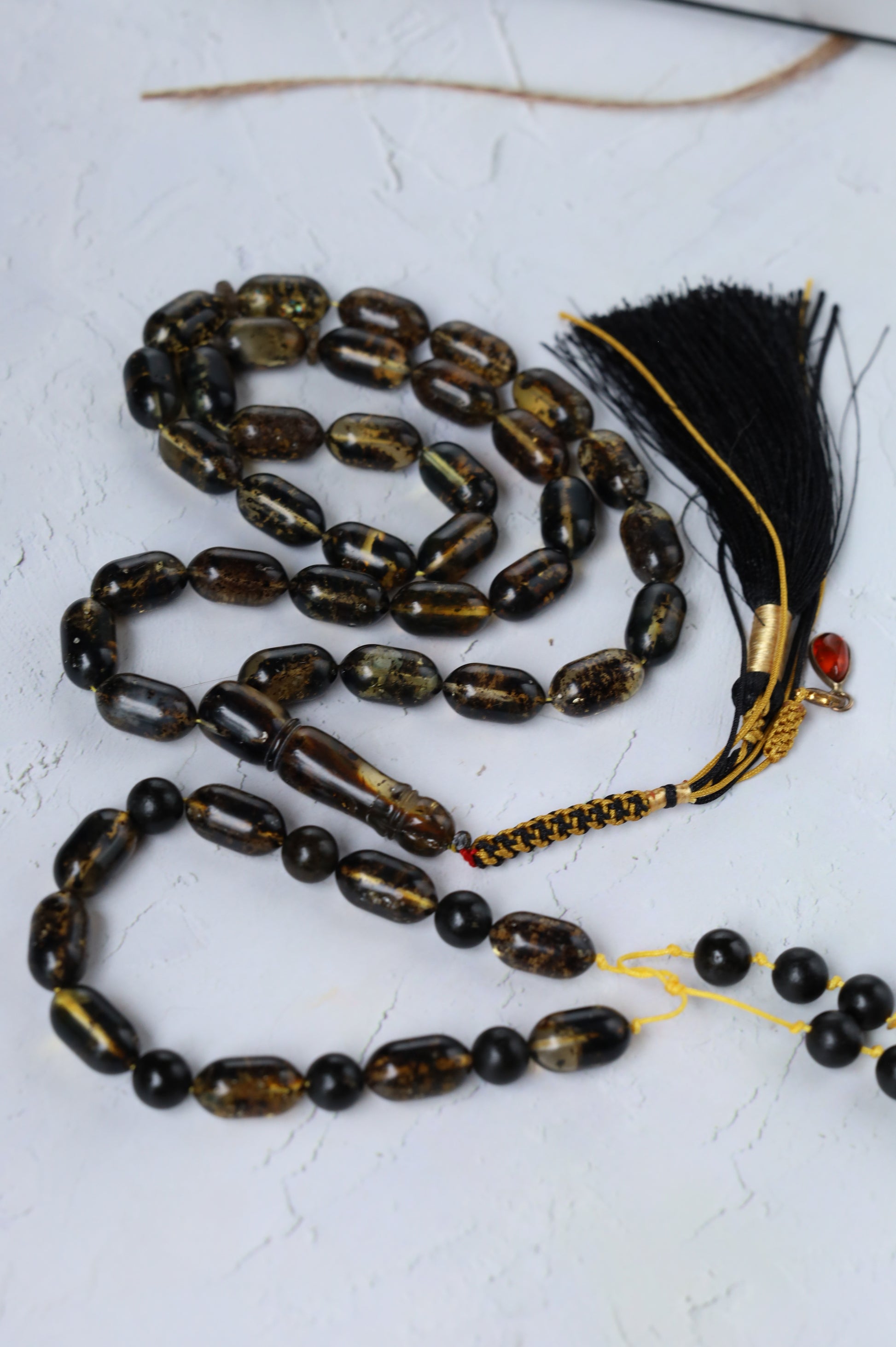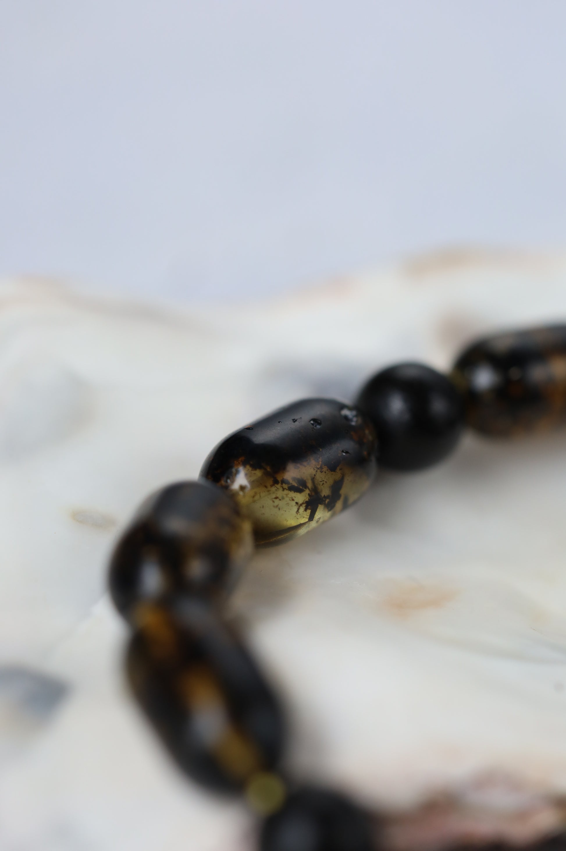 Designed as a cohesive set, the bracelet is color-matched to the rosary, revealing their true depth and contrast beautifully in natural light. The bracelet combines the same amber with black amber beads, partially covered with natural debris, adding texture and visual balance.