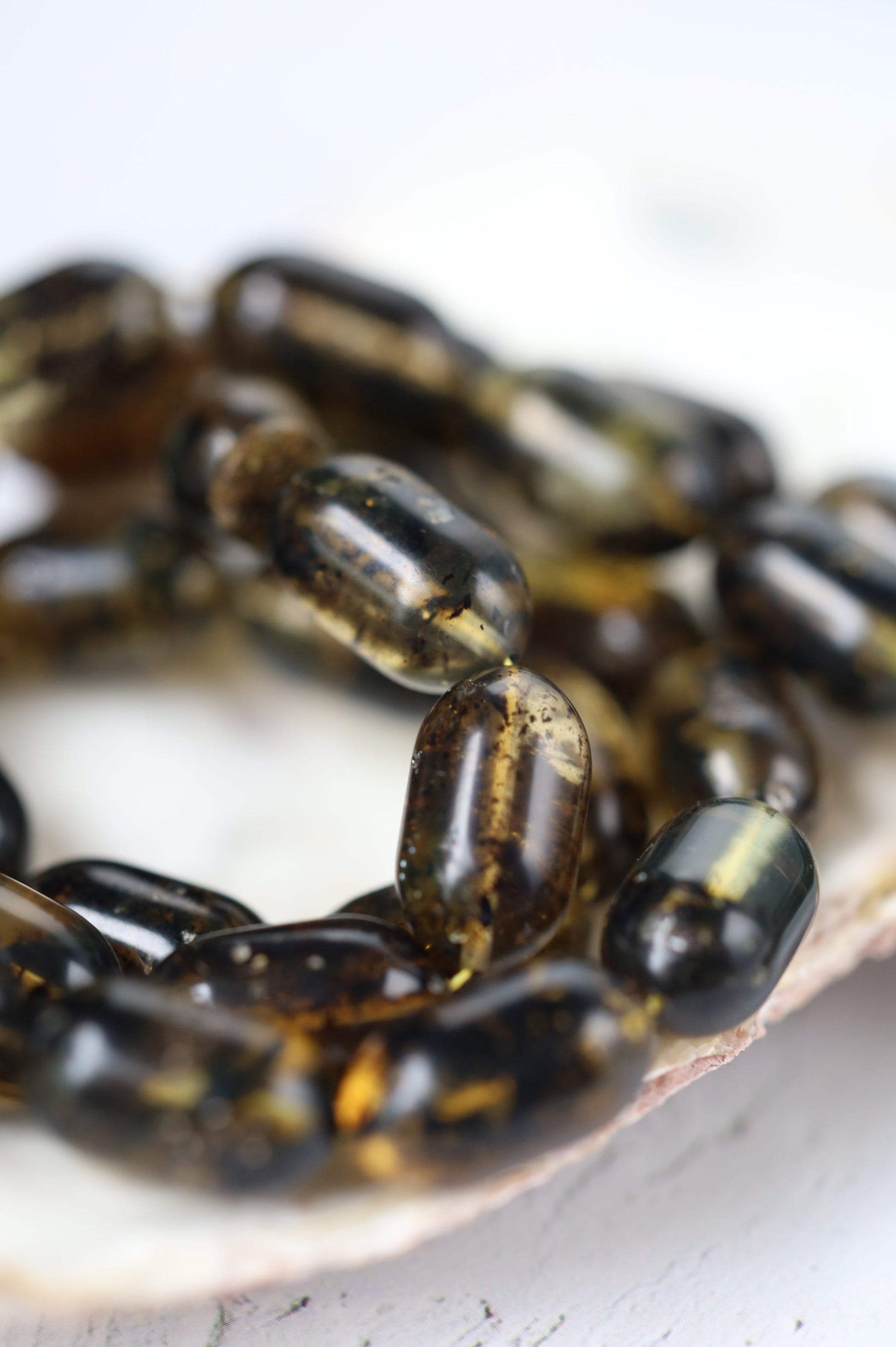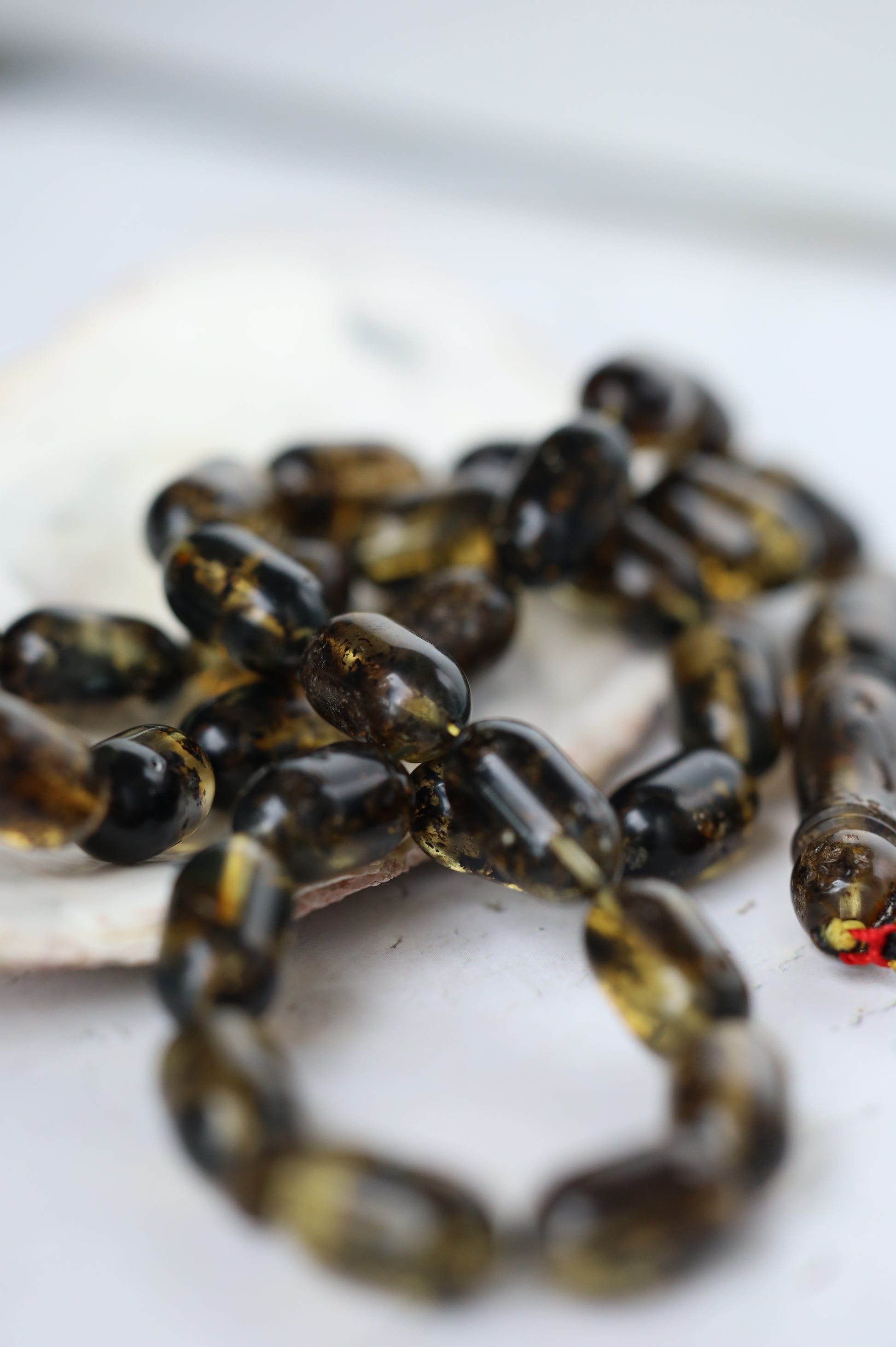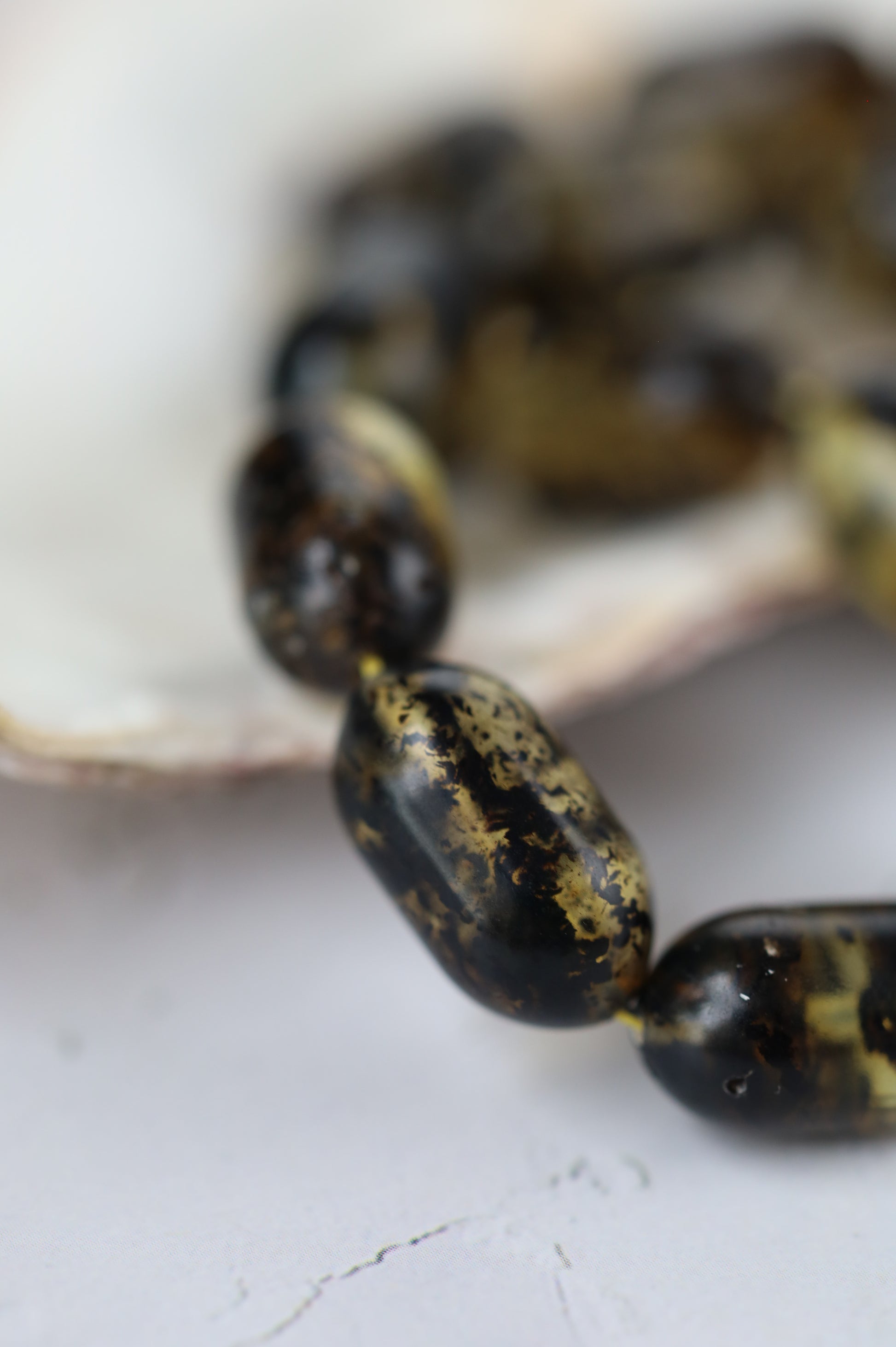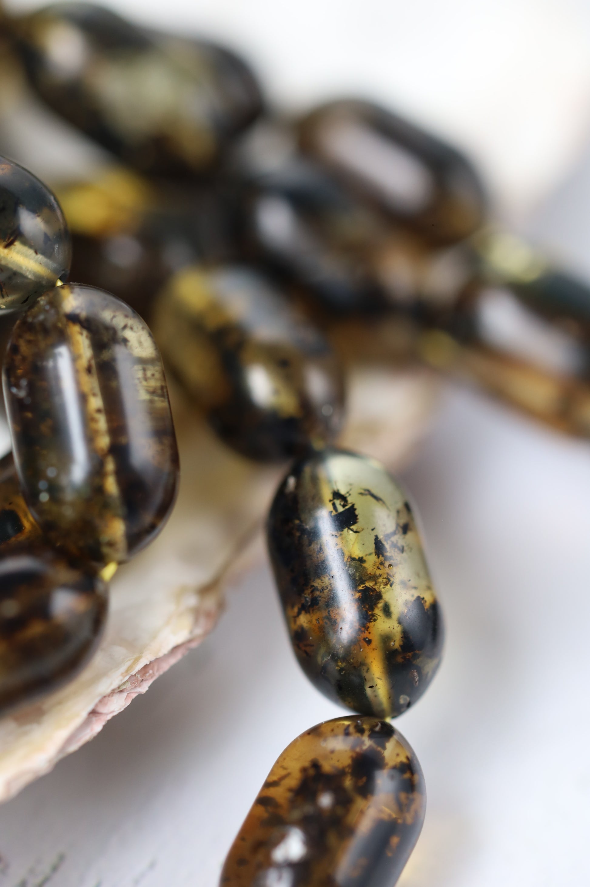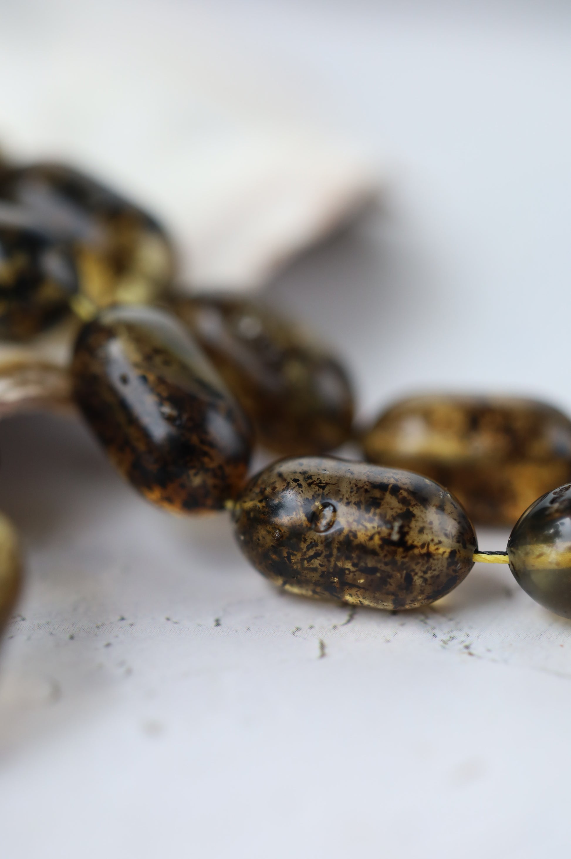 Designed as a cohesive set, the bracelet is color-matched to the rosary, revealing their true depth and contrast beautifully in natural light. The bracelet combines the same amber with black amber beads, partially covered with natural debris, adding texture and visual balance.